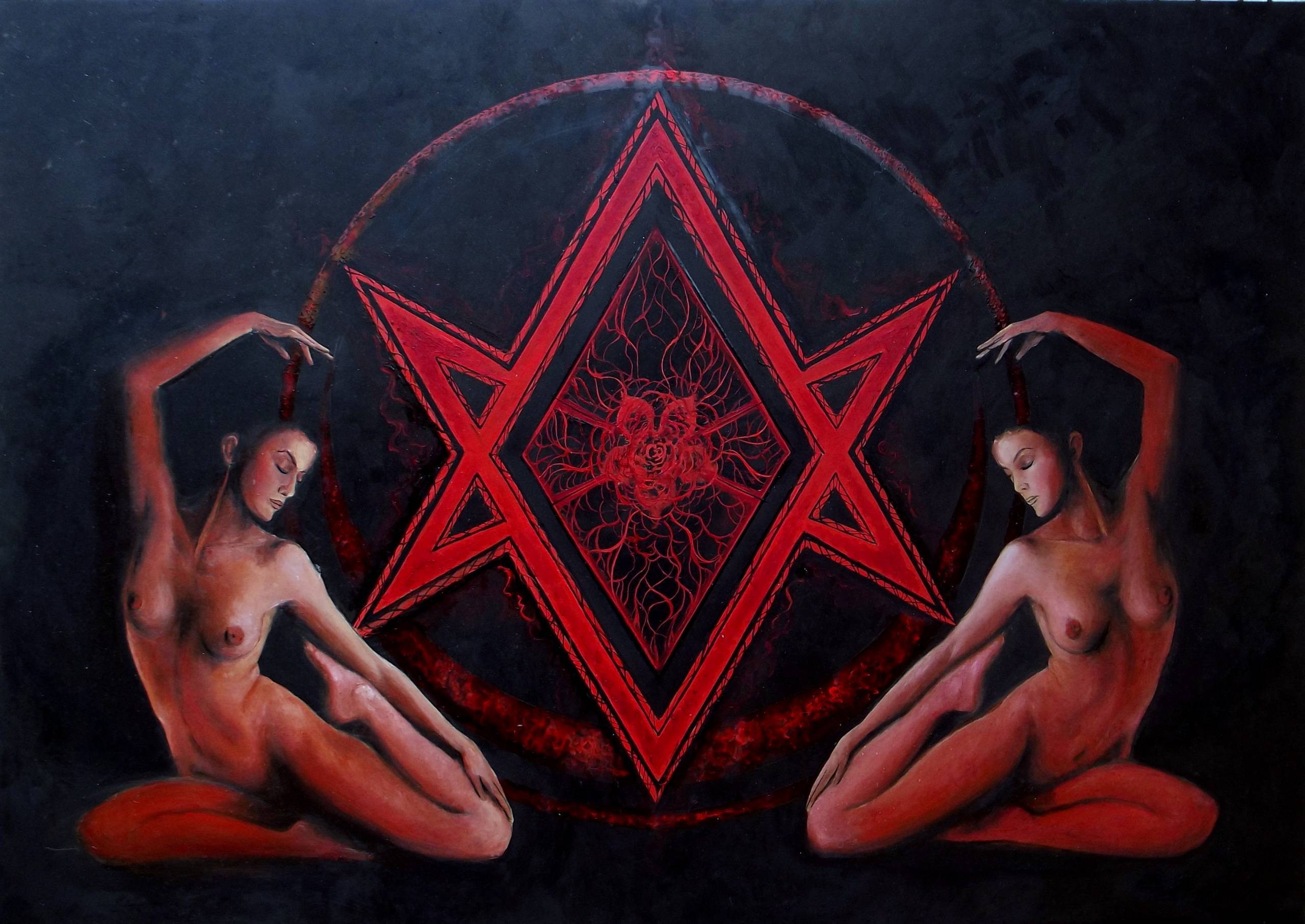 Obraz emanuje tajemniczością i hipnotyzującą energią. Centralnym elementem jest czerwona geometria, przypominająca gwiazdę i romb, otoczona zawiłym wzorem. W tyle dominuje głęboka czerń, która podkreśla intensywność czerwieni. Po obu stronach widzimy postacie kobiet w zmysłowych, baletowych pozach. Ich skóra jest oświetlona ciepłym, czerwonym połyskiem, co nadaje im niemal nadprzyrodzony charakter. Całość sprawia wrażenie, jakbyśmy zaglądali do innego wymiaru. Atmosfera jest jednocześnie pełna napięcia i harmonii. Czuć magię, jakby za moment miała się wydarzyć jakaś historia. Artysta używa kontrastu kolorów, by skupić uwagę na każdym detalu. Technika jest precyzyjna, niemal chirurgiczna, a jednak obraz ma w sobie fluid spontaniczności. No i te postacie! Wyglądają jakby zaraz miały zatańczyć. Obrazu można odbierać różnie. Jedni poczują w jego obecności spokój, inni pewne niepokoje. Dla mnie to jak patrzenie w kalejdoskop emocji. Jako dziecko pewnie bym powiedział: "To wygląda jak tajemniczy quiz!" Te czerwone elementy przykuwają wzrok niczym magic spell, zachęcając do zanurzenia się w tej złożonej kompozycji.