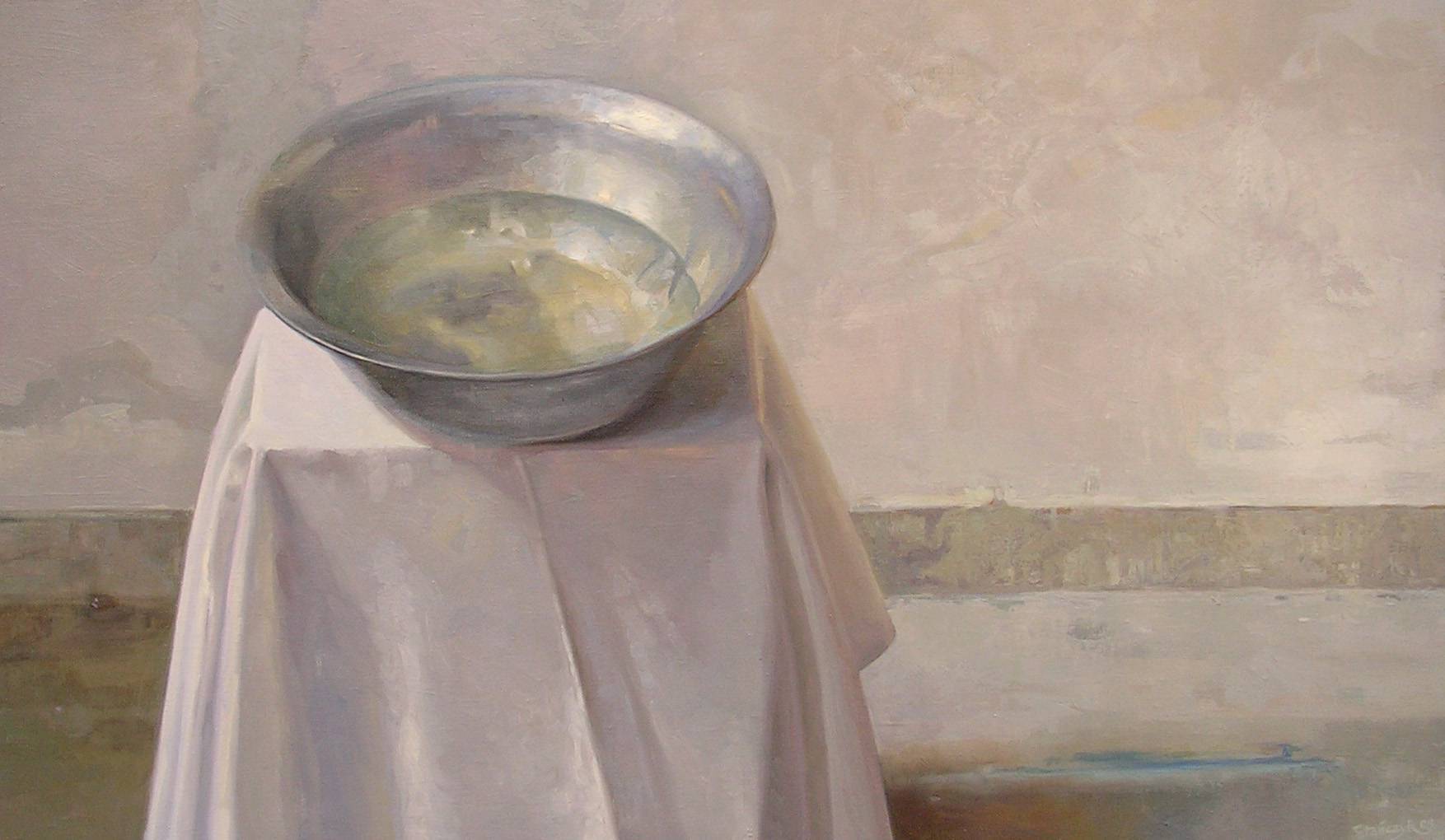 Obraz przedstawia prostą, ale wymowną scenę. Na pierwszym planie widać metalową miskę, pełną lustrzanych odbić, która stoi na białym, aksamitnym materiale. Brzegi miski delikatnie połyskują w świetle, które zdaje się przenikać przez spokojną, pastelową paletę. Dominują tu odcienie szarości, beżu, z delikatnymi muśnięciami bladego różu. Tło jest stonowane, co dodaje pracy elegancji i skupienia się na centralnym motywie. Atmosfera obrazu jest spokojna i kontemplacyjna. Patrząc na ten obraz, można poczuć ciszę pustego pomieszczenia. Styl przypomina klasyczne martwe natury, gdzie artysta użył precyzyjnych pociągnięć pędzla, aby oddać grę światła i cienia. Miska wygląda na tak autentyczną, że niemal chciałoby się jej dotknąć, by poczuć chłód metalu. Może wywoływać różne emocje, od nostalgii po dziwną ciekawość. Dla dziecka mógłby to być po prostu obraz „miski na obrusie”, ale dorosły dostrzeże w nim harmonię i prostotę codzienności. To takie "calm" w formie obrazu.