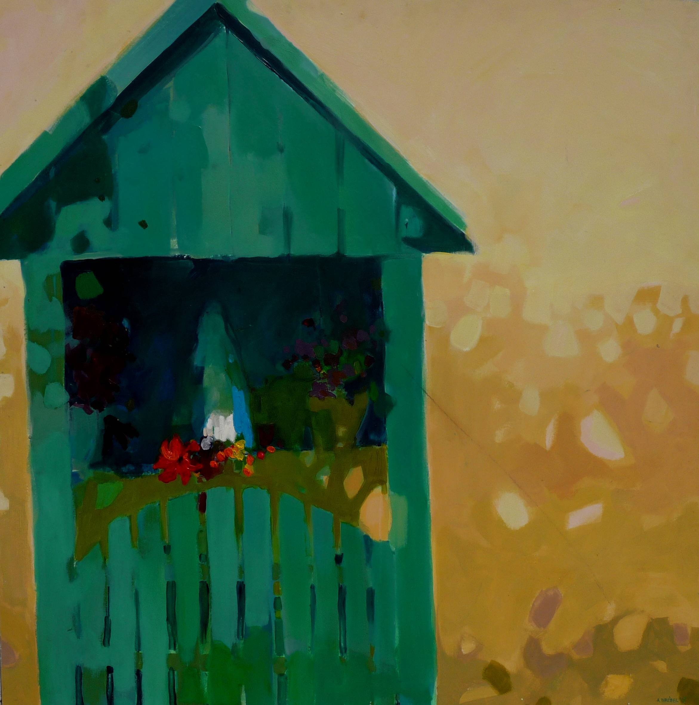 Na obrazie widzimy zieloną kapliczkę stojącą na tle złocistego, niemal rozmytego krajobrazu. Kolory są intensywne, a jednocześnie delikatne, jakby lekko rozmyte przez promienie słońca. Kapliczka zdaje się być centralnym punktem, a cienie i światło wokół niej tworzą aurę spokoju. Wewnątrz dostrzec można kwiaty i tajemniczą postać, co dodaje nuty ciekawości. Nastrój tego dzieła jest pełen nostalgic dream. Artysta operuje kontrastem barw, używa technik łączących dokładność z abstrakcją tła. Ta mieszanka sprawia, że obraz jest nie tylko wizualnie atrakcyjny, ale także emocjonalnie angażujący. Obserwator może poczuć się częścią baśniowego świata lub wrócić myślami do dzieciństwa, pełnego tajemniczych zakątków. A ja widzę tam mój domek dla lalek. Przykuła mnie także ta niezwykle subtelna gra świateł i cieni, bo daje wrażenie ruchu, jakby czas na chwilę się zatrzymał. Obraz ten może być interpretowany jako symbol odpoczynku duchowego czy refleksji nad prostym pięknem życia codziennego.