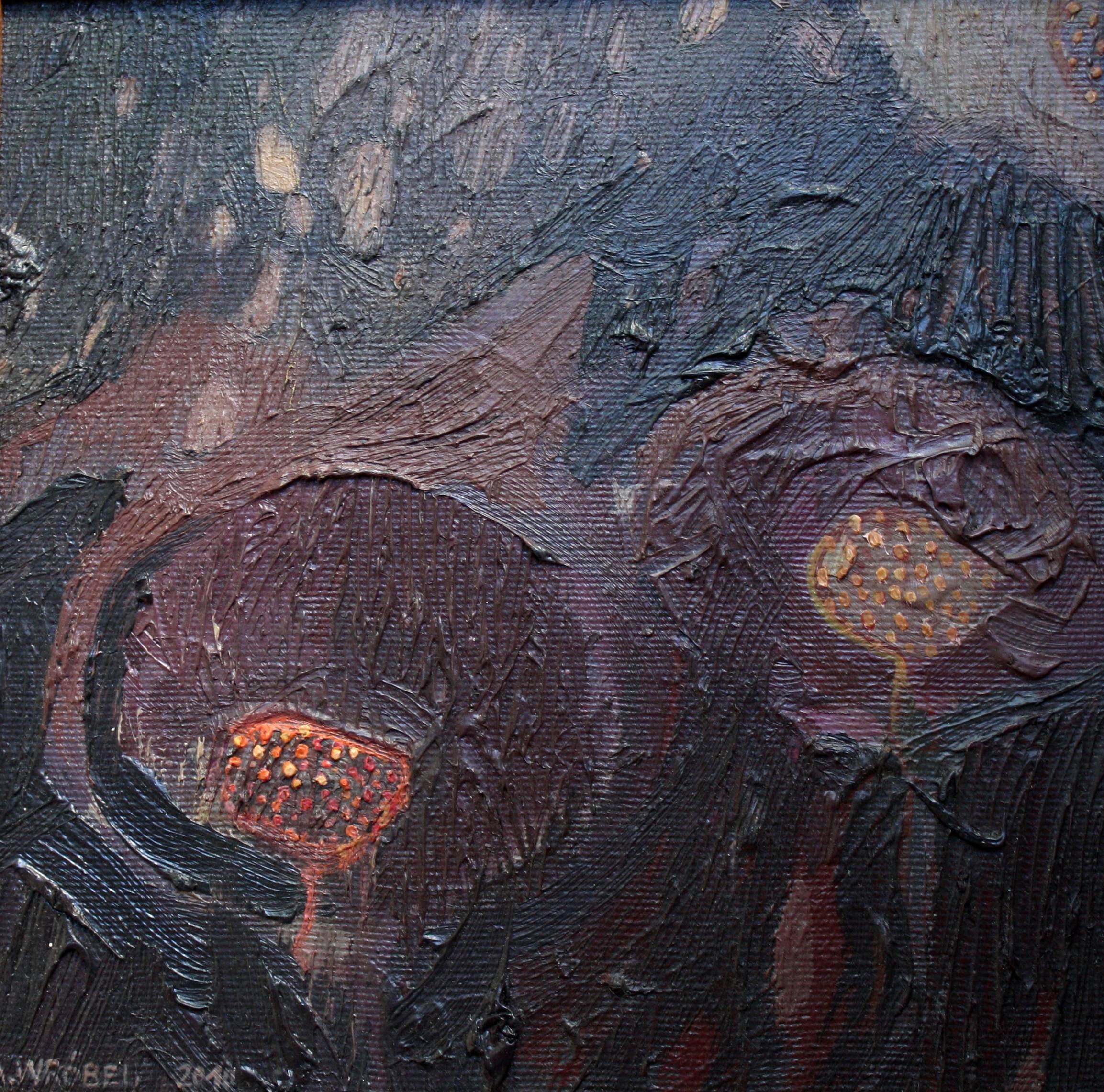 Obraz emanuje tajemniczą głębią, z przeważającymi ciemnymi odcieniami brązu i fioletu, które układają się w nieregularne formy. Grube, impastowe pociągnięcia pędzlem tworzą wypukłą powierzchnię, dając uczucie materii namacalnej i pełnej dynamiki. Kształty są niejasne i przypominają organiczne formy, jakby skrywały sekrety natury. Ciepłe, złote i pomarańczowe plamy pojawiają się czasem, jak małe skarby ukryte w mroku. Atmosfera tego dzieła jest zagadkowa, niemalże melancholijna. Mroczny nastrój może wywoływać refleksje nad tajemnicą wszechświata. Artysta wykorzystał technikę impastu, co dodaje dziełu tekstury i głębi. Możesz poczuć, jakbyś mógł dotknąć tych kolorów i poczuć ich fakturę pod palcami. Uczucie to, oraz enigmatyczny styl, sprawiają, że widz może się zastanawiać: co artysta miał na myśli? Obraz wprowadza nutkę niepokoju, jakby odwieczna ciemność ukrywała coś istotnego. I to jest właśnie "mystery", które wciąga widza coraz głębiej. Hej, a te wszystkie kolory są jak plamy z farby na moich ulubionych spodniach! To dzieło inspiruje do odkrywania nieznanego i eksplorowania emocji ukrytych w cieniu.