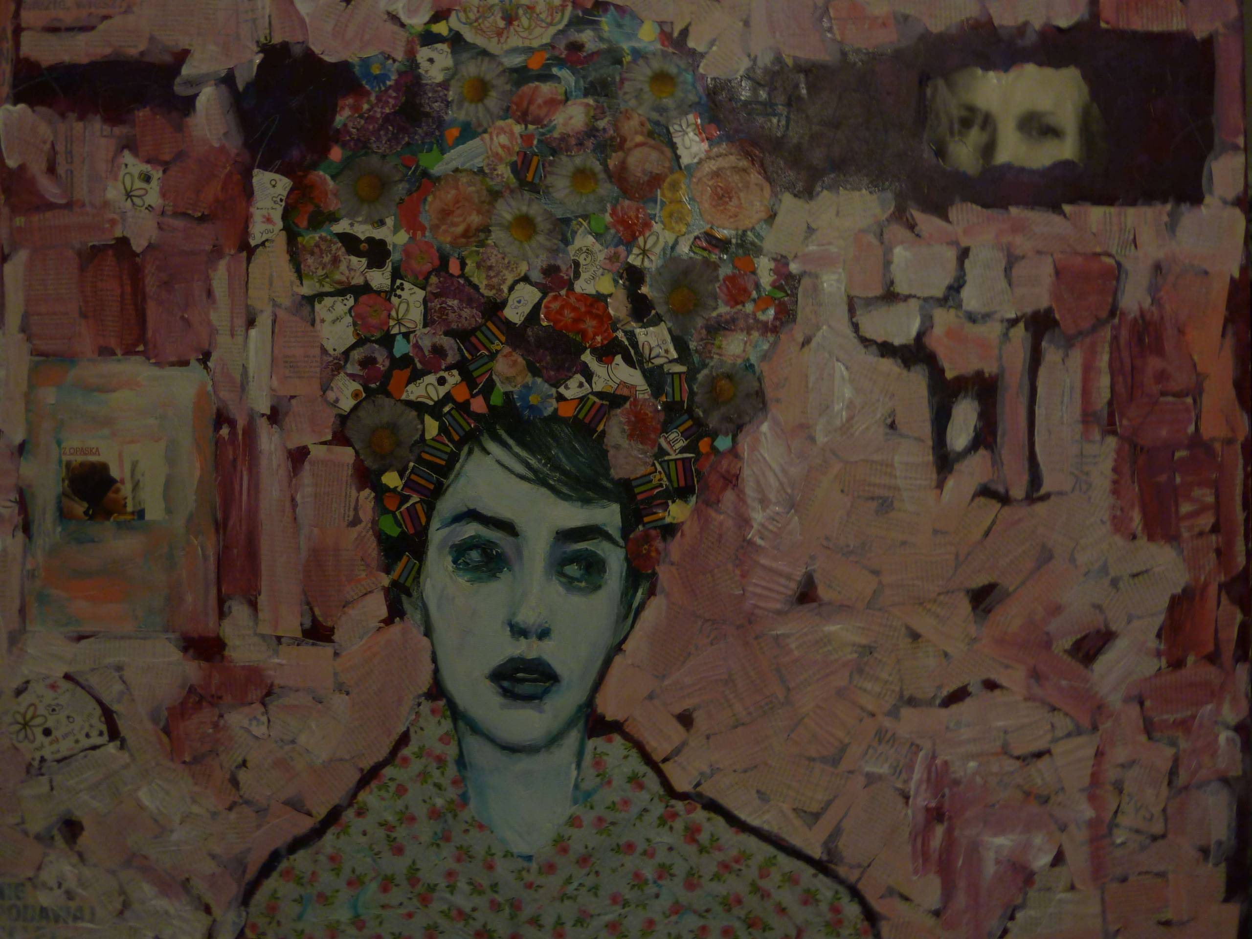 W tej pracy zaistniało kilka motywów, które lubię - kolaż łączony z akrylem, postać kobiety, połączenie purpury i różu i coś co może być kapeluszem albo metaforą.