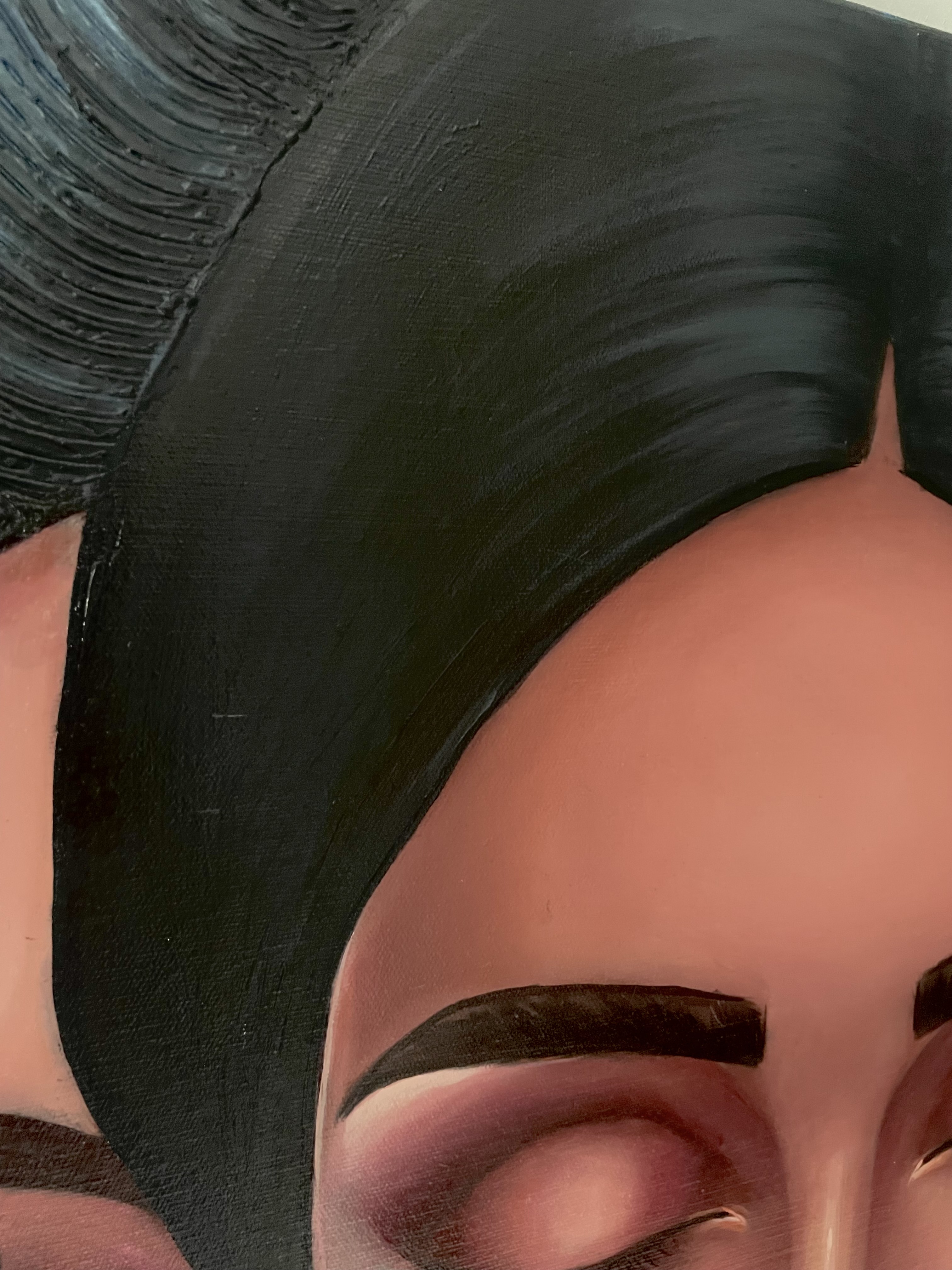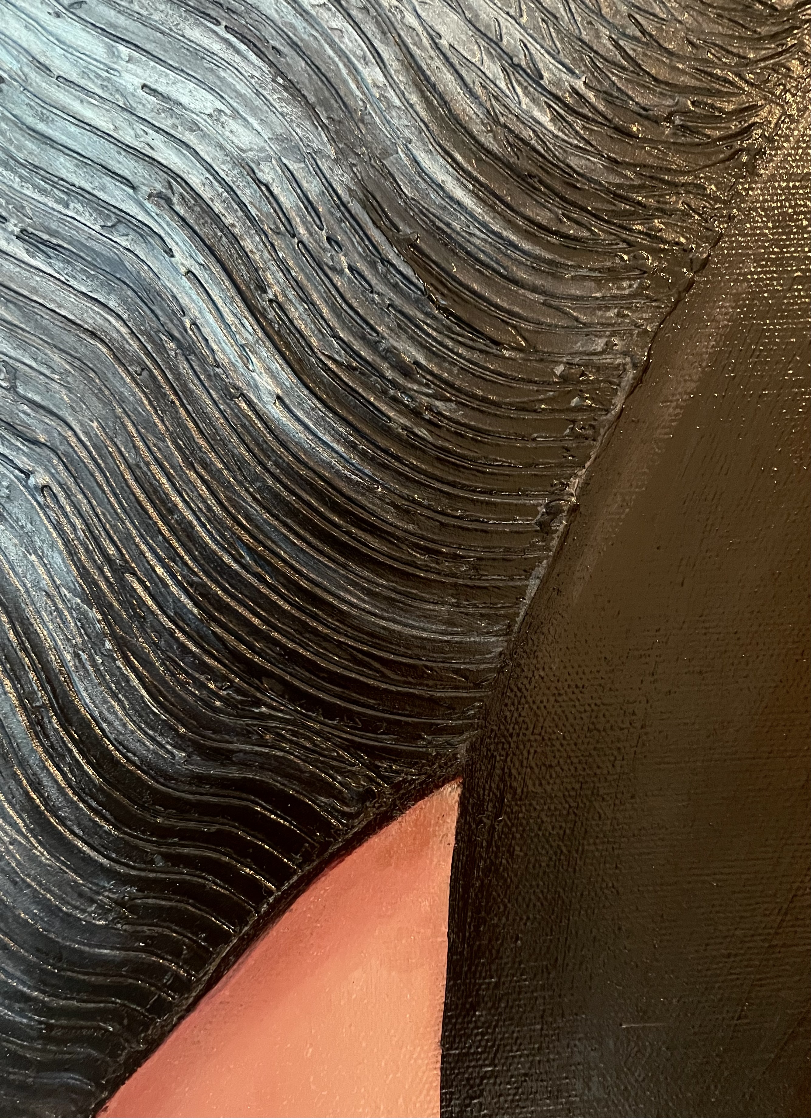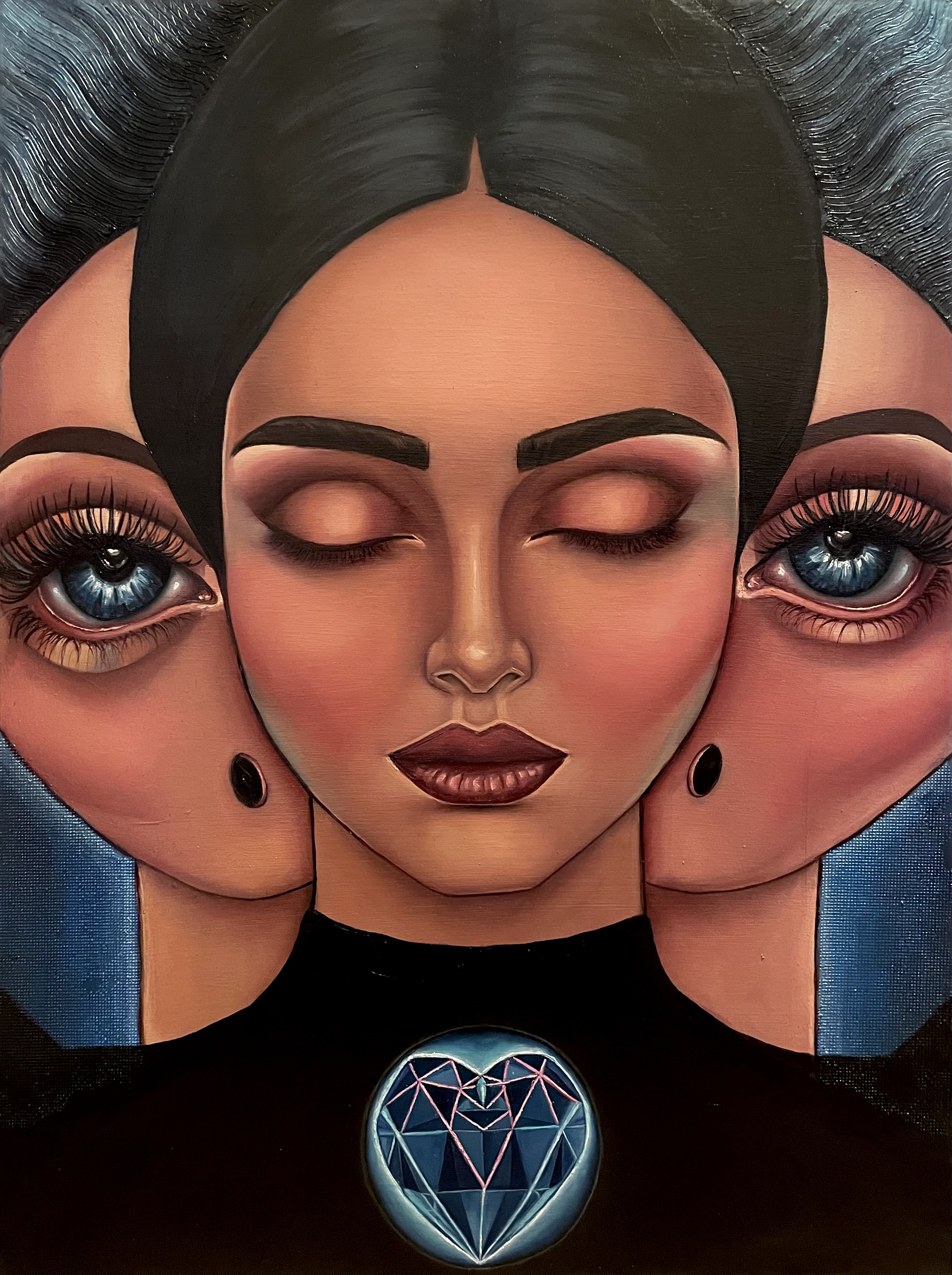 Obraz jest refleksją nad złożonością tożsamości i napięciem między wnętrzem a tym, co widoczne na zewnątrz. Centralna postać symbolizuje spokój i introspekcję, podczas gdy otaczające twarze odnoszą się do sposobu, w jaki jednostka bywa postrzegana przez innych. Geometryczne, krystaliczne serce nawiązuje do jednoczesnej siły i kruchości emocji oraz wielowymiarowości prawdy