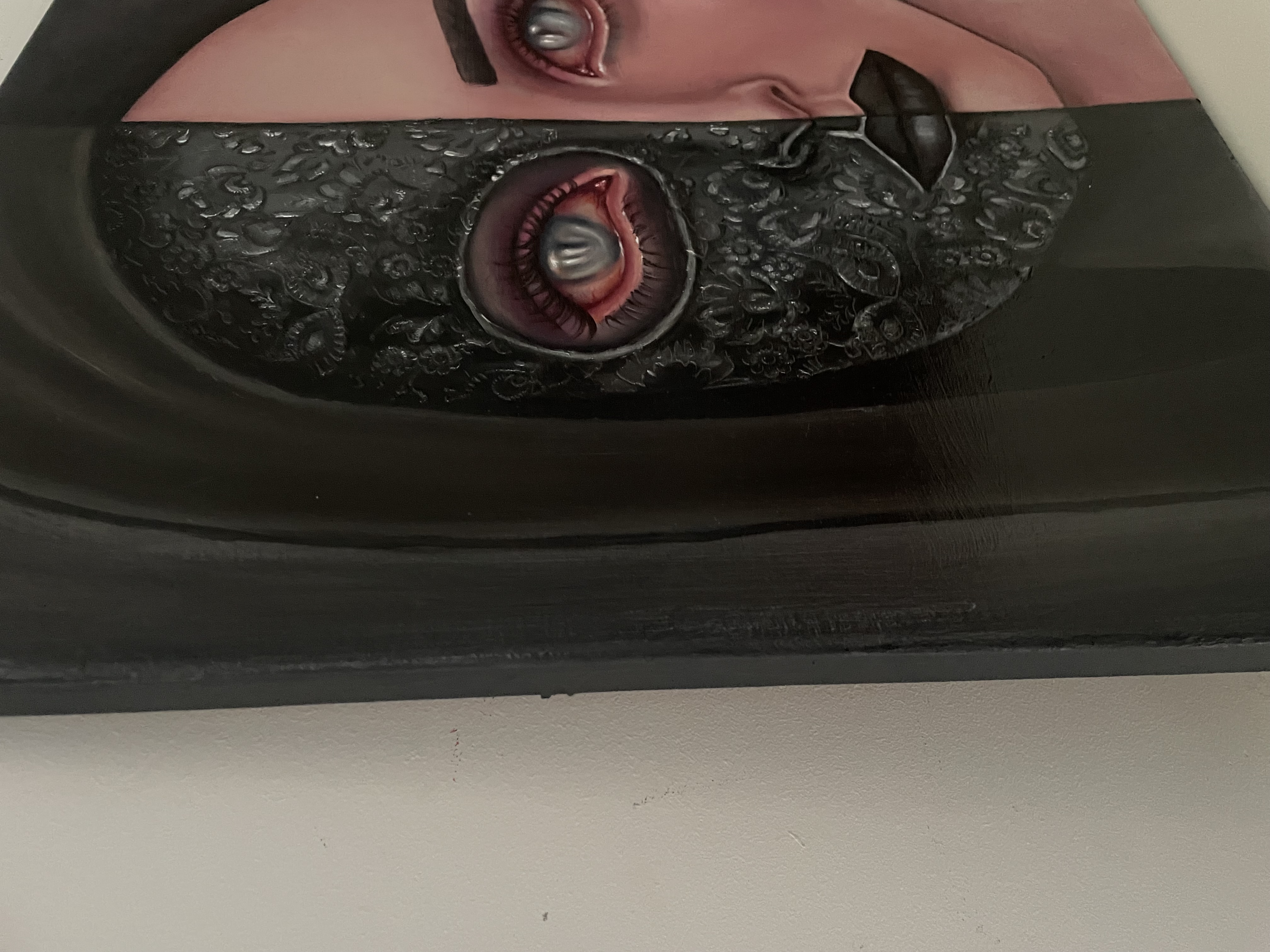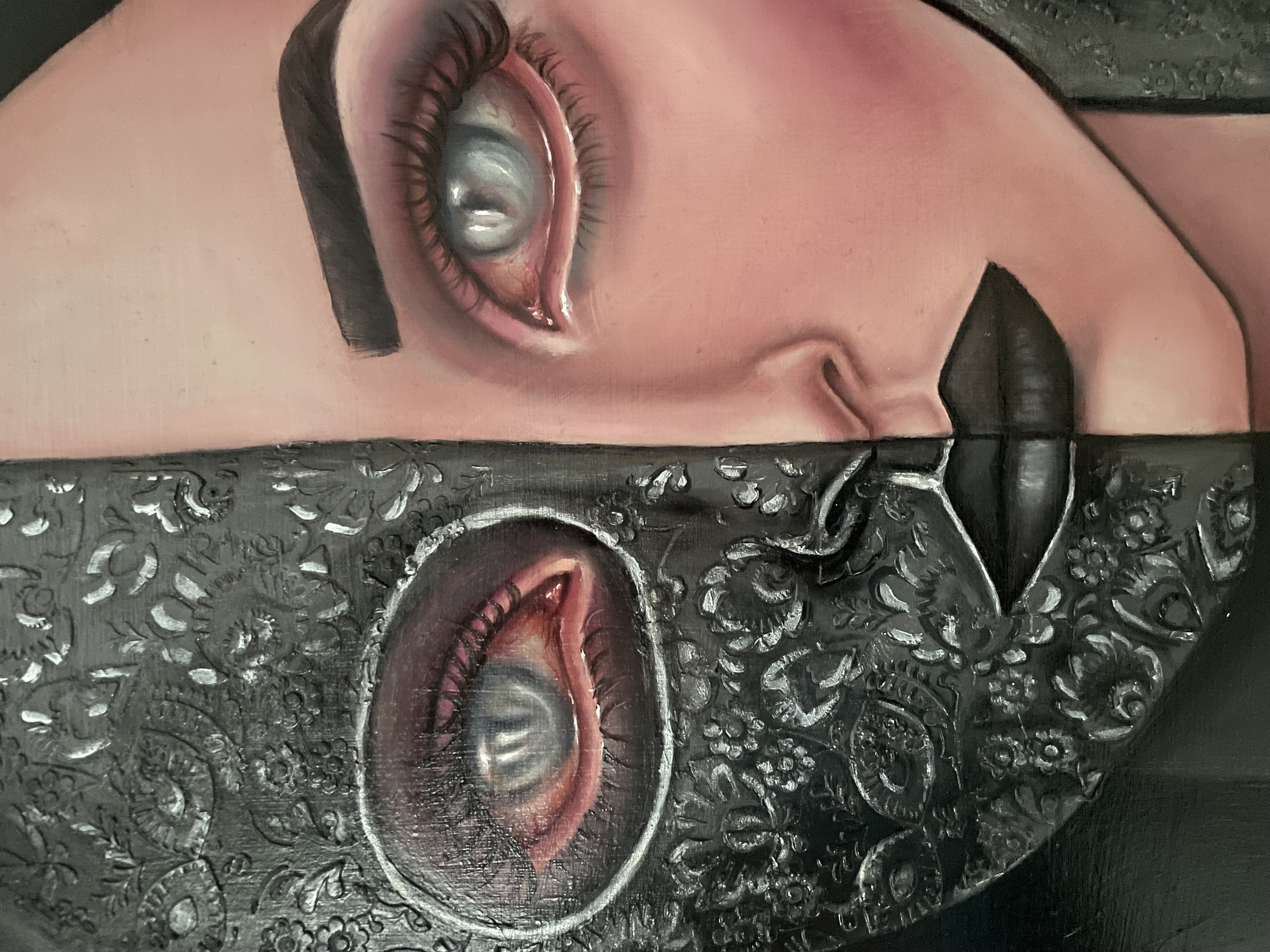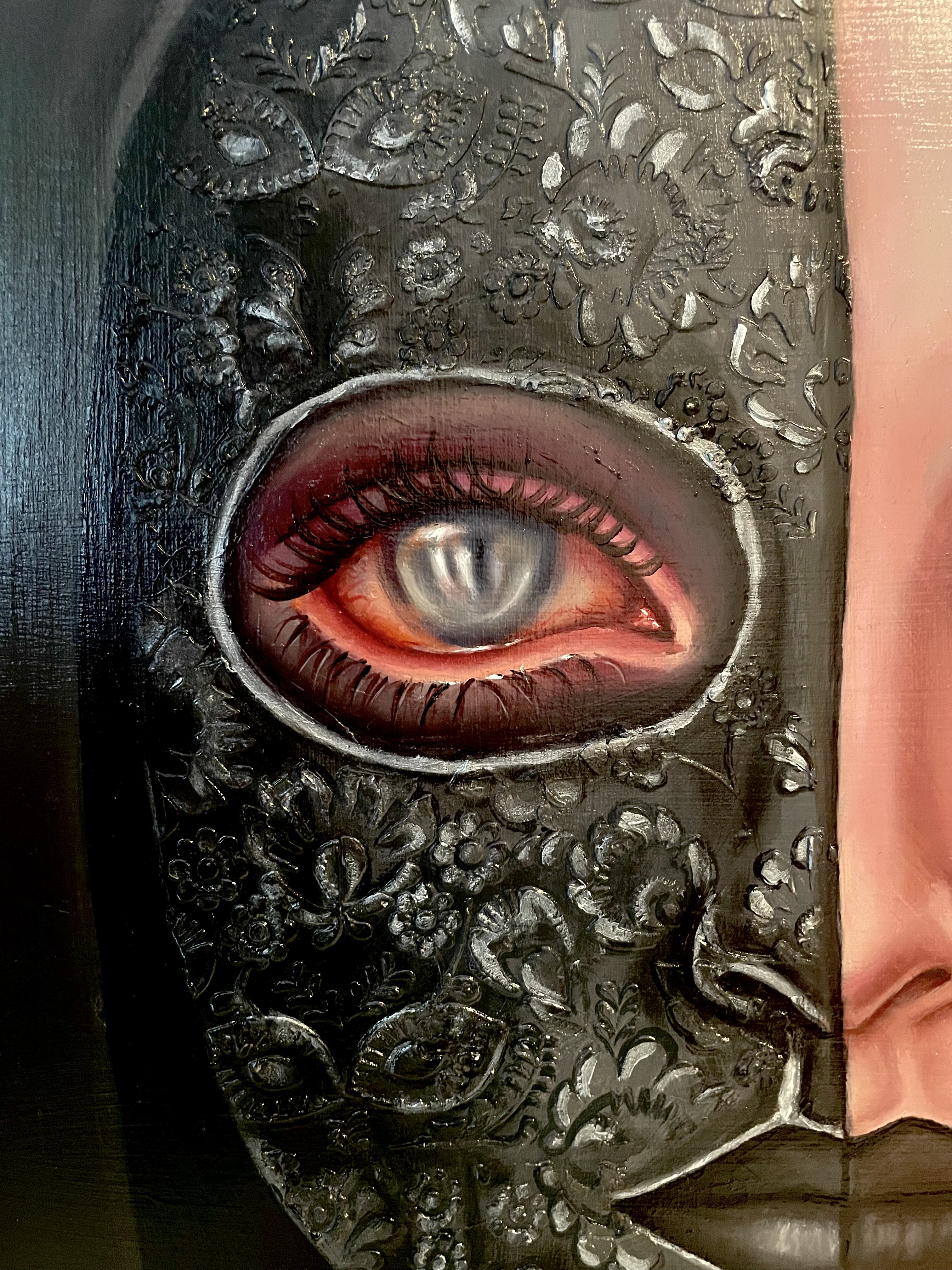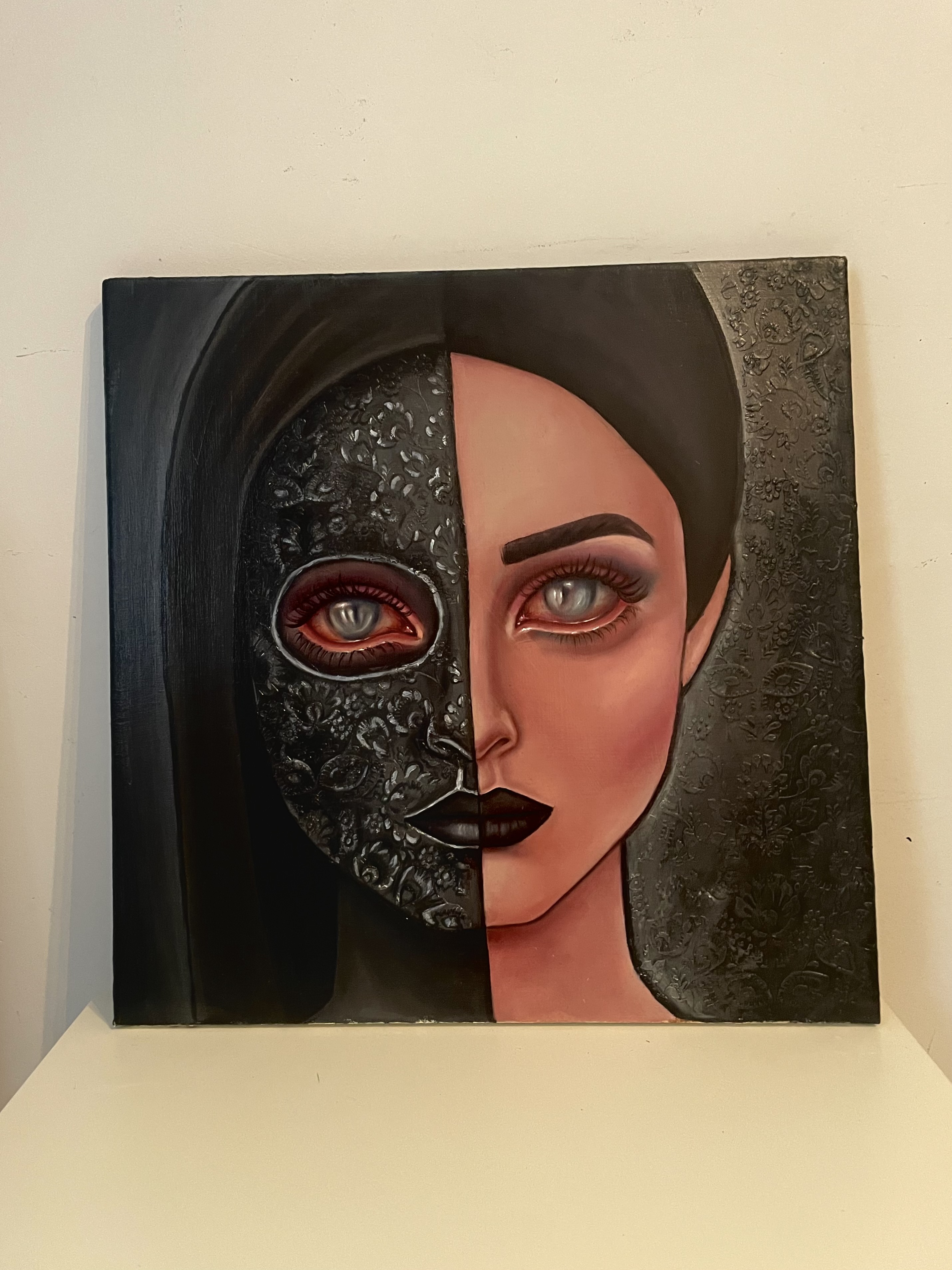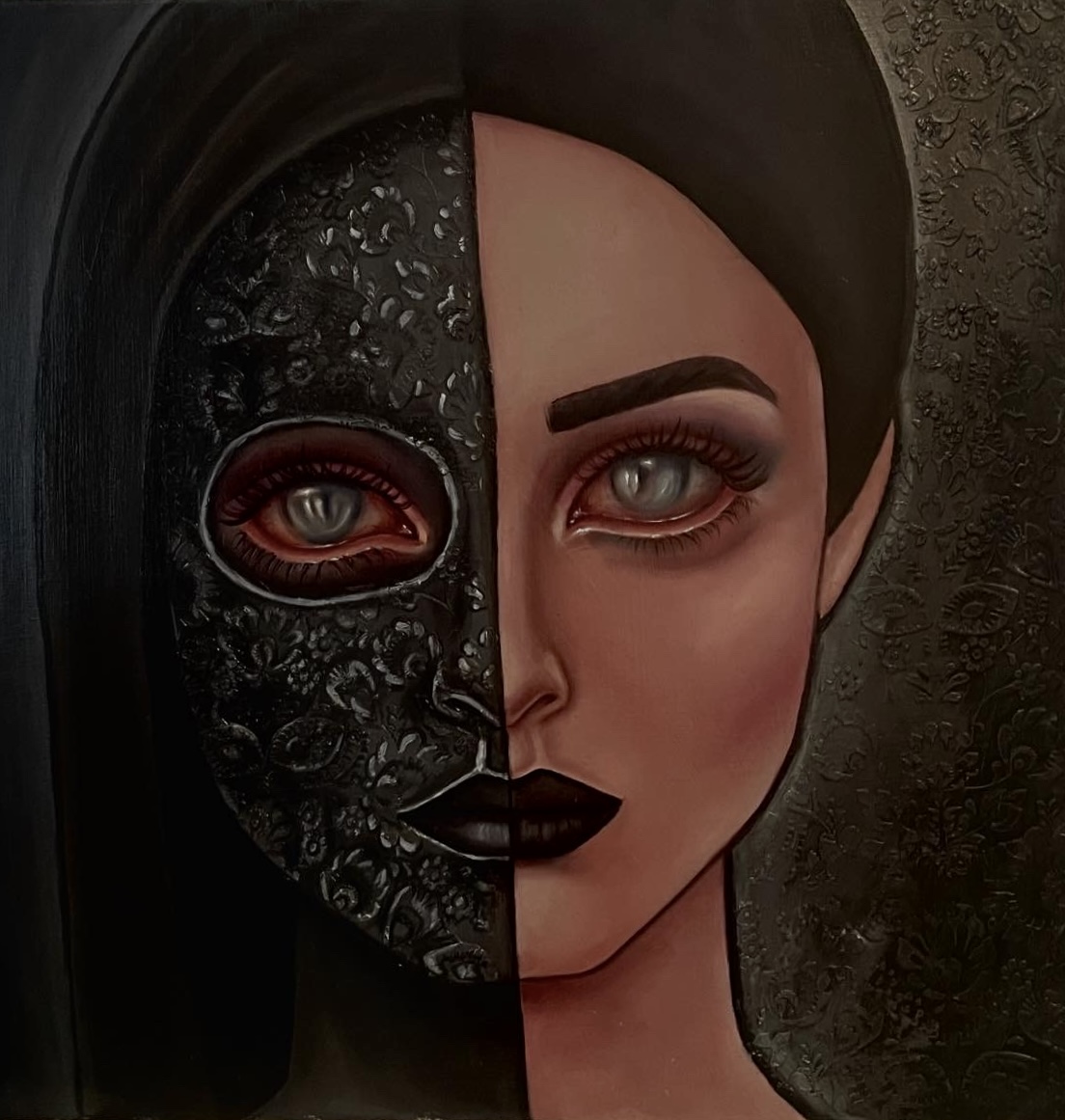 "Veil of Truth" to refleksja nad uczciwością wobec innych i wobec samego siebie oraz nad tym, co decydujemy się ujawnić, a co pozostaje ukryte. Podzielona twarz symbolizuje napięcie między odsłonięciem a ochroną, jedną stronę bezpośrednią i wrażliwą oraz drugą skrytą za maską, pełniącą funkcję ochronną. Oczy łączą oba oblicza, sugerując, że prawda często istnieje pomiędzy tym, co widoczne, a tym, co zakryte, i że obie te sfery mogą współistnieć.