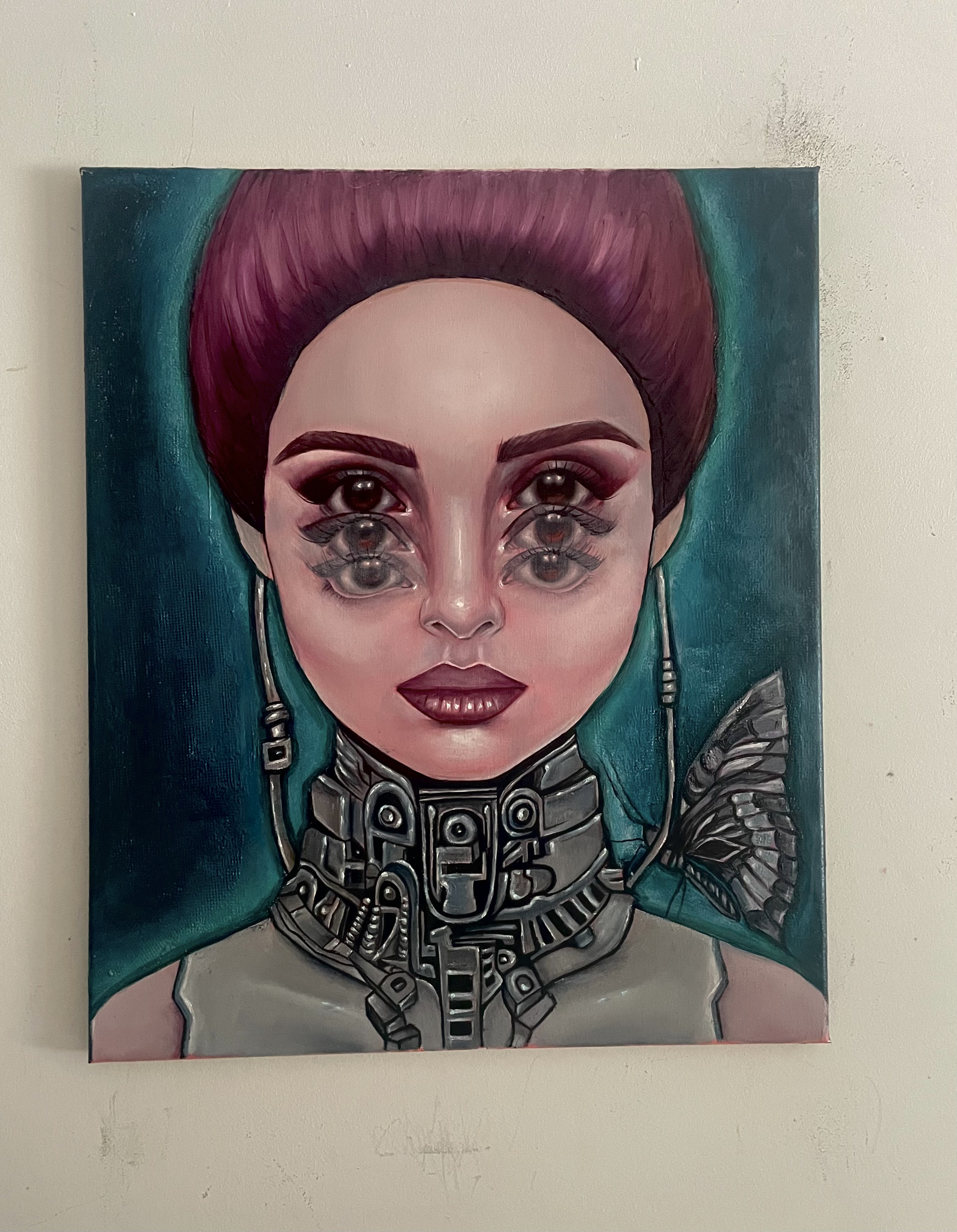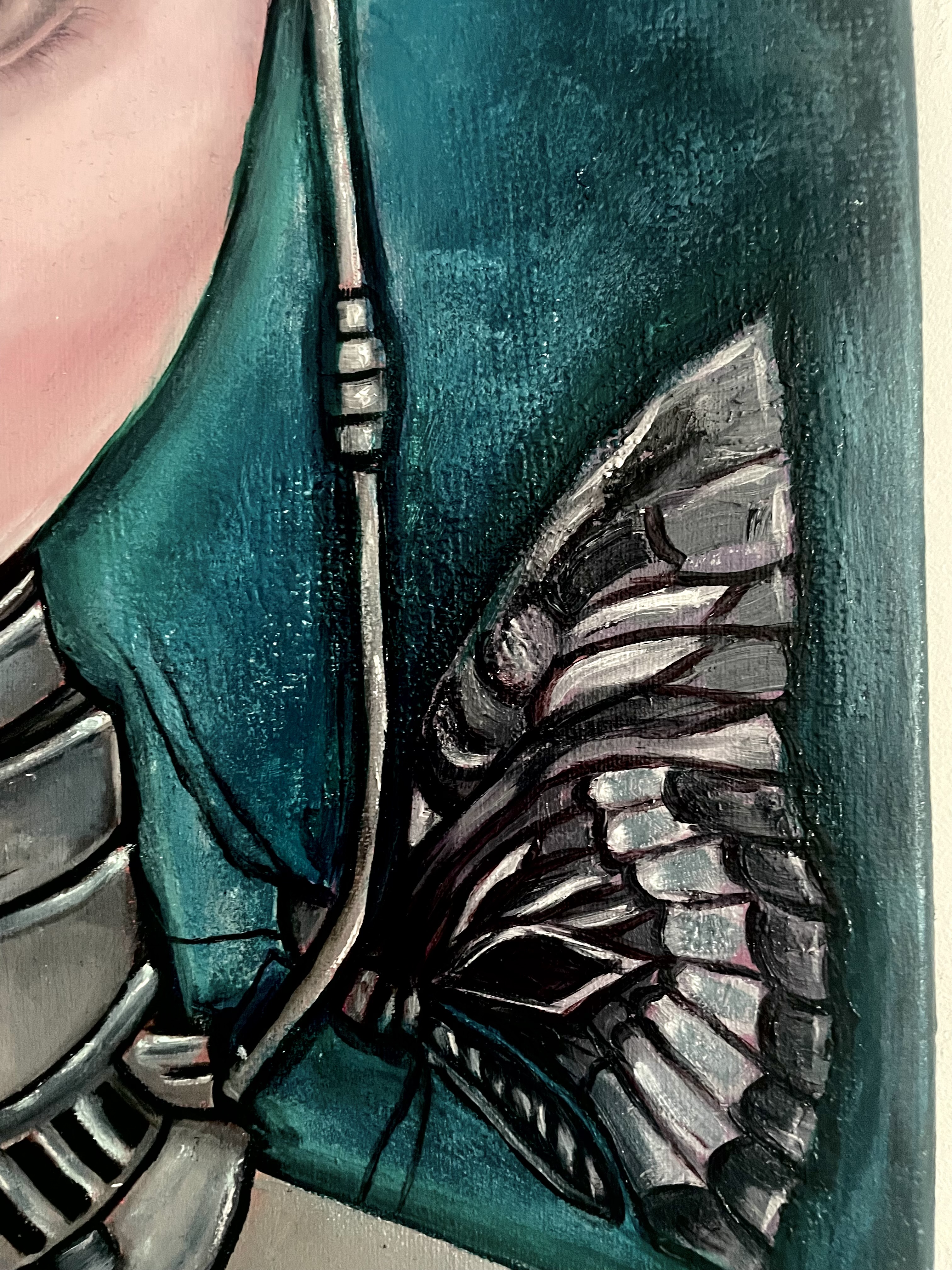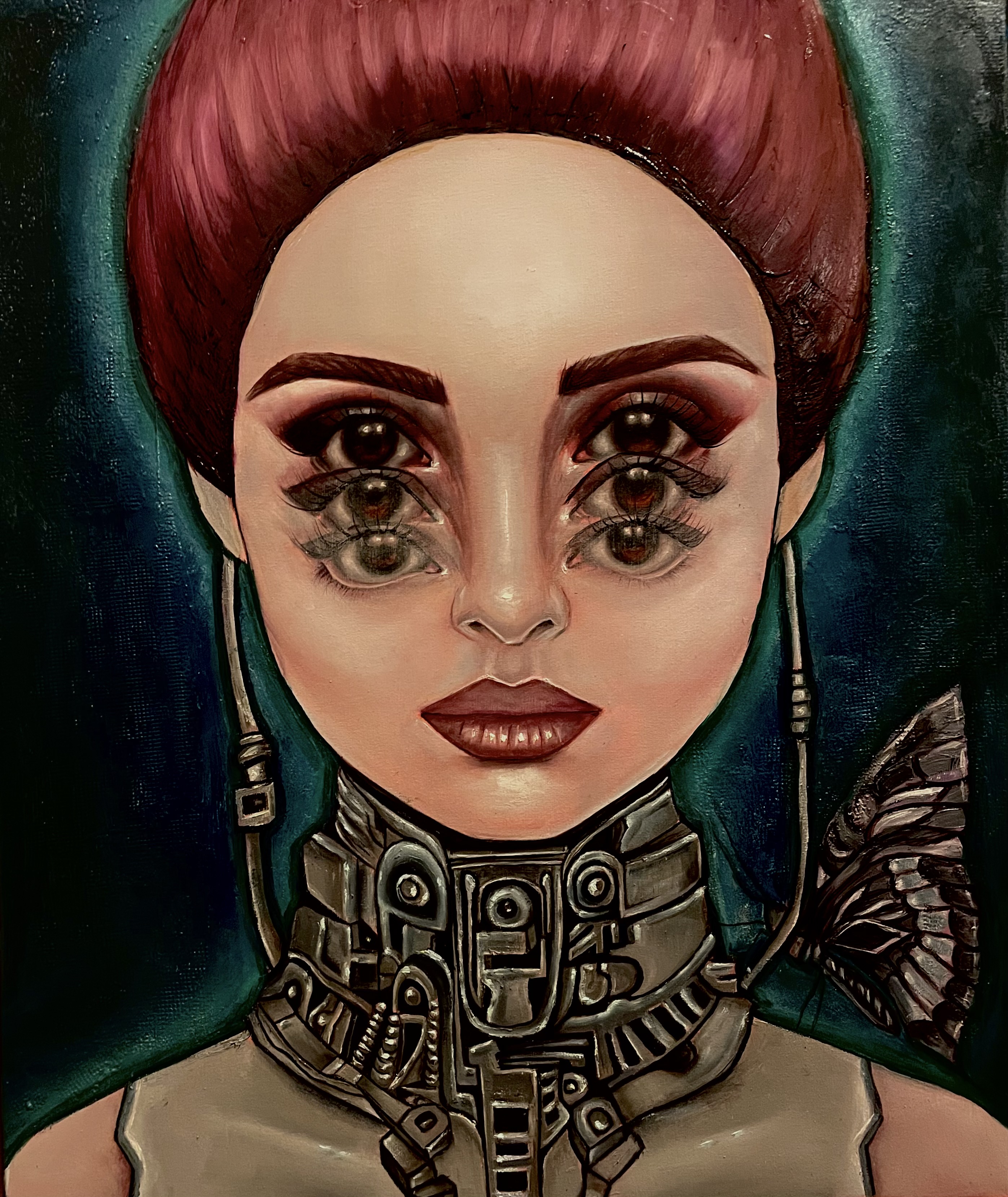 Portret kobiecej, częściowo mechanicznej postaci inspirowany estetyką science fiction. Zniekształcona percepcja, technologiczne elementy oraz motyw motyla pozbawionego koloru tworzą subtelne odniesienie do transformacji i utraty wrażliwości. Stonowana, chłodna paleta barw podkreśla dystans między naturą a sztuczną formą istnienia.