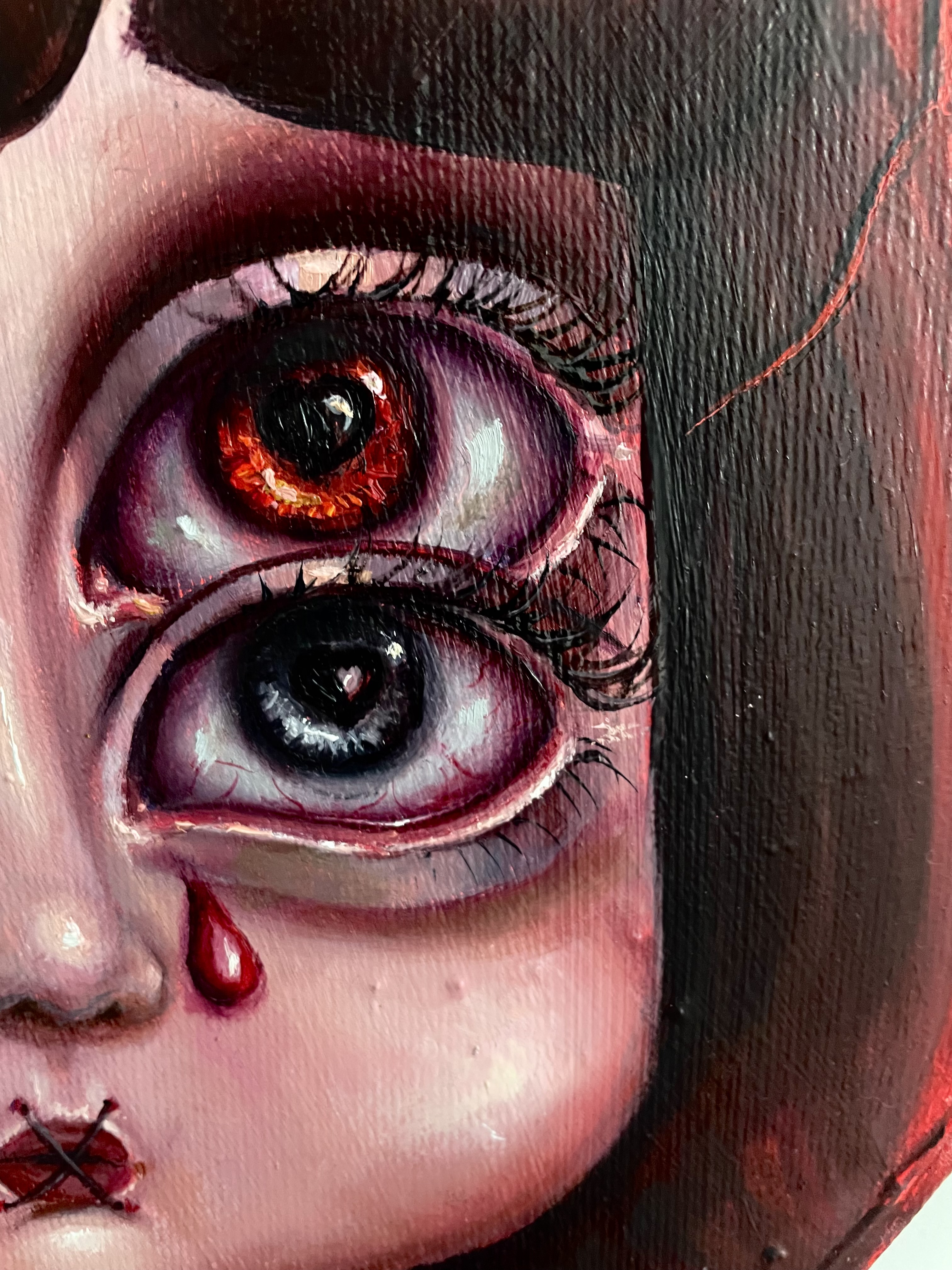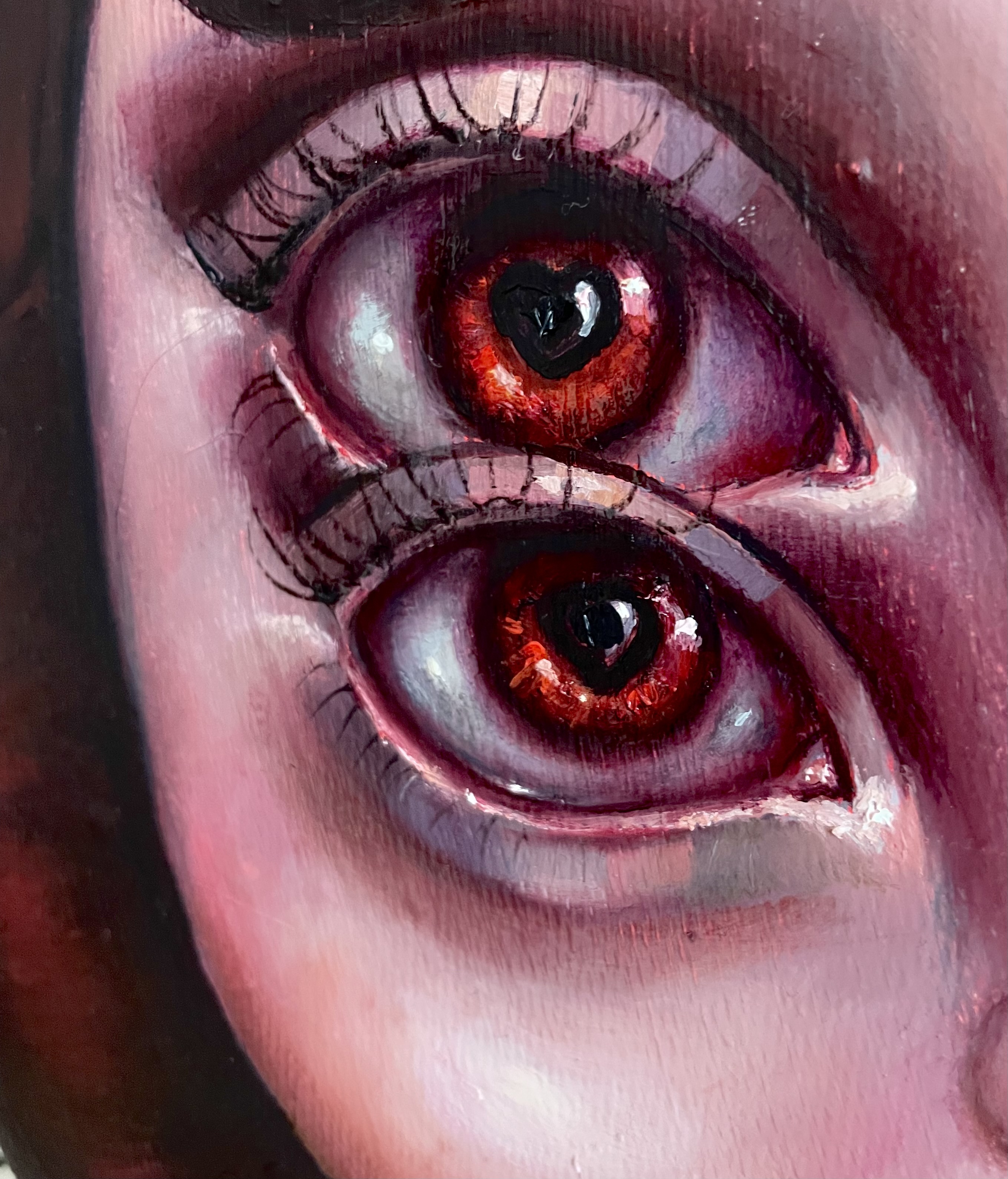 Surrealistyczny portret dziewczęcej postaci w formie serca. Wielokrotne oczy, zszyte usta oraz ograniczona paleta czerwieni i czerni tworzą symboliczny obraz emocjonalnej kruchości, ciszy i wewnętrznego napięcia. Praca łączy estetykę mrocznego realizmu z elementami symbolizmu.