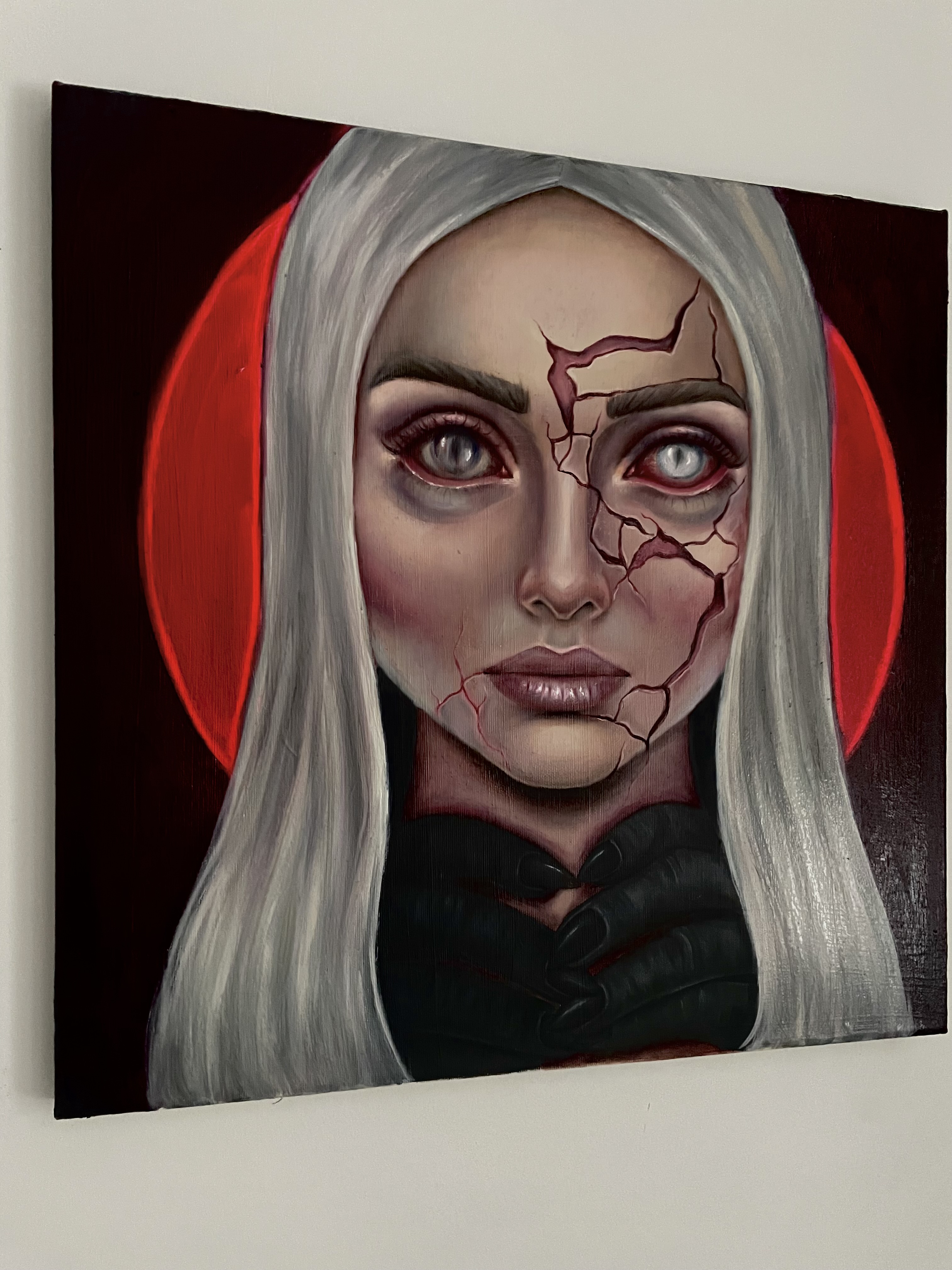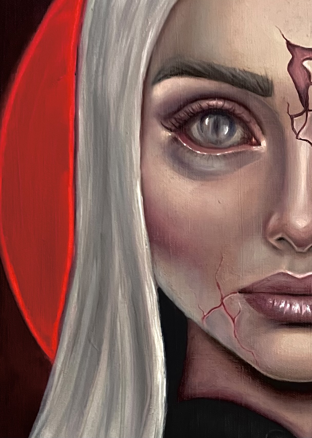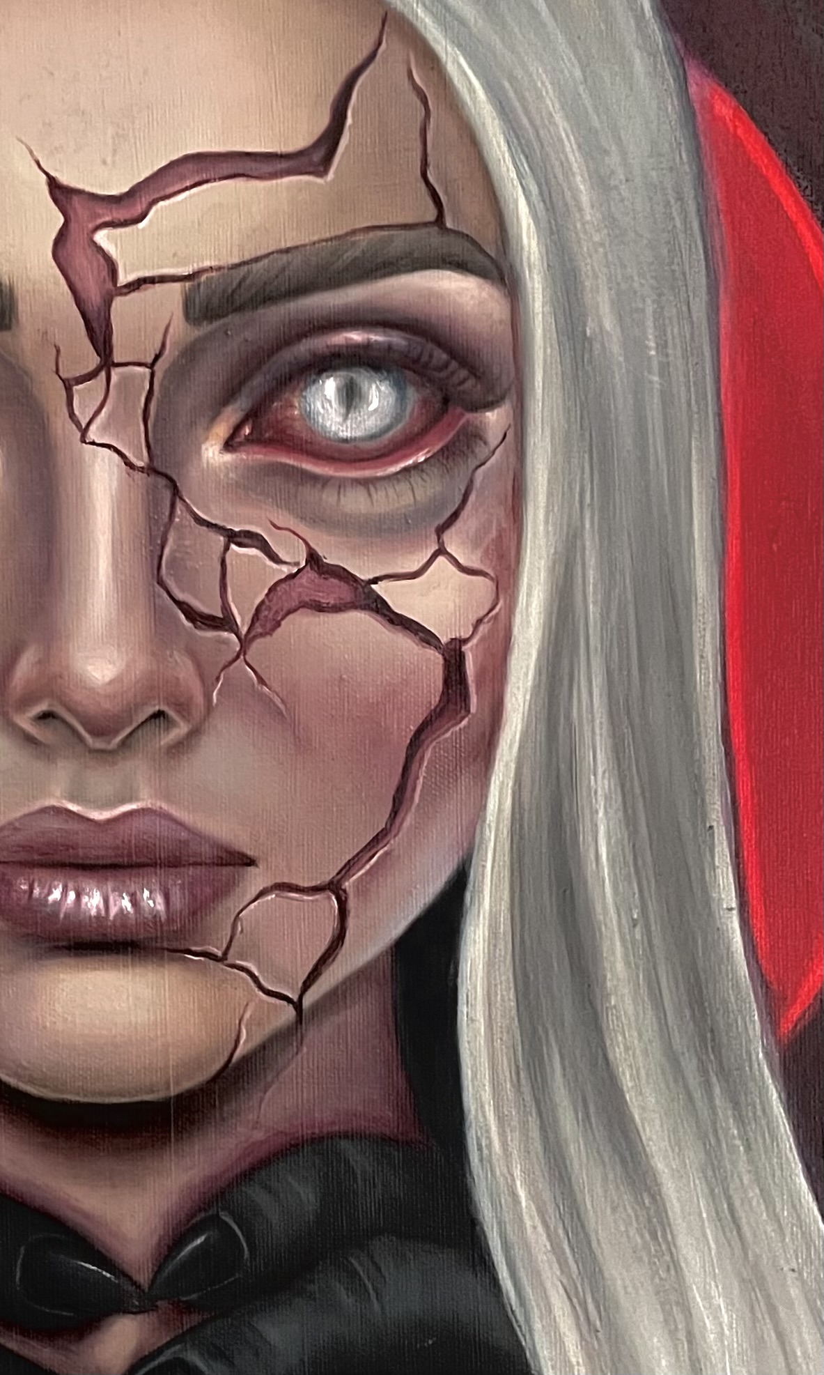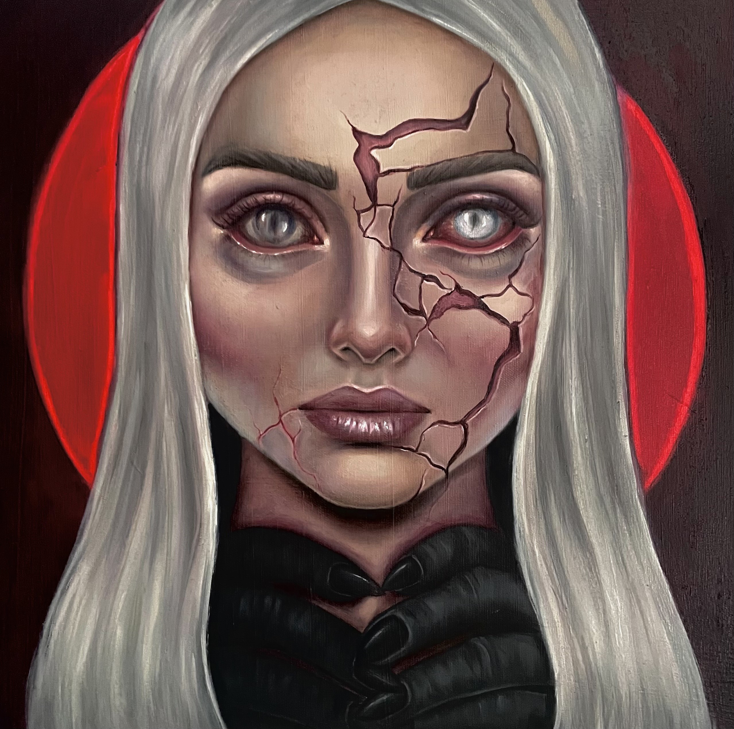 Obraz przedstawia kobiecy portret na granicy realizmu i symbolicznej deformacji. Gładka, niemal idealna powierzchnia twarzy zostaje przerwana przez pęknięcia, które odsłaniają coś głębszego: emocję, napięcie, ukryty proces rozpadu lub transformacji. Czerwone tło wzmacnia wrażenie intensywności i wewnętrznego niepokoju, tworząc kontrast z chłodną, niemal nieruchomą ekspresją postaci. Spojrzenie jest bezpośrednie, ale trudne do odczytania, zawieszone między kontrolą a kruchością. To obraz o tożsamości, o tym, co ukryte pod powierzchnią, oraz o momencie, w którym maska zaczyna pękać.