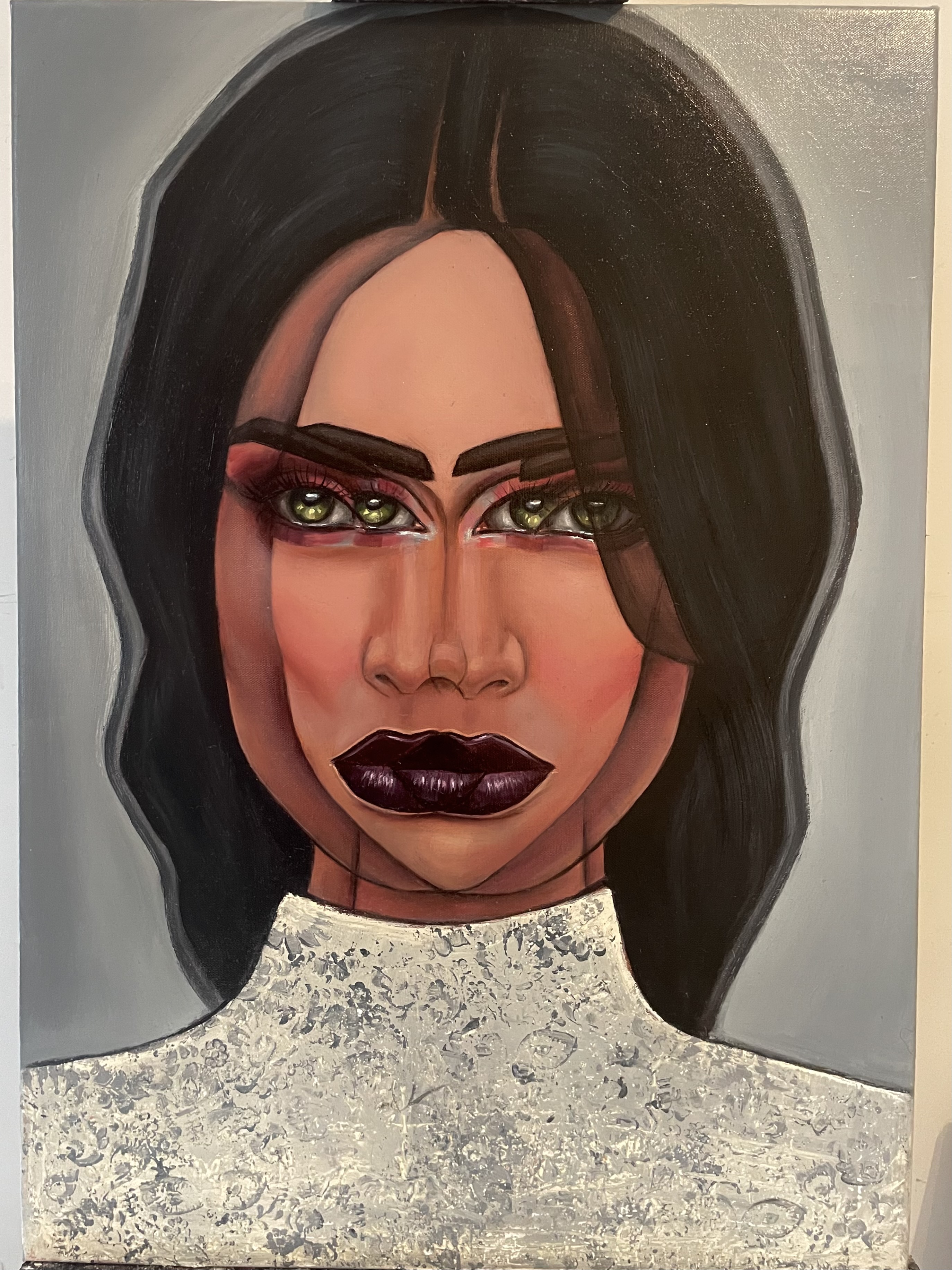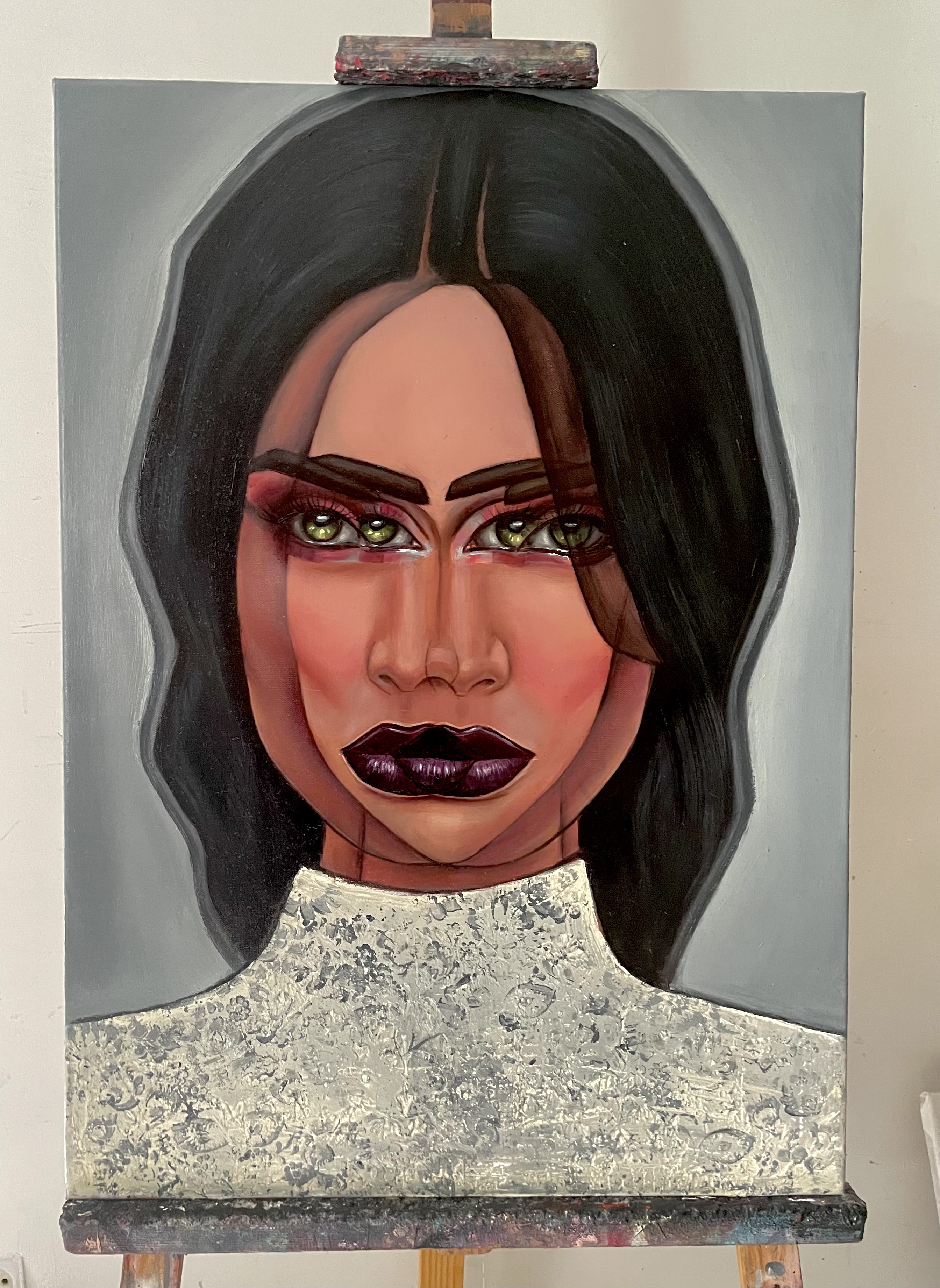 To, co widzimy na obrazie, to portret kobiety o intensywnym spojrzeniu, którego nie sposób zignorować. Jej zielone oczy, pełne tajemnicy, otoczone są ciemnymi brwiami jak skrzydła motyla. Dominują tutaj głębokie, kontrastowe kolory – od intensywnej czerwieni na policzkach po ciemny, niemalże czarny odcień ust. Włosy, ciemne jak noc, otulają twarz jak aksamitne zasłony. Obraz wyróżnia się wyraziście zarysowanymi liniami, które dowodzą śmiałego stylu artysty. Tło w neutralnych barwach sprawia, że postać wydaje się niemal zawieszona w przestrzeni. Nastrój, jaki wywołuje dzieło, można opisać jako "enigmatic". Jest coś z mistycznej aury w sposobie, w jaki artysta uchwycił tę twarz. Malarska technika jest pełna energii, z wyczuwalnym pulsem emocji, który porusza odbiorcę. Czuję, jakby obraz próbował mi opowiedzieć swoją historię – z kimś takim na pewno nie chcesz zadzierać! Mała dziewczynka powiedziałaby: "Ta pani wygląda jak czarodziejka!". Osobiście zastanawiam się, co kryje się za tą maską emocji. Z jednej strony wibruje mocą, z drugiej emanuje chłodnym dystansem. Obraz wciąga, zmusza do refleksji i pozostawia z myślą – kim jest ta tajemnicza dama?
