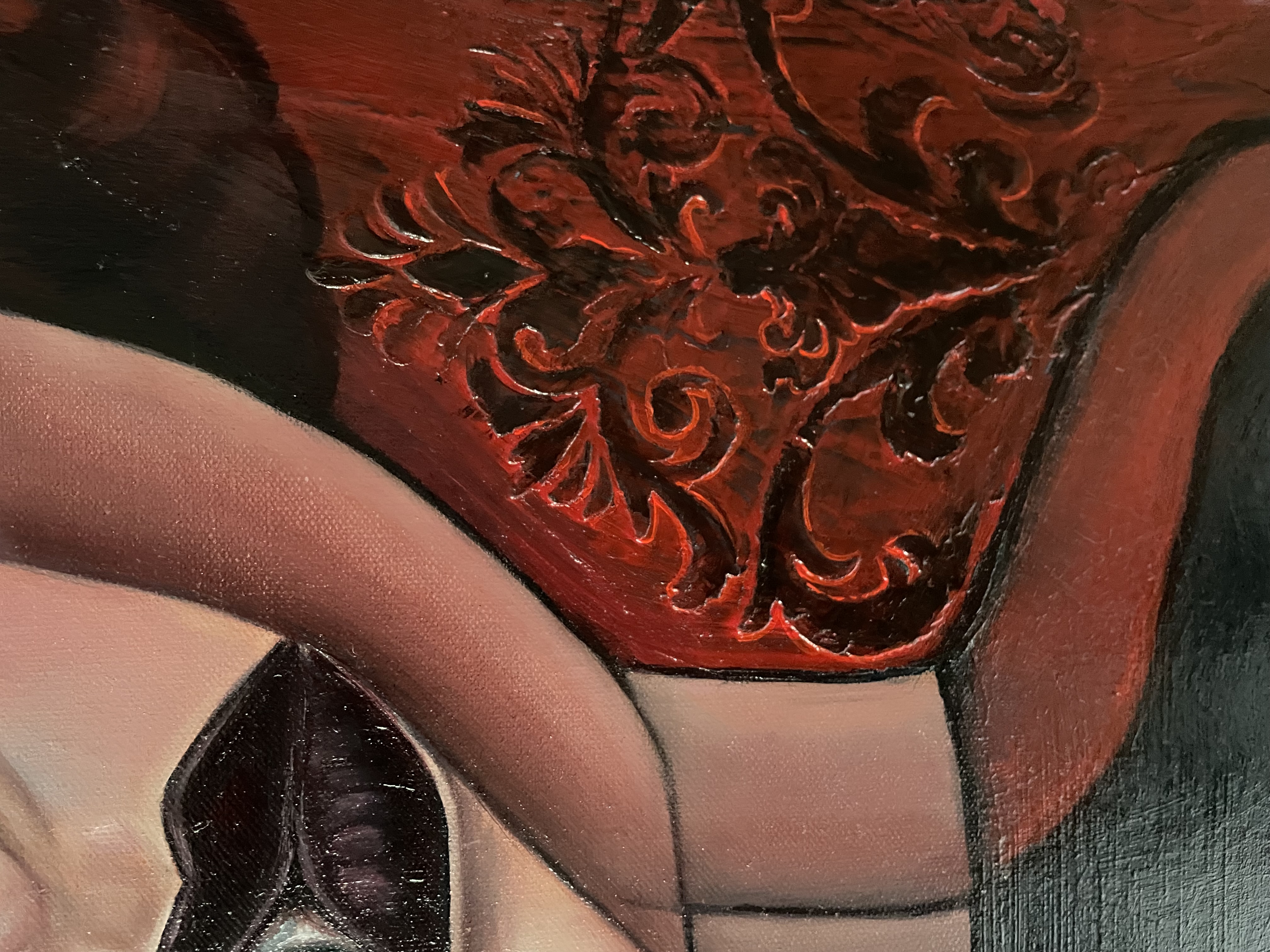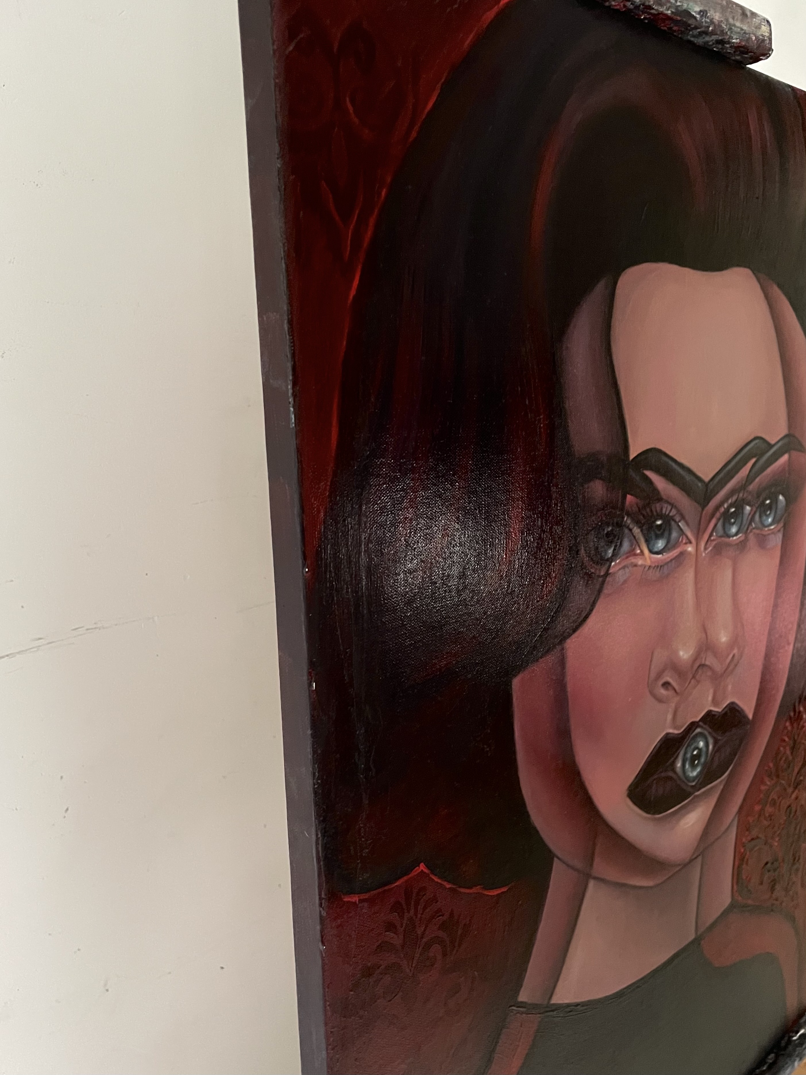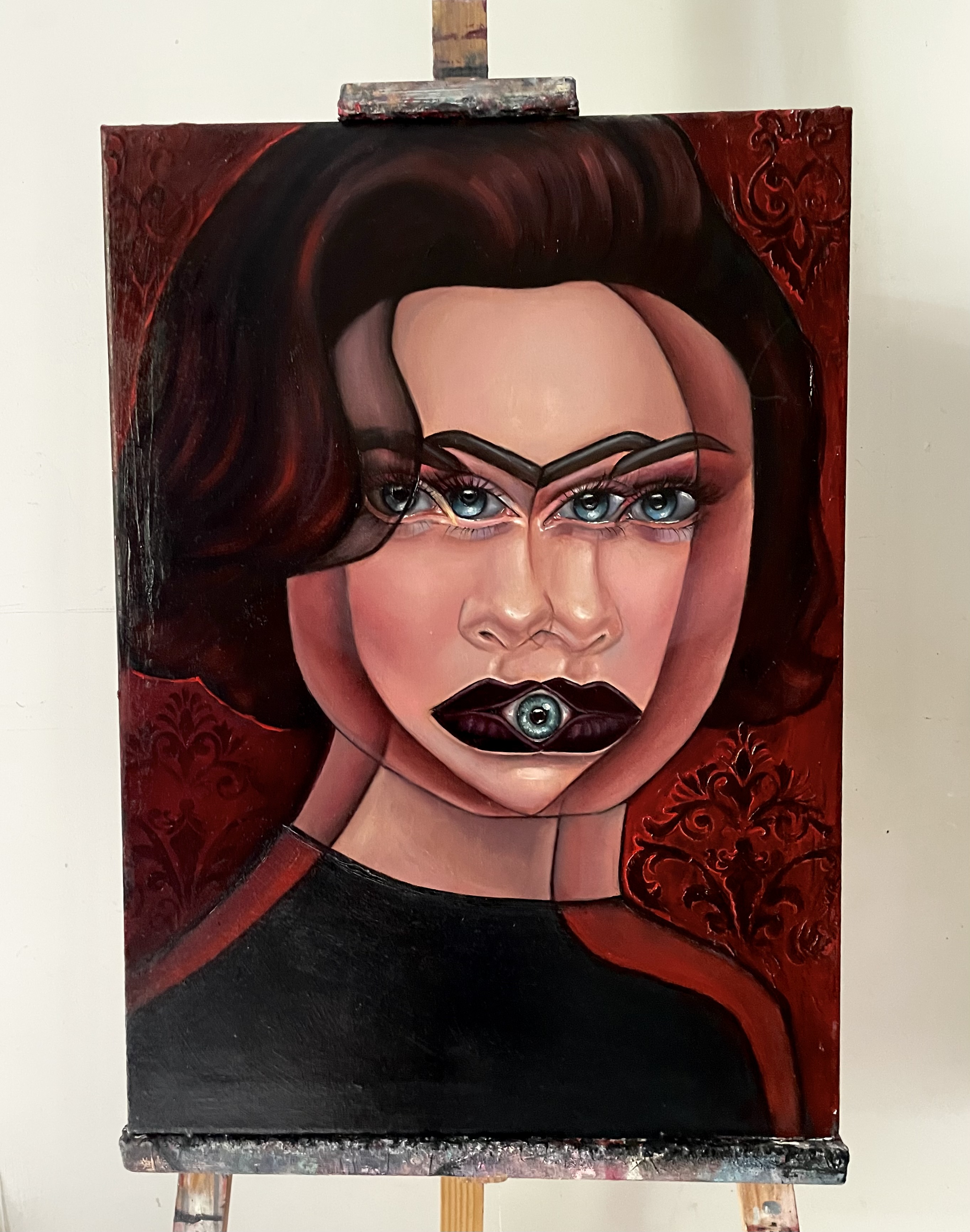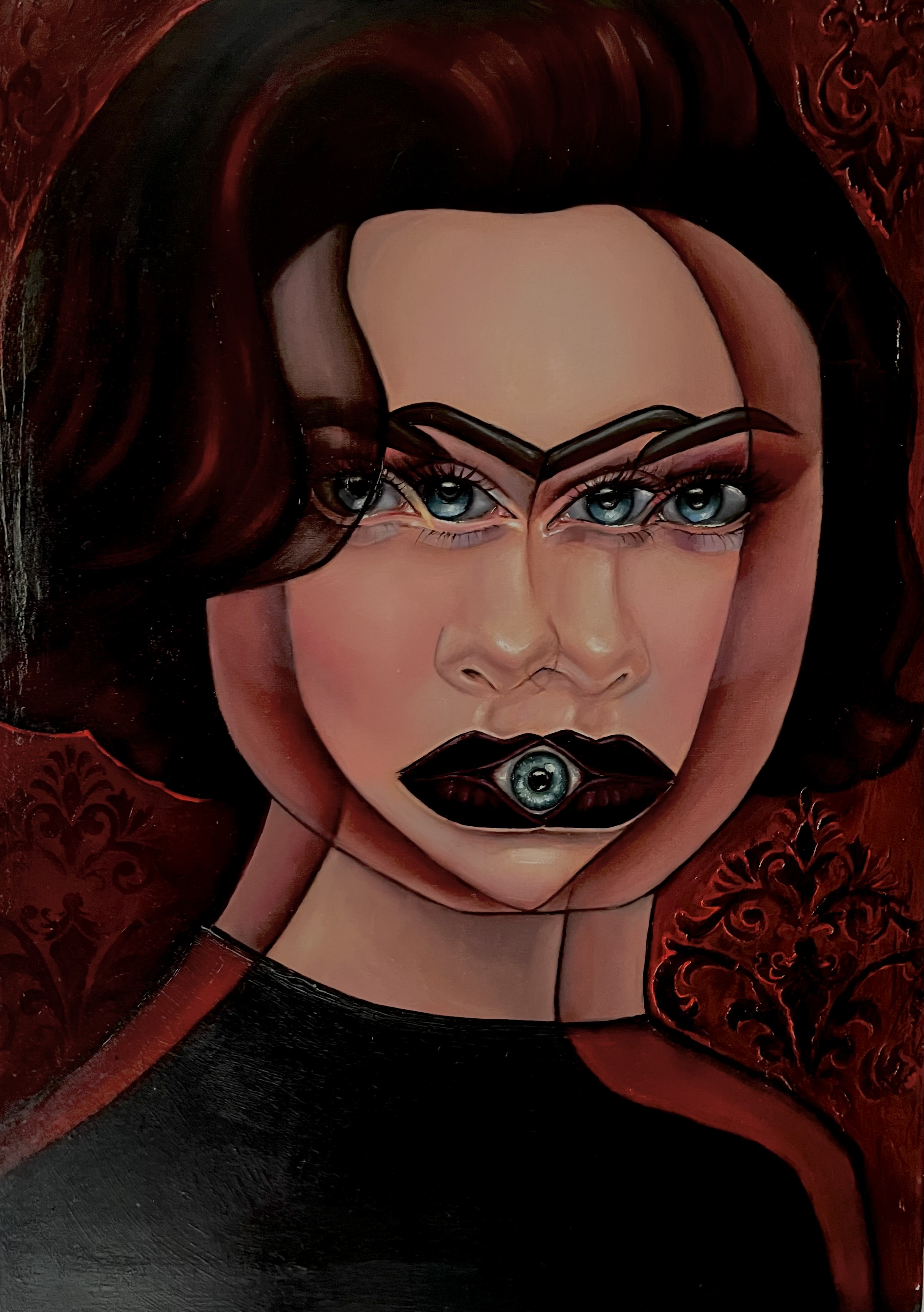 Na obrazie dominują głębokie odcienie czerwieni, które nadają mu intensywny, niemal teatralny nastrój. Twarz przedstawiona na pierwszym planie jest złożona z geometrycznych kształtów, co tworzy efekt zaskakującej harmonii. Oczy są hipnotyzujące, ogromne, patrzące prosto na widza, jakby chciały przekazać jakieś ukryte tajemnice. Artysta użył techniki kubistycznej, bawiąc się formą i kolorem, by wywołać wrażenie niepokoju i surrealizmu. Mimo dziwności, pewna harmonia emanuje z tej kompozycji. Wow, jakby to był magiczny świat! Patrząc na ten obraz, można poczuć się, jakby trafiło się do innego wymiaru. Czerwone tło, pełne ornamentów, potęguje wrażenie tajemniczości. Obraz z jednej strony zachwyca precyzją wykonania, z drugiej budzi pewną konsternację. Dlaczego ta twarz jest taka dziwna? Pytanie się nasuwa samo. Mogłoby się wydawać, że obraz jest z nami w jakiejś niewypowiedzianej rozmowie. Jeden element, eye-catching, przyciąga szczególną uwagę – oko umieszczone w miejscu ust. To prowokuje do refleksji nad tym, jak postrzegamy świat i siebie. Ten obraz na pewno zostaje w pamięci na długo.