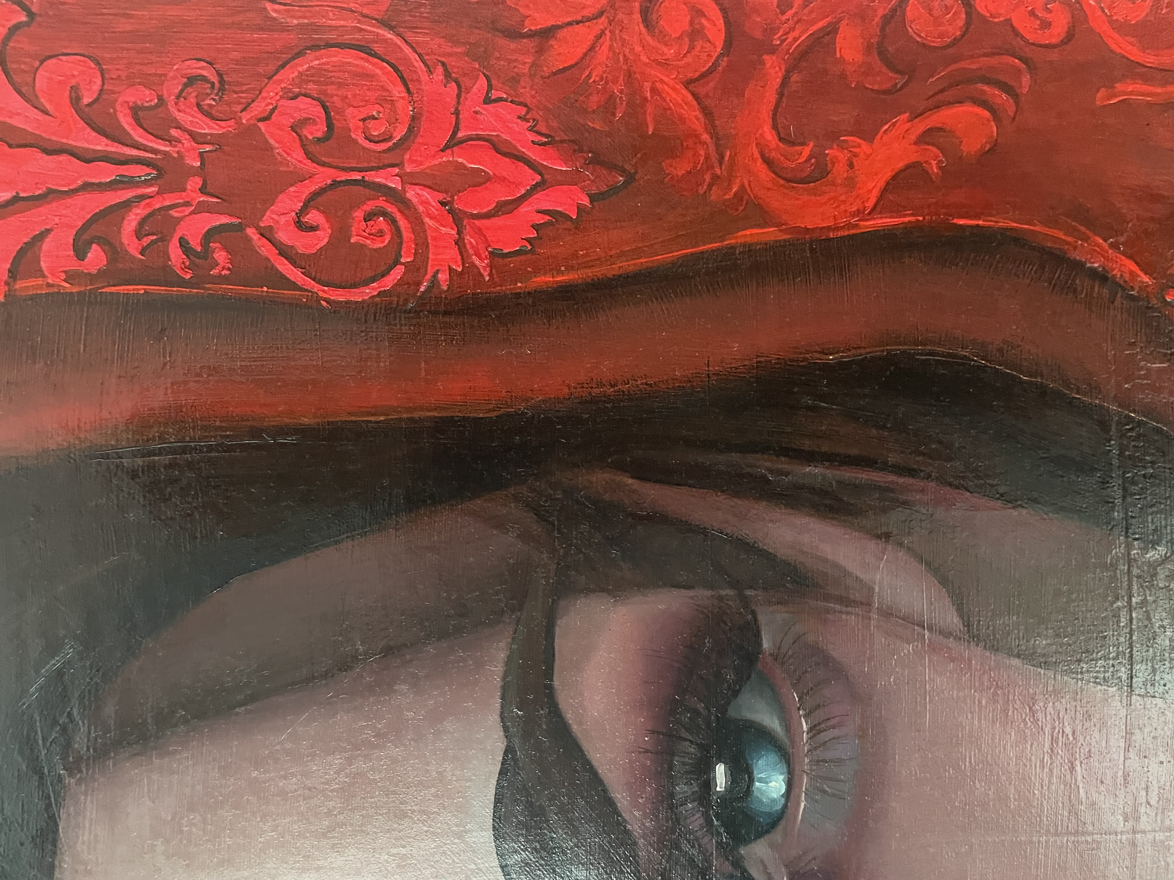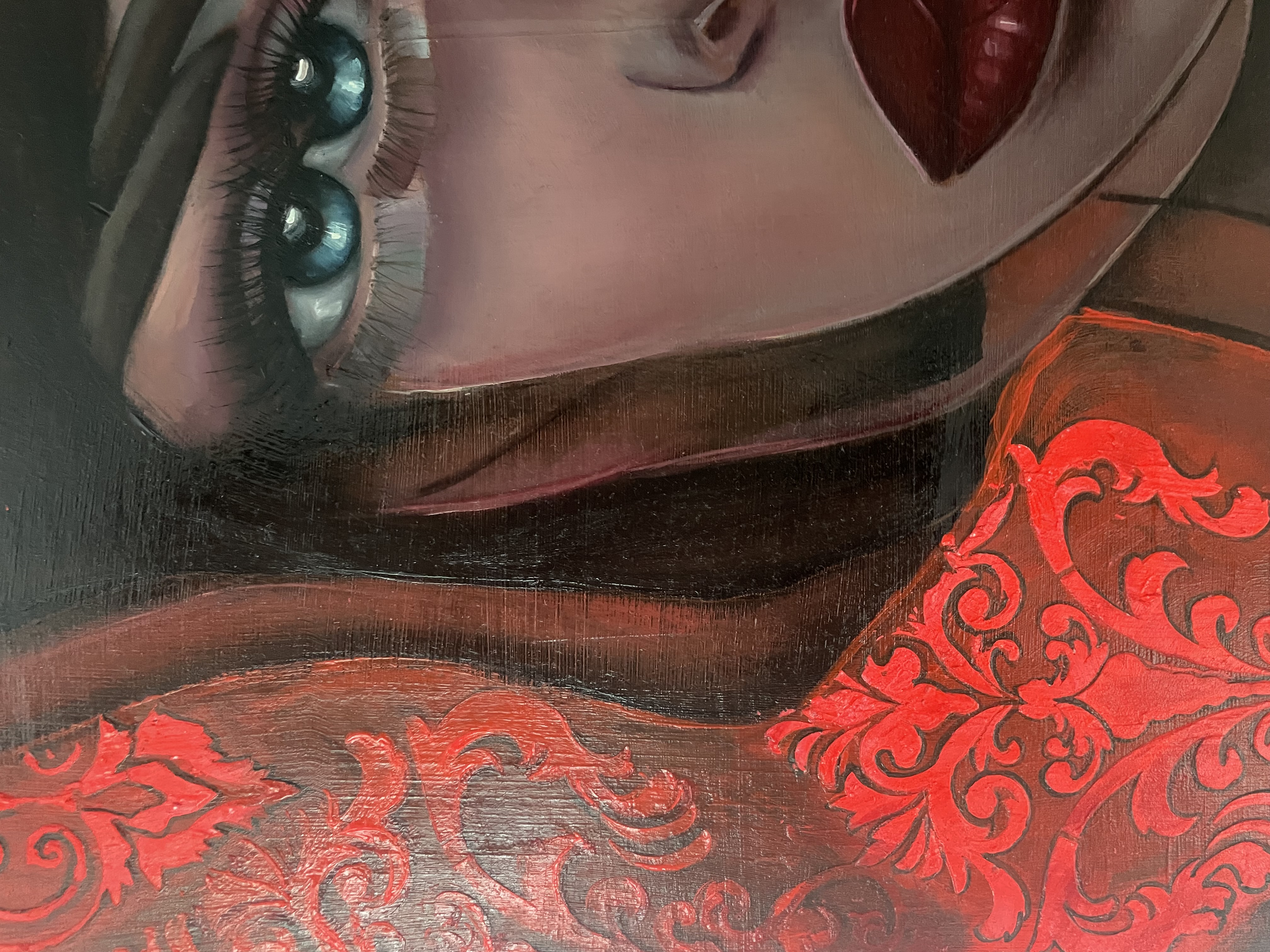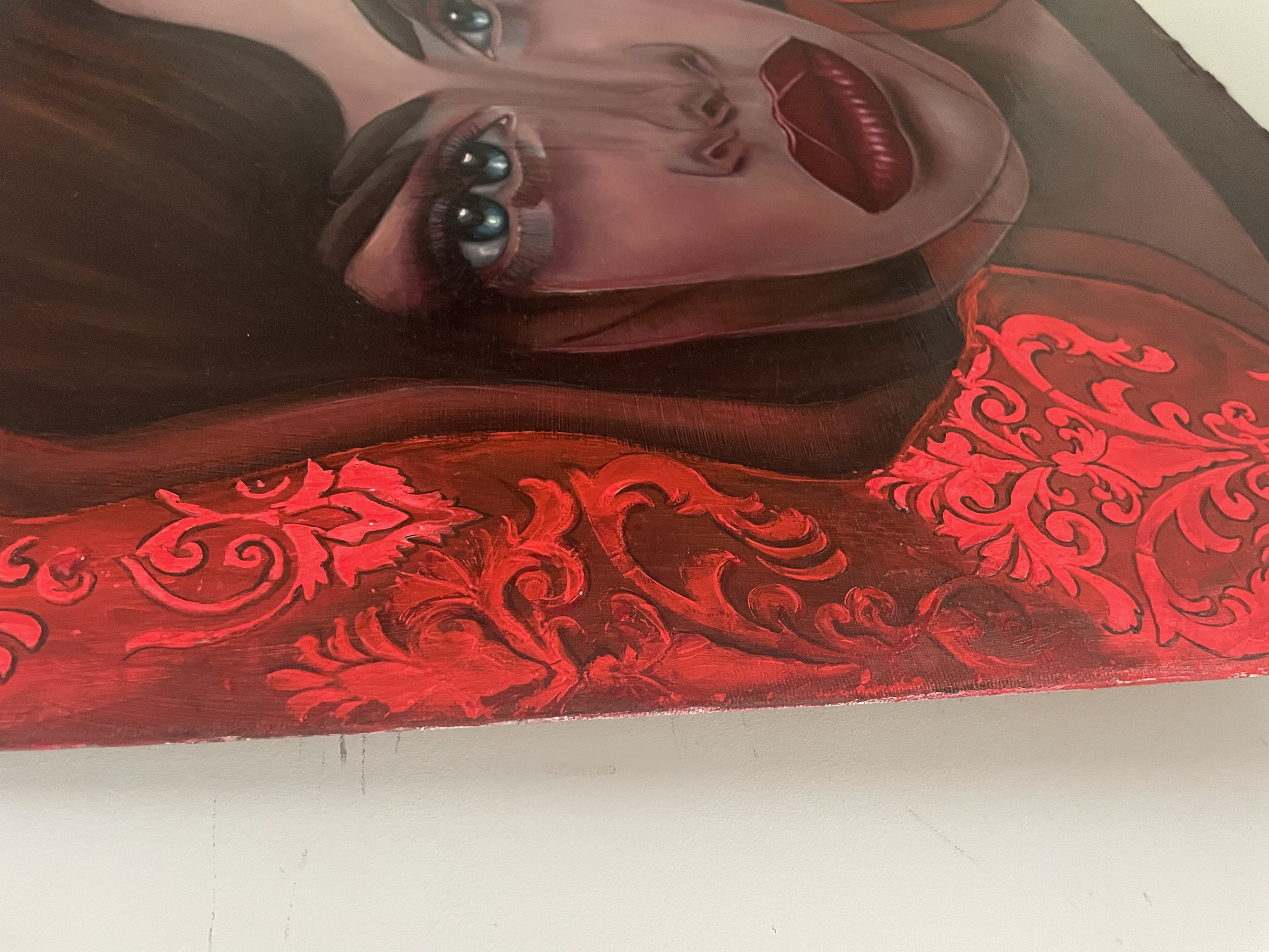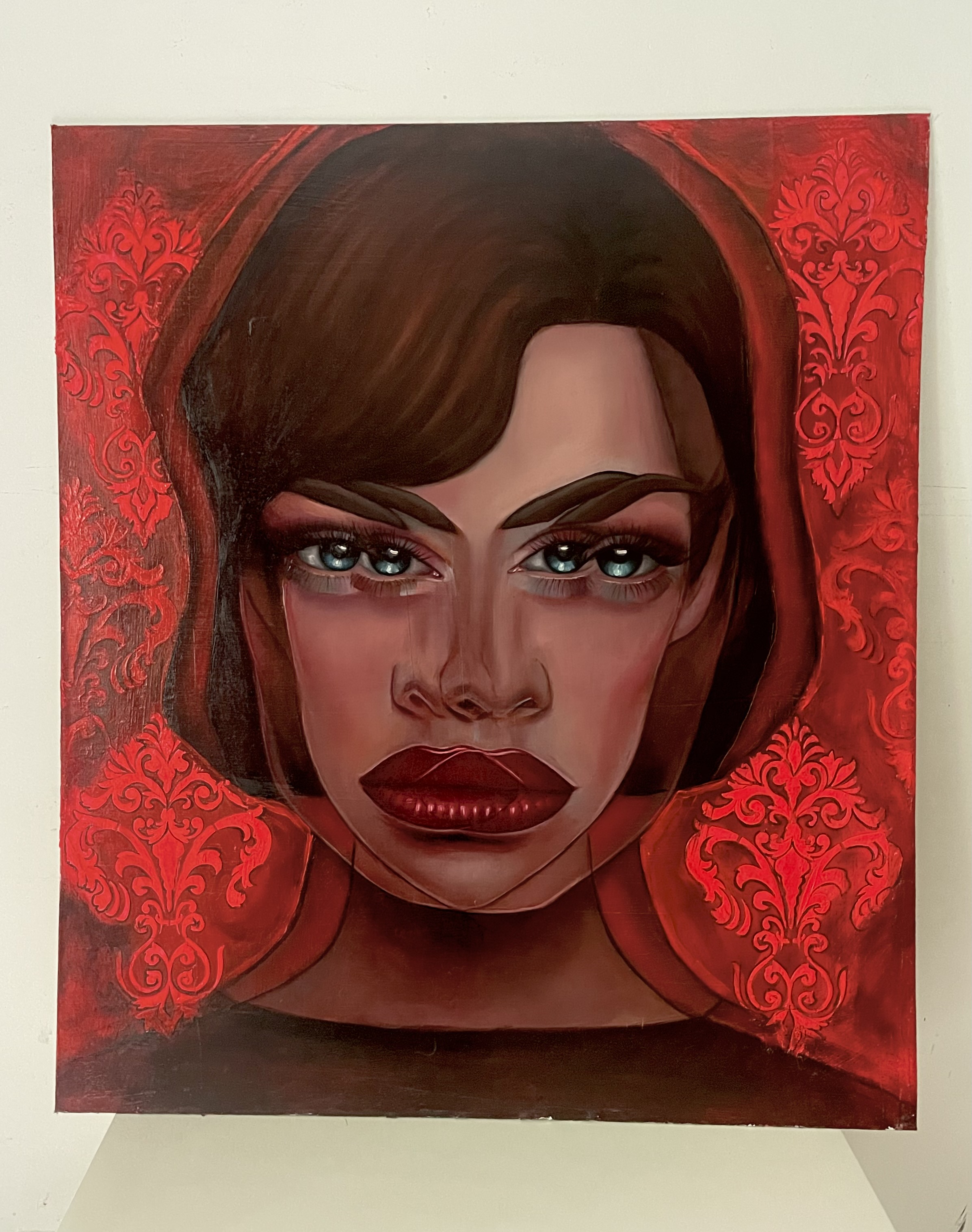 Na obrazie widzimy wyrazistą twarz kobiety, której mocne, czerwone usta przyciągają wzrok od razu. Całe tło płonie intensywną czerwienią, ozdobioną ornamentami przypominającymi barokowe wzory. Ta czerwień jest hipnotyzująca i niemalże magiczna, kontrastując z bladą cerą postaci. Wyraziste oczy, niczym dwa niebieskie jeziora, zdają się patrzeć prosto w duszę widza, wciągając go w swój świat. Kompozycja obrazu jest bezpośrednia, skoncentrowana na twarzy, co potęguje uczucie napięcia i tajemniczości. W dziele można dostrzec inspirację stylizowanym realizmem, a technika jest pieczołowita i staranna. Artysta bawi się kontrastem kolorów i śmiałymi pociągnięciami pędzla, co tworzy atmosferę nasycenia emocjami i pewnej teatralności. Styl malarski, jaki tu zastosowano, balansuje pomiędzy realizmem a ekspresjonizmem, dodając klimatu pełnego dramaturgii. Dzieło wywołuje mieszane uczucia, od ciekawości po lekkie niepokojenie. Patrząc na nie, można poczuć jakąś dziwną bliskość i dystans jednocześnie. Coś jak deja vu w obrazie. Moje skojarzenia biegną w stronę tajemniczości i piękna zarazem. Całość emanuje intensywnością, której nie sposób zignorować.
