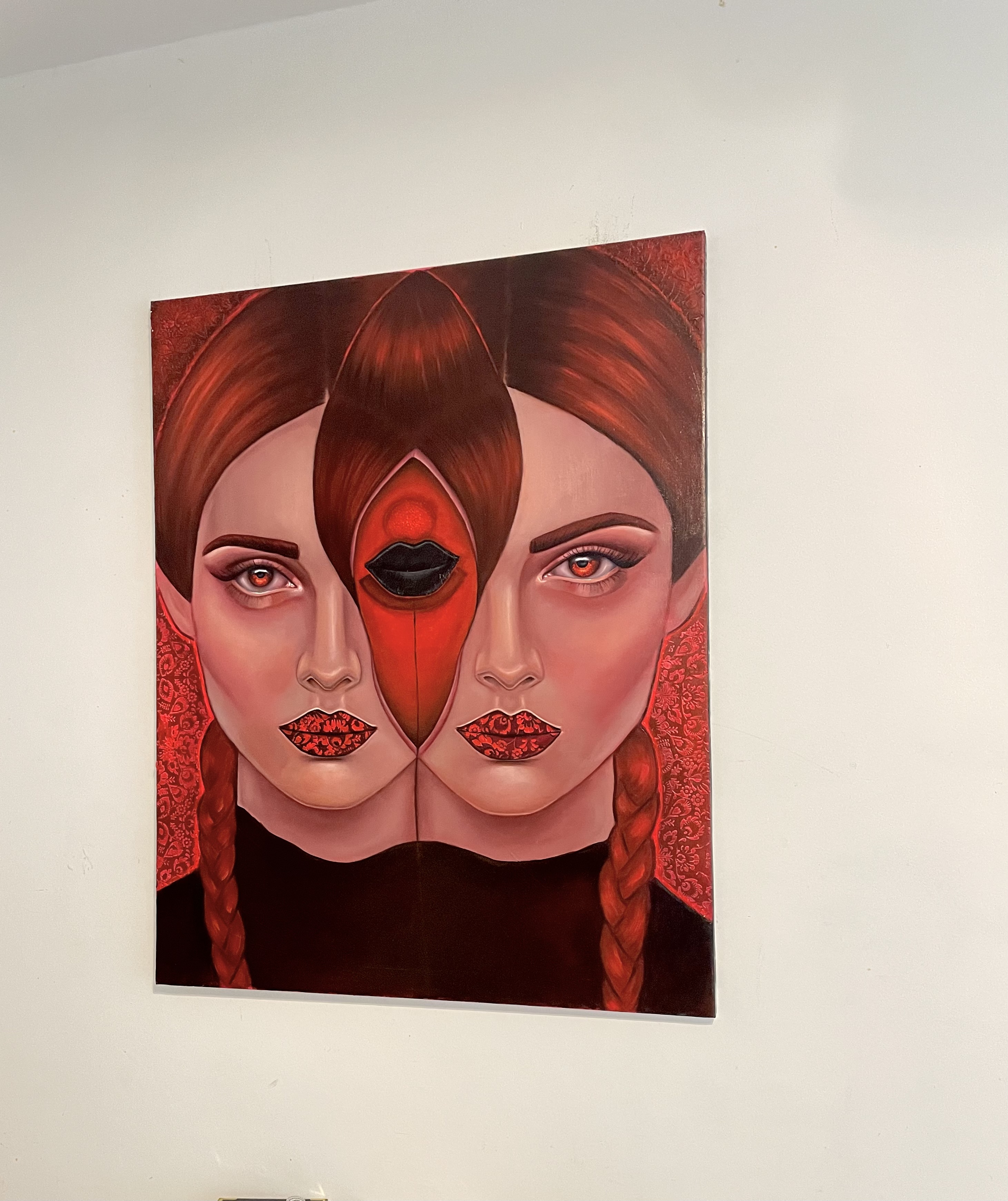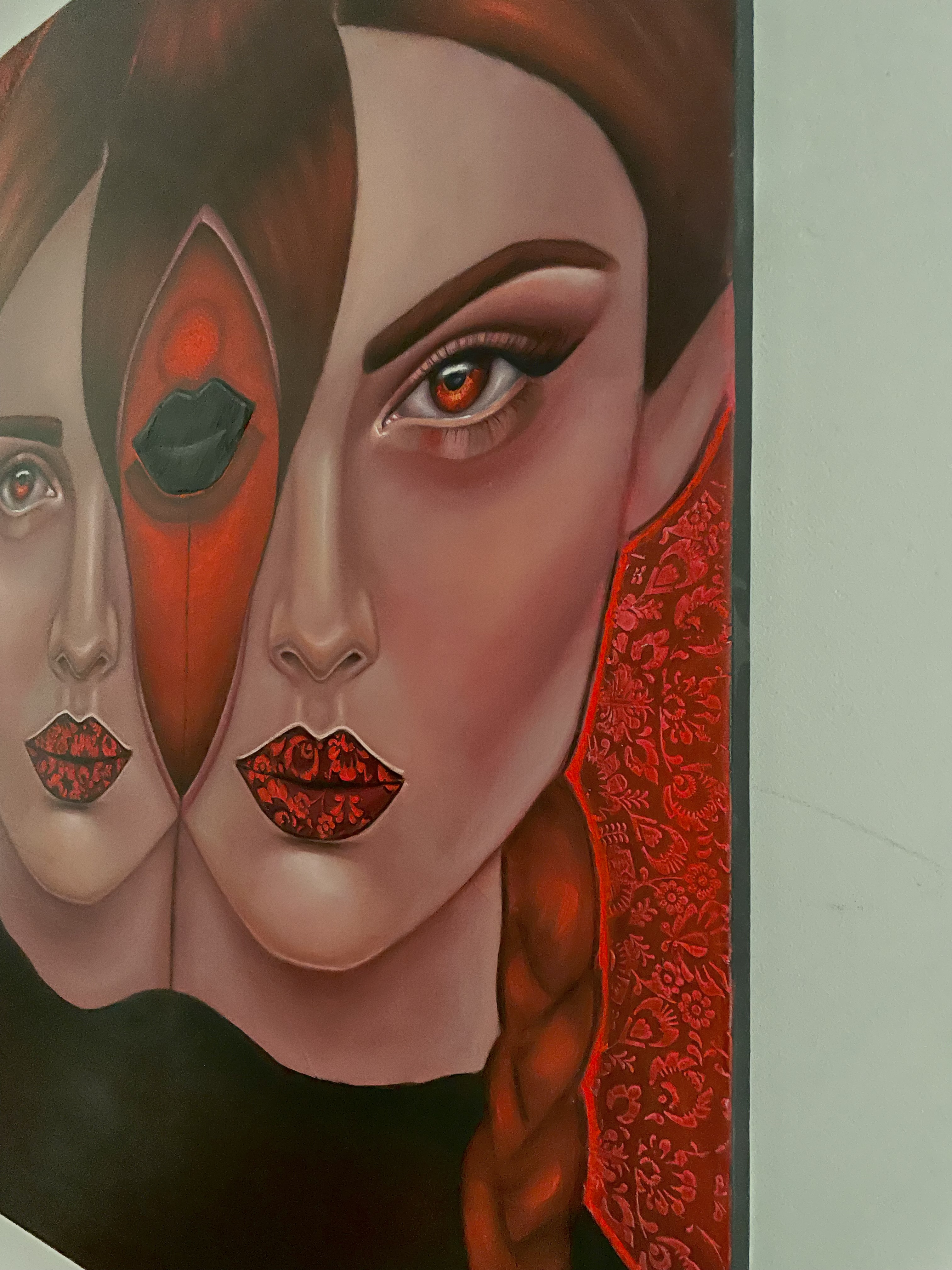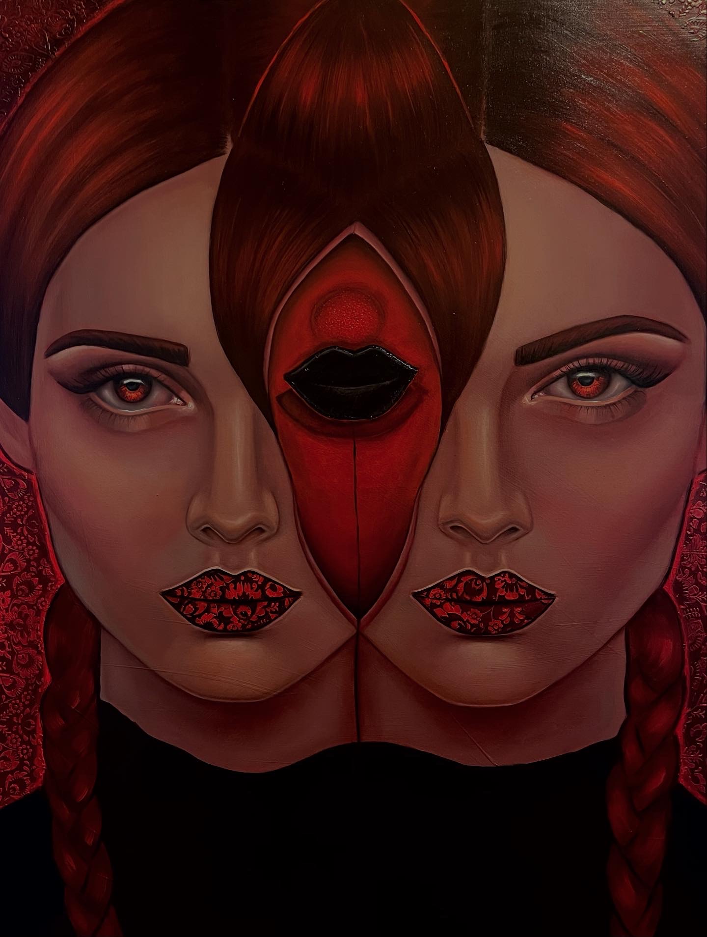 Obraz emanuje intensywnym czerwonym kolorem, który dominuje w całej kompozycji, tworząc hipnotyczny, niemal magiczny nastrój. Dwie symetryczne twarze, niemal identyczne, spojrzeniem hipnotyzująco wpatrują się przed siebie. Ich oczy są jakby z innego świata, tajemnicze i nieco niepokojące. Środkowy element, przypominający oko, przyciąga wzrok swoją głęboką czernią. To trochę jak portal do innej rzeczywistości, prawie jak magiczne wrota, które kuszą, by je przekroczyć. Artysta użył subtelnych przejść tonalnych i precyzyjnych linii, by nadać obrazowi płynność i harmonię. Technika przypomina surrealizm, gdzie rzeczywistość miesza się z fantazją, tworząc dream-like atmosferę. Patrząc na to dzieło, można poczuć lekki niepokój, ale i fascynację, jakbyśmy byli świadkami ukrytej historii. Może to być o dualizmie natury… Jednocześnie obraz wywołuje refleksję nad tym, jak postrzegamy piękno i to, co znajduje się poza powierzchnią.