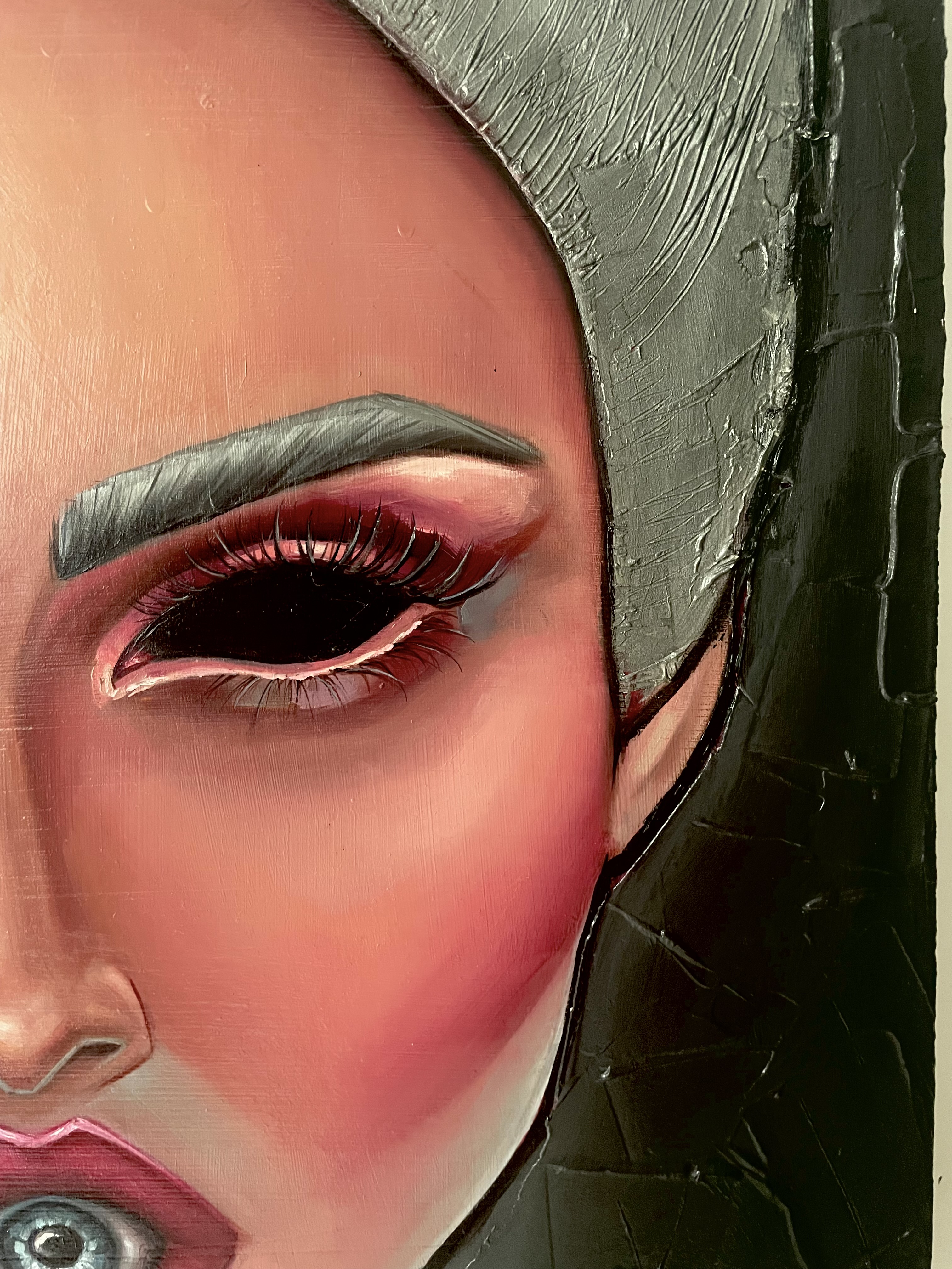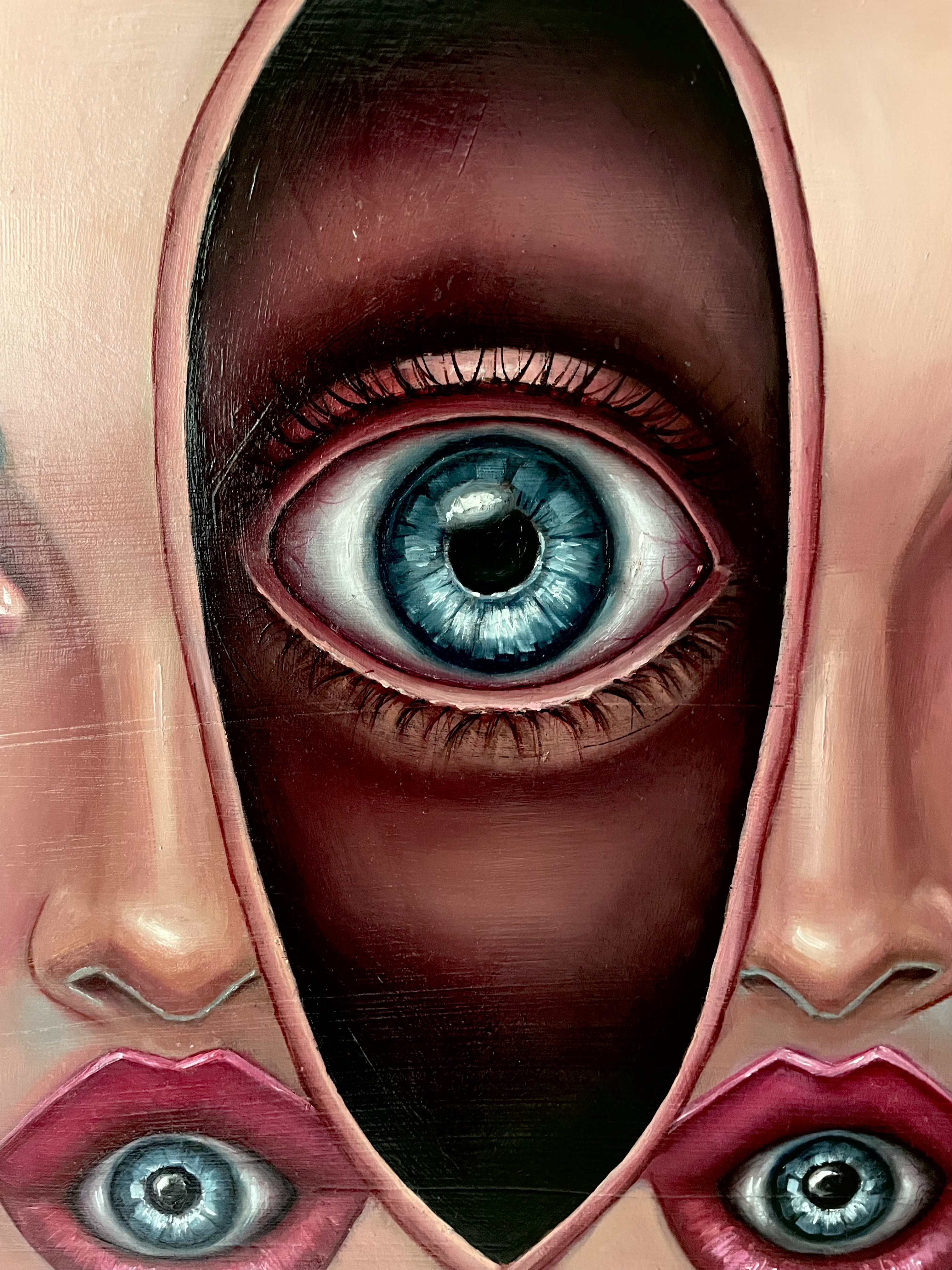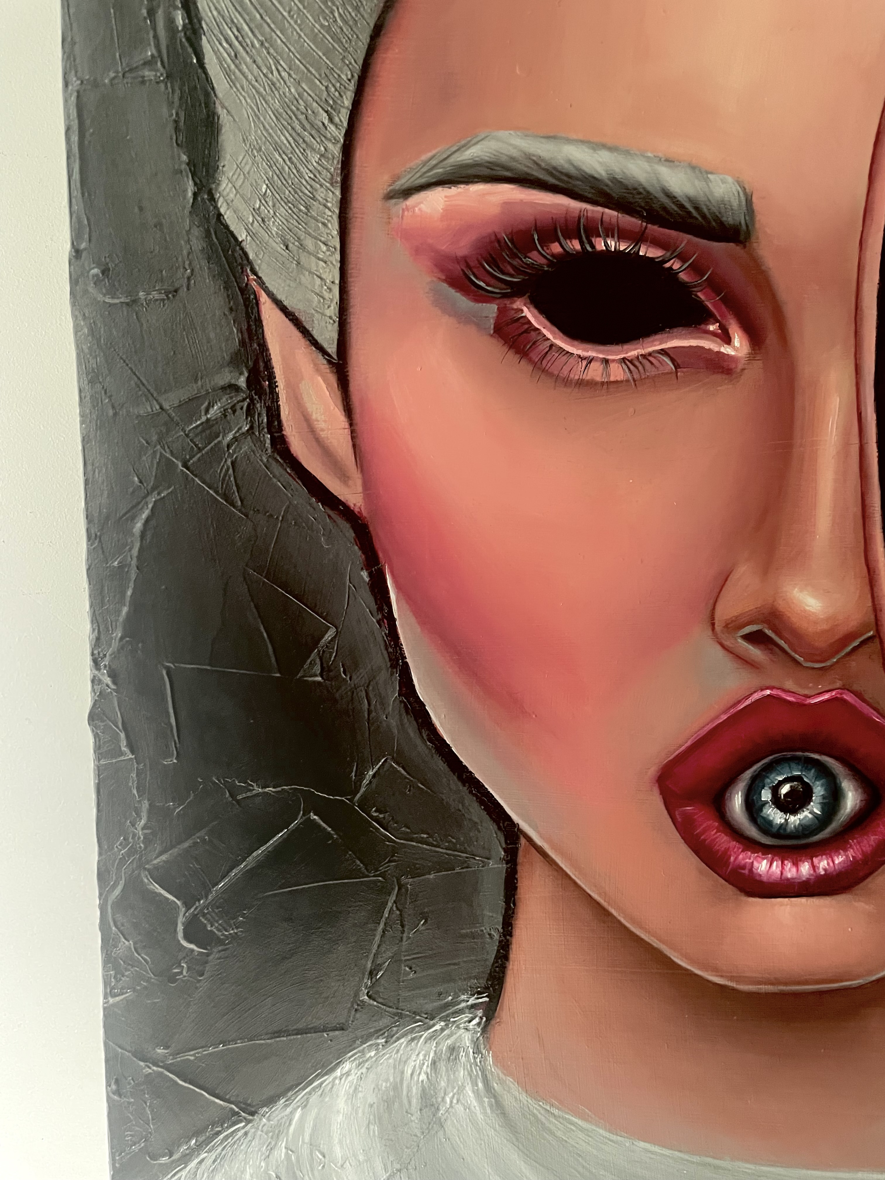 Obraz przedstawia intrygującą kompozycję dwóch twarzy, które łączą się w surrealistyczny sposób, tworząc jedną postać. Dominują tu mocne odcienie czerwieni i szarości, które przyciągają wzrok. Centralnym punktem dzieła jest pojedyncze, wyraziste oko znajdujące się między dwoma połowami twarzy, nadające całości tajemniczy charakter. Usta też zaskakują, bo w ich wnętrzu kryją się kolejne pary oczu. Patrzysz i czujesz się jak w krainie czarów – trochę zdezorientowany. Atmosfera obrazu jest niepokojąca, ale jednocześnie fascynująca. Takie połączenie wywołuje w odbiorcy mieszankę ciekawości i niepokoju. Technika artystyczna to realistyczne malarstwo z elementami surrealizmu, widoczne w precyzyjnie odwzorowanych detalach i nietypowej aranżacji elementów. Obraz może prowokować do refleksji nad tożsamością, dualnością i ukrytymi warstwami duszy. Osobiście, kiedy na to patrzę, czuję się jakbym zaglądał do czyjegoś snu. Coś niby bliskiego, a niezrozumiałego. Ten element "weirdness" naprawdę wprawia w zdumienie.