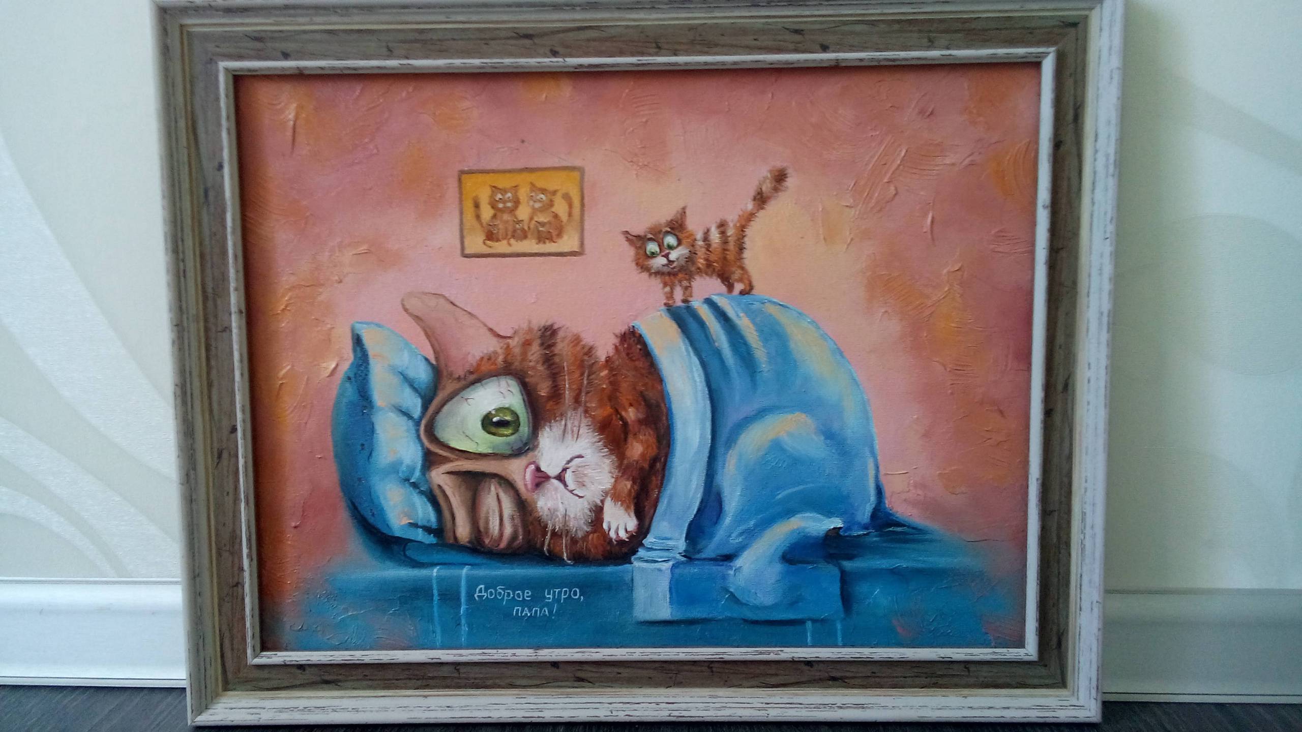 Na obrazie widzimy ogromnego kota o wielkich, zielonych oczach, który leży w łóżku, zawinięty w niebieską kołdrę. Na czubku jego głowy stoi mniejszy kotek z psotnym wyrazem pyszczka. Tło jest w ciepłych odcieniach pomarańczu, co dodaje przytulnej atmosfery. Na ścianie wisi niewielki obrazek z podobiznami kotów, który dodaje uroku całej scenerii. Obraz pełen jest śmiechu i pozytywnej energii. Artysta, z dużym poczuciem humoru, użył kontrastujących barw i dynamicznych pociągnięć pędzla, tworząc wrażenie ruchu i lekkości. Scena wprowadza widza w nostalgiczny, poranny nastrój. Czujemy, jakbyśmy byli świadkami poranka w kocim świecie. Jest tu coś z cartoon czy komiksu - te wyolbrzymione kocie oczy, rozbrajająca poza. Patrząc na to, nie sposób się nie uśmiechnąć. Obraz przypomina mi, jakie zabawne i nieprzewidywalne potrafią być zwierzaki. Emocje, jakie wzbudza obraz, to radość i lekkość. A może i odrobina współczucia dla tego większego kota, który zdaje się nie być gotowy na początek dnia. Może cześć nas widzi siebie w tej sennie zaspanej minie wielkiego kota. Jeden mały kocur potrafi zrobić differences! Wywołuje to ciepłe uczucia, uczy nas doceniać drobne chwile. To tak, jakby artysta chciał powiedzieć: "Spójrz, małe rzeczy potrafią rozjaśnić poranek!" Dzieciak by powiedział, że kotek wygląda jakby ktoś go utulił do snu. Ten obraz to prawdziwa radość dla oka.
