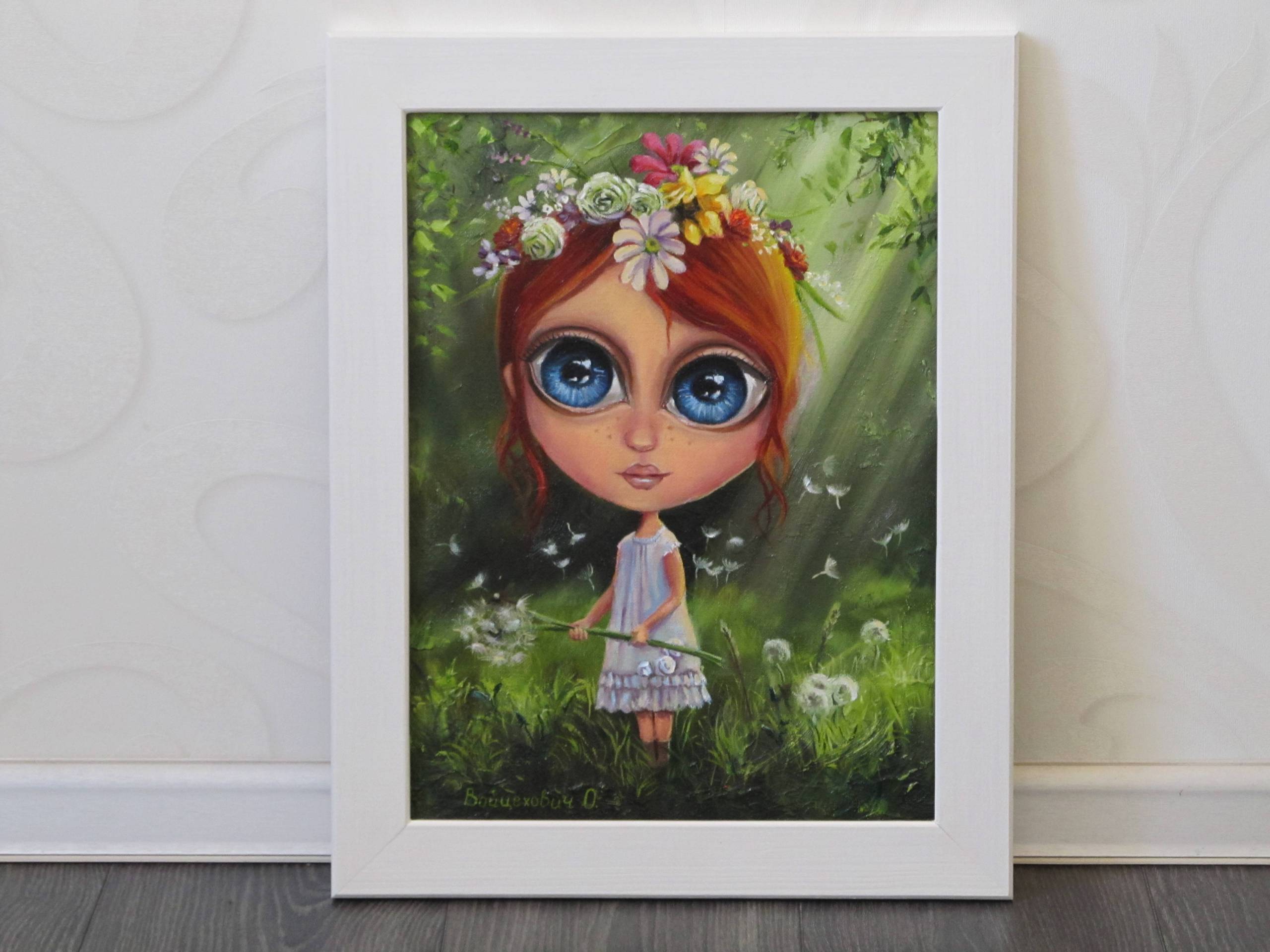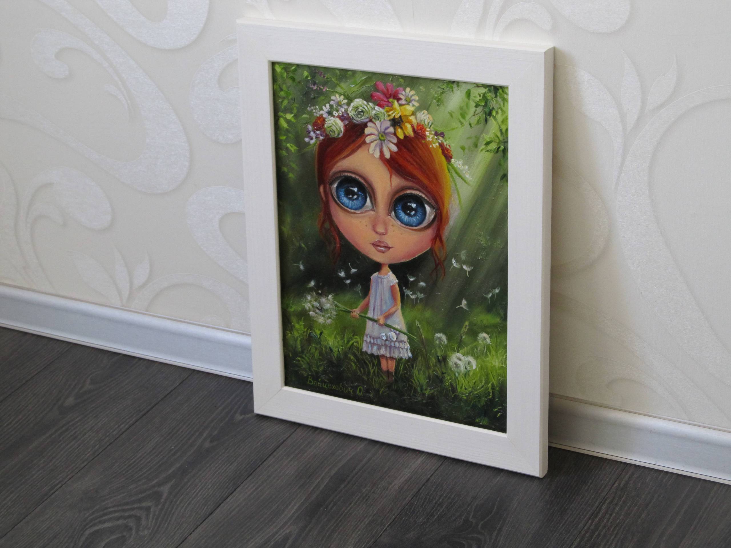 Na obrazie widzimy postać dziewczynki o ogromnych, błękitnych oczach, które zdają się patrzeć prosto w duszę. Jest otoczona bujną zielenią, a promienie słońca przenikają przez liście, tworząc magiczną grę światła. Na głowie ma wianek z kolorowych kwiatów, który dodaje radości i beztroski. Atmosfera obrazu jest jak z baśni – jednocześnie magiczna i delikatna. Czujemy tę tajemniczą aurę, może nawet nostalgię za utraconym światem dzieciństwa. Artystyczny styl nawiązuje do realizmu z nutą surrealizmu. Technika malarska jest precyzyjna, a jednak pełna miękkości. Ten obraz, to taki "dreamlike" obraz – jak marzenie senne. Wywołuje u mnie uczucie spokoju i czarującego oderwania od rzeczywistości. Dziecko powiedziałoby: "Ona wygląda jak wróżka z bajki!". Te oczy wciągają, jakby mówiły, zatańcz ze mną w tej krainie magicznej. A te drobne dmuchawce, co fruną dookoła, to jakby marzenia unoszące się w powietrzu. Ten obraz naprawdę skłania do zastanowienia się nad tym, co tak naprawdę znaczy "być dzieckiem". Dodaje takiej iskierki do codzienności.