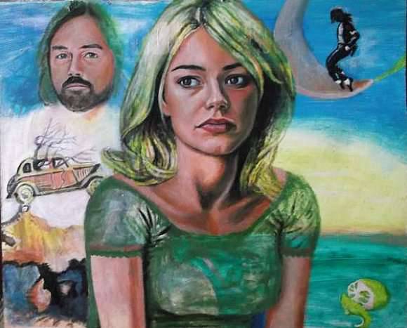 Na obrazie widzimy kobieta na pierwszym planie, ubrana w zieloną bluzkę, z lekkim cieniowaniem i dbałością o detale. W tle znajduje się scena z postacią na księżycu oraz portret mężczyzny. Wszystko to osadzone na tle pełnym niebieskich i zielonych odcieni, które tworzą spokojną, ale jednocześnie lekko tajemniczą atmosferę. Kolory są ciepłe i kojące, wprowadzają nastrój refleksji. Styl jest trochę surrealistyczny, z nutką realizmu w twarzach postaci. Technika zdaje się być mieszanką malarstwa akrylowego z delikatnym muśnięciem impresjonizmu. Każdy element obrazu zdaje się mieć swoje miejsce, jakby opowiadał własną historię. Może to być senna wizja, a może wyraz tęsknoty za marzeniami. Obraz wywołuje mieszankę emocji – nostalgia miesza się z pewną beztroską, co skłania do własnych interpretacji. Wyobrażam sobie, że ta kobieta myśli o podróży do odległych krain. To jak przygoda "out of this world". Dziecięce zdanie? "Ta pani chyba zaraz poleci na księżyc!" Osobiście czuję ciepło i spokój, ale także nutkę tajemniczości. Może dlatego, że obrazy często skrywają więcej niż myślimy na pierwszy rzut oka. Choć na chwilę udaje się przenieść do świata, gdzie wszystko jest możliwe, wystarczy tylko wyciągnąć rękę.