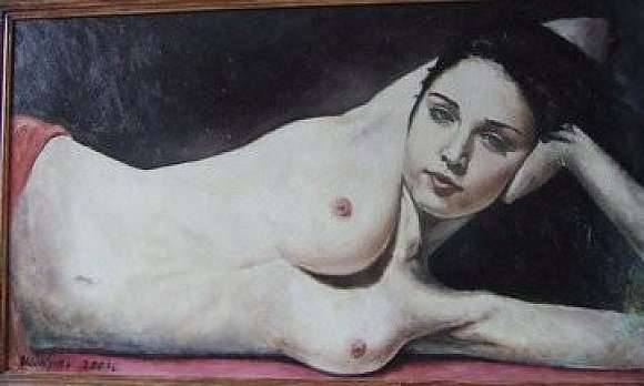 Obraz przedstawia leżącą kobietę, której nagie ciało delikatnie kontrastuje z ciemnym tłem. Subtelne odcienie beżu i różu tworzą miękką atmosferę, podkreślając naturalność i wdzięk przedstawionej postaci. Kompozycja jest prosta, a zarazem elegancka - kobieta wydaje się odpoczywać w lekkiej zadumie, co dodaje dziełu spokoju i intymności. Wzrok widza przyciąga wyrazista twarz, której malarskość oddaje emocje i głębię postaci. Artysta, wykorzystując techniki pędzla i subtelne blendowanie kolorów, osiąga efekt realistycznego portretu, zachowując jednocześnie pewną impresjonistyczną lekkość. Obraz może wywoływać u odbiorcy uczucie pewnej nostalgii, przypominając o ulotnych chwilach komfortu i wyciszenia. Doświadczenie spojrzenia postaci wyzwala indywidualne interpretacje - jedni mogą dostrzegać w nim refleksję, inni zwykłą codzienną błogość. Nastrój malowidła sprawia, że widz może poczuć się jakby sam był częścią tej spokojnej chwili. Beautiful, prawda? Twarz jest troszkę jak z innej epoki, a to budzi refleksje nad tym, jak różne były kanony piękna na przestrzeni lat. Dziecko powiedziałoby: "Ta pani chyba opala się w pokoju!" Tak, obraz zaprasza do zatrzymania się i kontemplacji nad subtelnością piękna i intymnych momentów życia. To nie tylko portret, lecz okno do prywatnego świata, w którym króluje spokój i harmonia.
