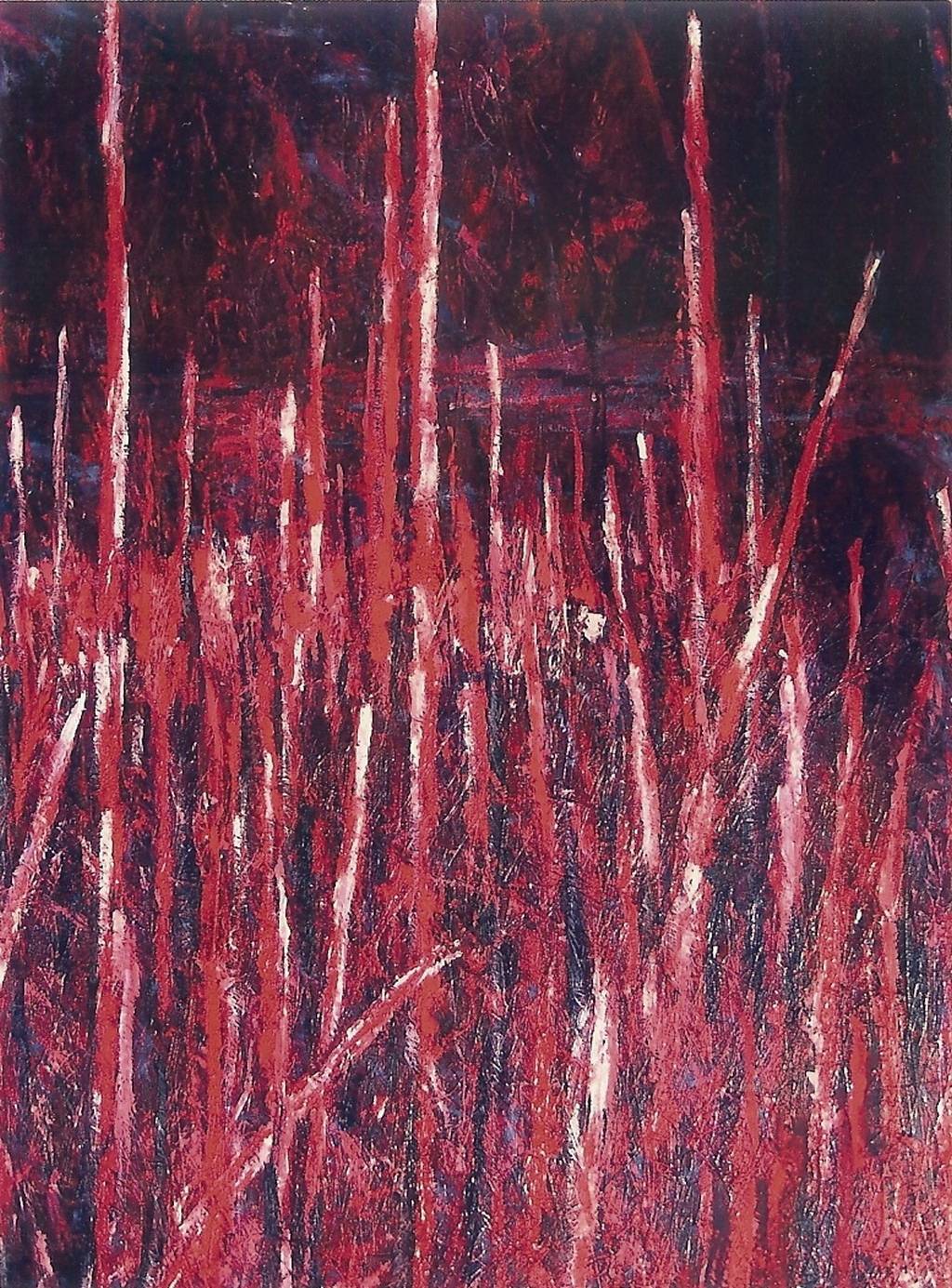 Na obrazie dominują intensywne odcienie czerwieni, które przywołują na myśl burzliwy zachód słońca. Przypomina takie długie, cienkie patyki sterczące w górę. Kompozycja jest przepełniona pionowymi liniami, które tworzą dynamiczne wrażenie ruchu. Mają w sobie coś surowego i niespokojnego, jakby całe pole trawy próbowało wyrwać się ku niebu. Jest tu też coś niepokojącego, prawda? Atmosfera dzieła jest tajemnicza, nieco mroczna. Styl artysty oscyluje między ekspresjonizmem a abstrakcją. Gruba warstwa farby, technika impasto, podkreśla emocjonalny ciężar kompozycji. Obraz może wywoływać różnorodne emocje — od niepokoju, przez fascynację, po refleksję nad skomplikowanymi zakamarkami ludzkiej duszy. W życiu też czasem wszystko jest such and confusing, prawda? Dzieci powiedziałyby pewnie, że to czerwone miotły na wietrze. Podziwiając to dzieło, można poczuć się jakby na krawędzi czegoś nieznanego.
