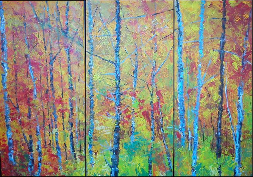 Tryptyk składa się z 3 podobrazi bawełnianych formatu 100/40. Obraz akrylowy, namalowany techniką autorską strukturalną. Zamalowane boki obrazu.
