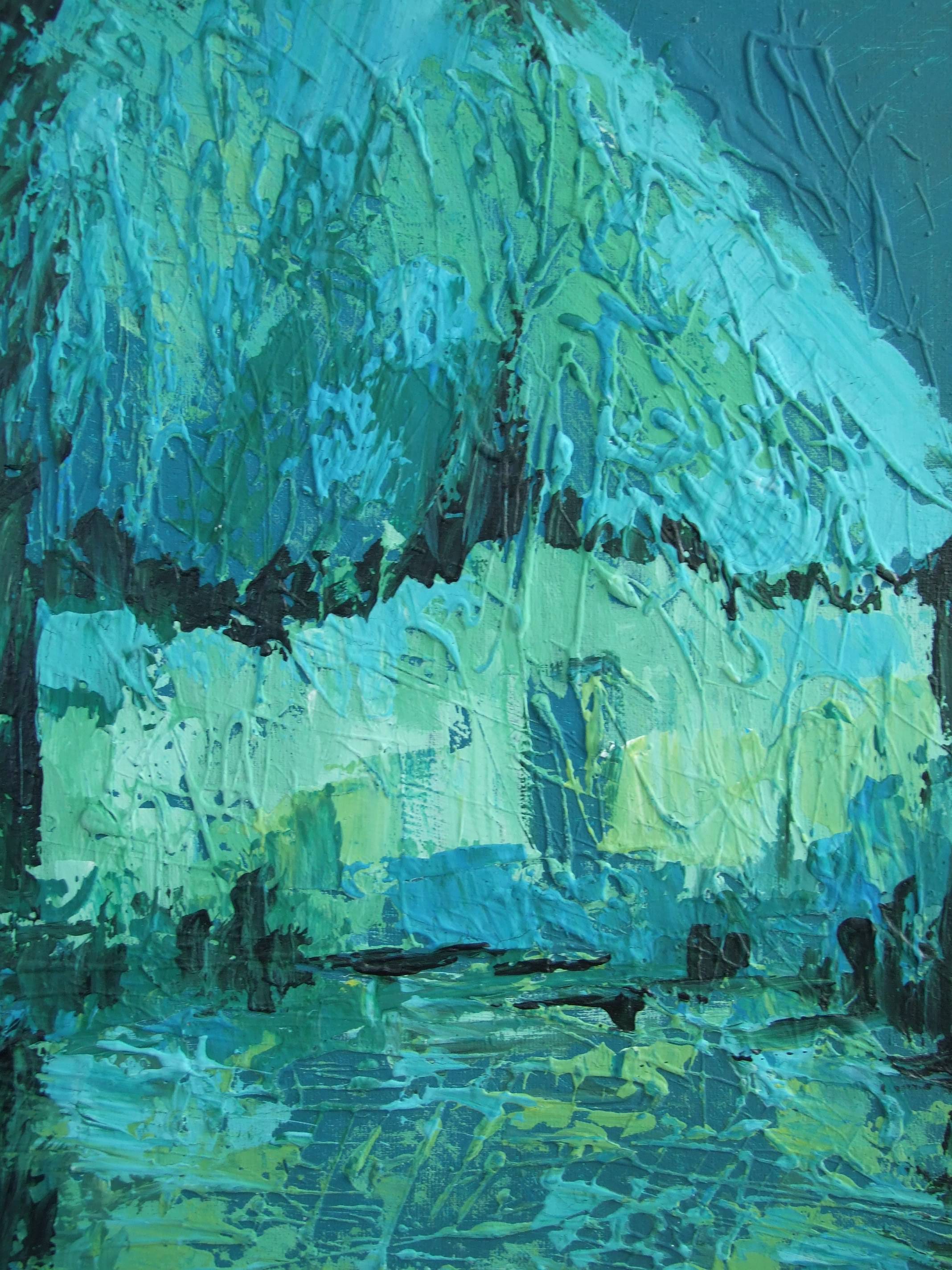 Obraz zatopiony jest w odcieniach zieleni i błękitu, co sprawia, że wygląda jak zaczarowany las. Ostre i miękkie pociągnięcia pędzla tworzą skomplikowaną kompozycję, w której abstrakcja spotyka się z naturą. Linia i struktura wprowadzają dynamikę, choć na pierwszy rzut oka wszystko wydaje się spokojne jak poranna mgła. Nastrój jest refleksyjny i tajemniczy. Czujesz się jak odkrywca w krainie marzeń, gdzie każdy zakątek skrywa opowieść. Efekt impasto, czyli grube warstwy farby, podkreśla teksturę i głębię. Patrząc na ten obraz, można niemal poczuć wilgoć liści pod palcami. To trochę jak oglądanie natury przez magiczne okulary – wszystko jest bardziej żywe i intensywne. Może ci się zdawać, że słyszysz szum drzew i śpiew ptaków. A może to tylko sound of silence tego miejsca? Dzieciak mógłby powiedzieć "To domek w lesie jak w bajce!". Obraz jest jak nieodkryta tajemnica, która kusi i przyciąga. Pozwala zatrzymać się na chwilę, zatopić w myślach, a potem... odpłynąć dalej.