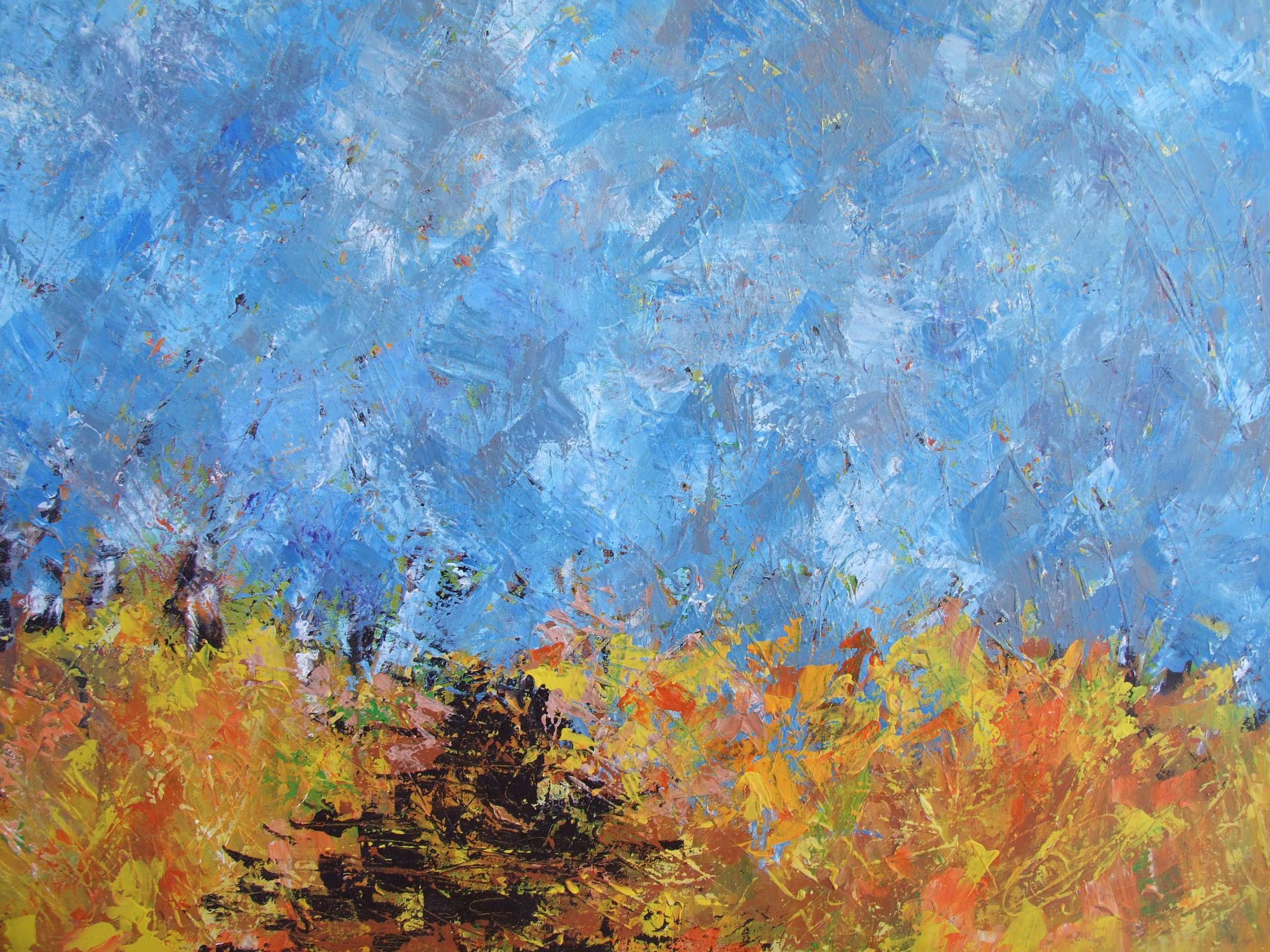Obraz promieniuje ciepłem i radością dzięki intensywności użytych kolorów. Dominują błękity nieba, rozmyte jakby dotknięciem wiatru, które przenikają się z soczystymi pomarańczami i żółciami u dołu kompozycji. Co za feeria barw! Całość przypomina beztroski letni dzień spędzony na łące pełnej kwiatów. Artysta z pewnością posłużył się techniką impastową, nanosząc farbę grubą warstwą, co nadaje obrazowi dynamiczną fakturę. Pociągnięcia pędzla są energiczne, czasem jakby od niechcenia, ale tworzą harmonijną całość. Atmosfera dzieła jest lekka, jakby mówiła: "Weź głęboki oddech i ciesz się chwilą". Nastrój ten wywołuje u odbiorcy przyjemne uczucie relaksu i uwolnienia od codziennych trosk. Styl obrazu jest swobodny, może nawet nieco abstrakcyjny, co pozostawia przestrzeń na osobiste interpretacje. Moje serce mówi: "Chciałbym tam być". Jedno zdanie jak z bajki: "To wygląda jak pole pełne kolorowych cukierków". Patrząc na ten obraz, czuję powiew przygody. Jest jak otwarte okno na świat pełen możliwości, gdzie lekkość bytu miesza się z głębią emocji. Aż chce się powiedzieć: "What a masterpiece!" Emocje, które budzi, są jak niezobowiązujące lato, które nigdy się nie kończy.