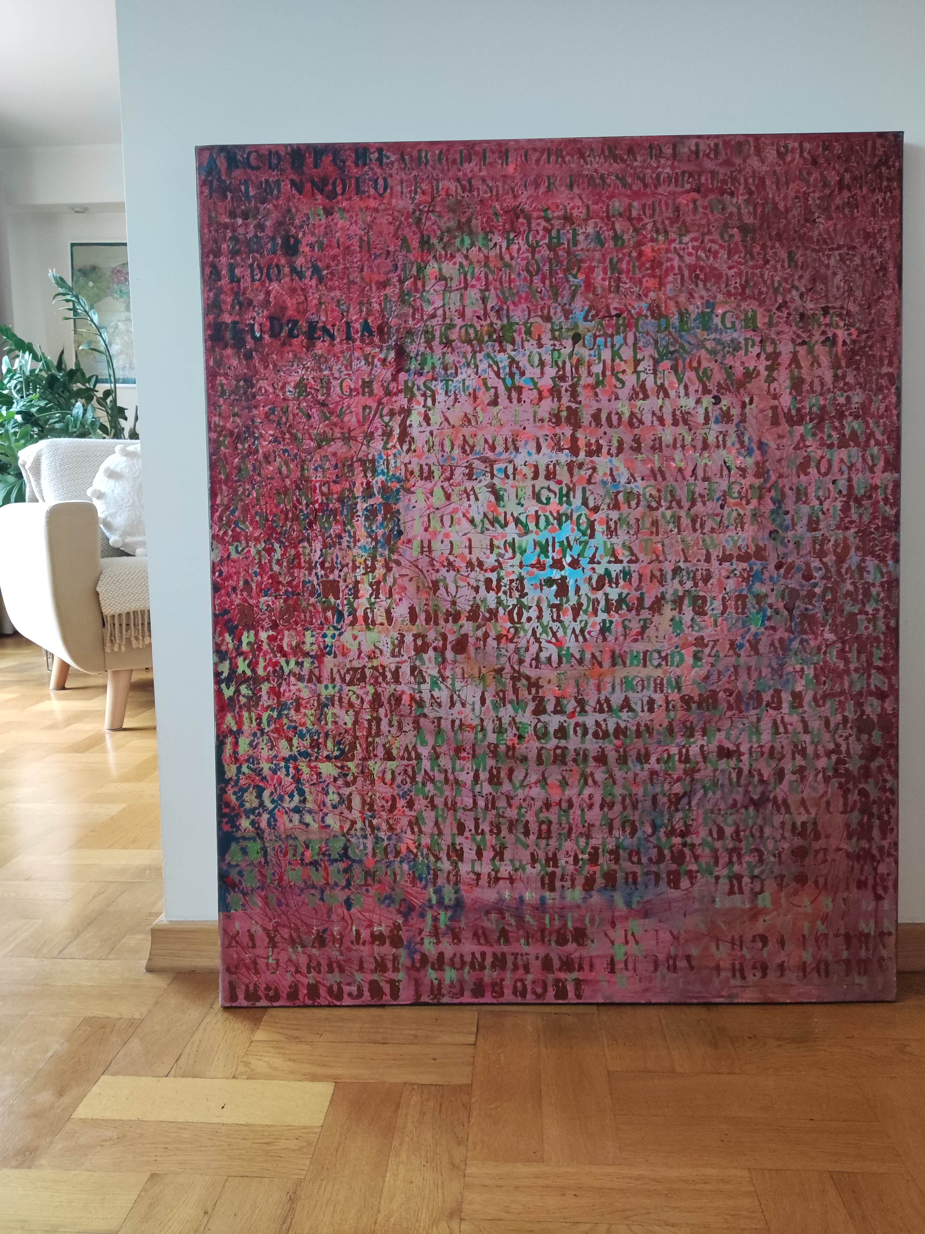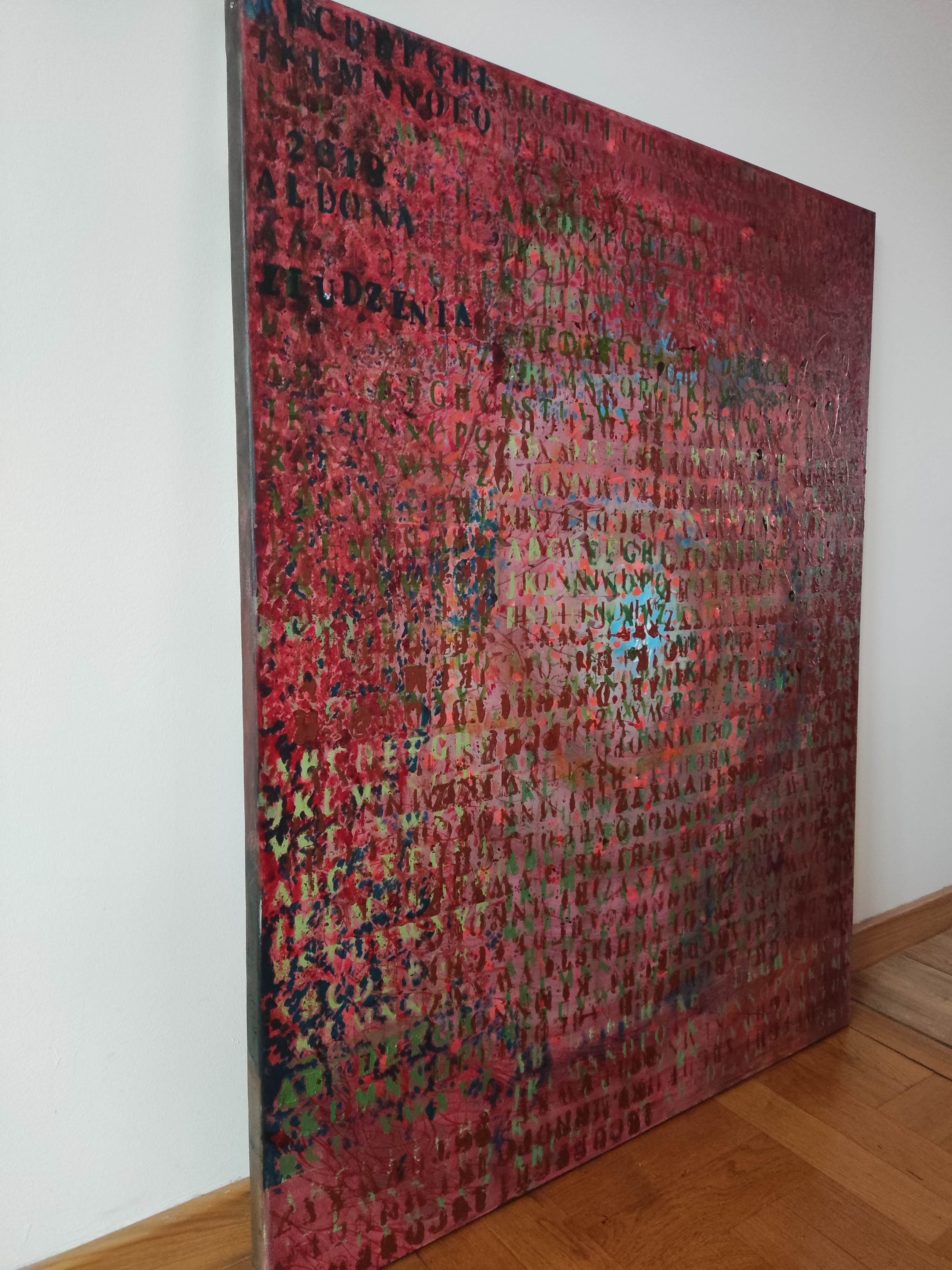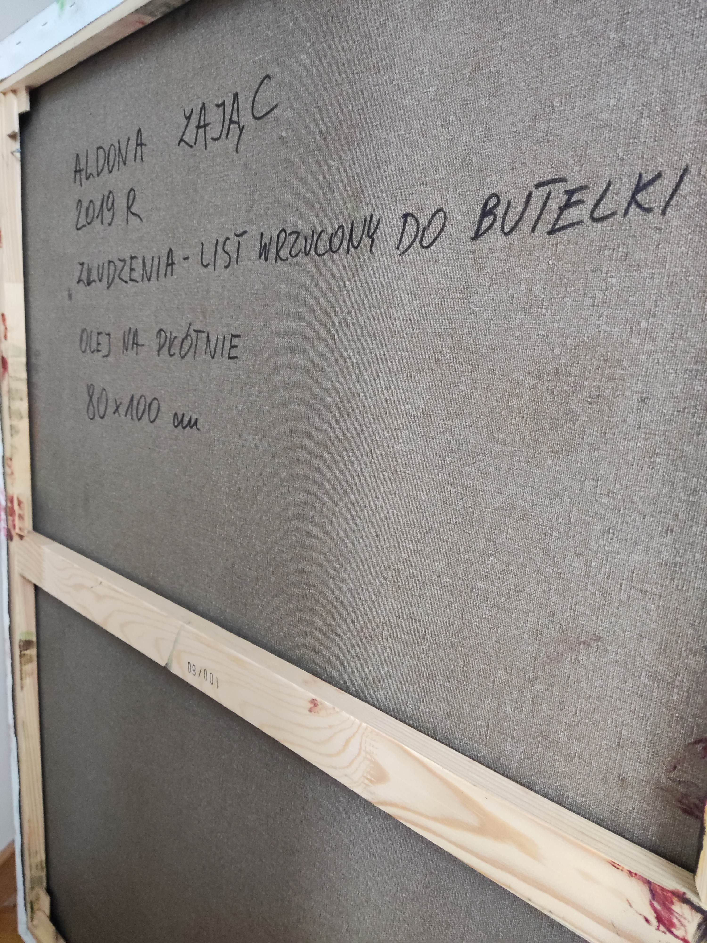 "Złudzenia czyli list wrzucony do butelki" to wyjątkowy obraz, który w mistrzowski sposób łączy abstrakcję i literacką narrację. Obraz został wykonany techniką olejną, a jego centralnym punktem jest światło, które zdaje się emanować z wnętrza butelki, w której schowany jest tajemniczy list. Na pierwszy rzut oka obraz przyciąga wzrok swoją trójwymiarowością, osiągniętą poprzez zastosowanie kilku planów i malowanie warstwami. To sprawia, że patrząc na dzieło, mamy wrażenie zanurzenia w głębokiej, tajemniczej przestrzeni, jakbyśmy sami spoglądali przez szyjkę butelki. Obraz składa się z liter pisanych odręcznie, tworzących abstrakcyjną kompozycję. Te litery, choć przypadkowe i chaotyczne, układają się w pisemną opowieść, której treść może wydawać się niezrozumiała. Jednak to właśnie stanowi o jego wyjątkowości – tak jak list znaleziony w butelce po latach, wyrzucony przez ocean, zawiera tajemnice, których sens może być trudny do odczytania, ale jednocześnie fascynujący i pełen ukrytych znaczeń. Nie staram się opowiedzieć konkretnej historii; treść liter nie ma znaczenia, gdyż sama ich forma i sposób, w jaki zostały namalowane, tworzą magiczną atmosferę tajemnicy i nieodgadnionej opowieści. Obraz ten to hołd dla ulotnych myśli i emocji, które zatracają się w czasie, a jednocześnie przypomnienie o nieprzewidywalnych ścieżkach, jakie przemierzają nasze słowa i historie.