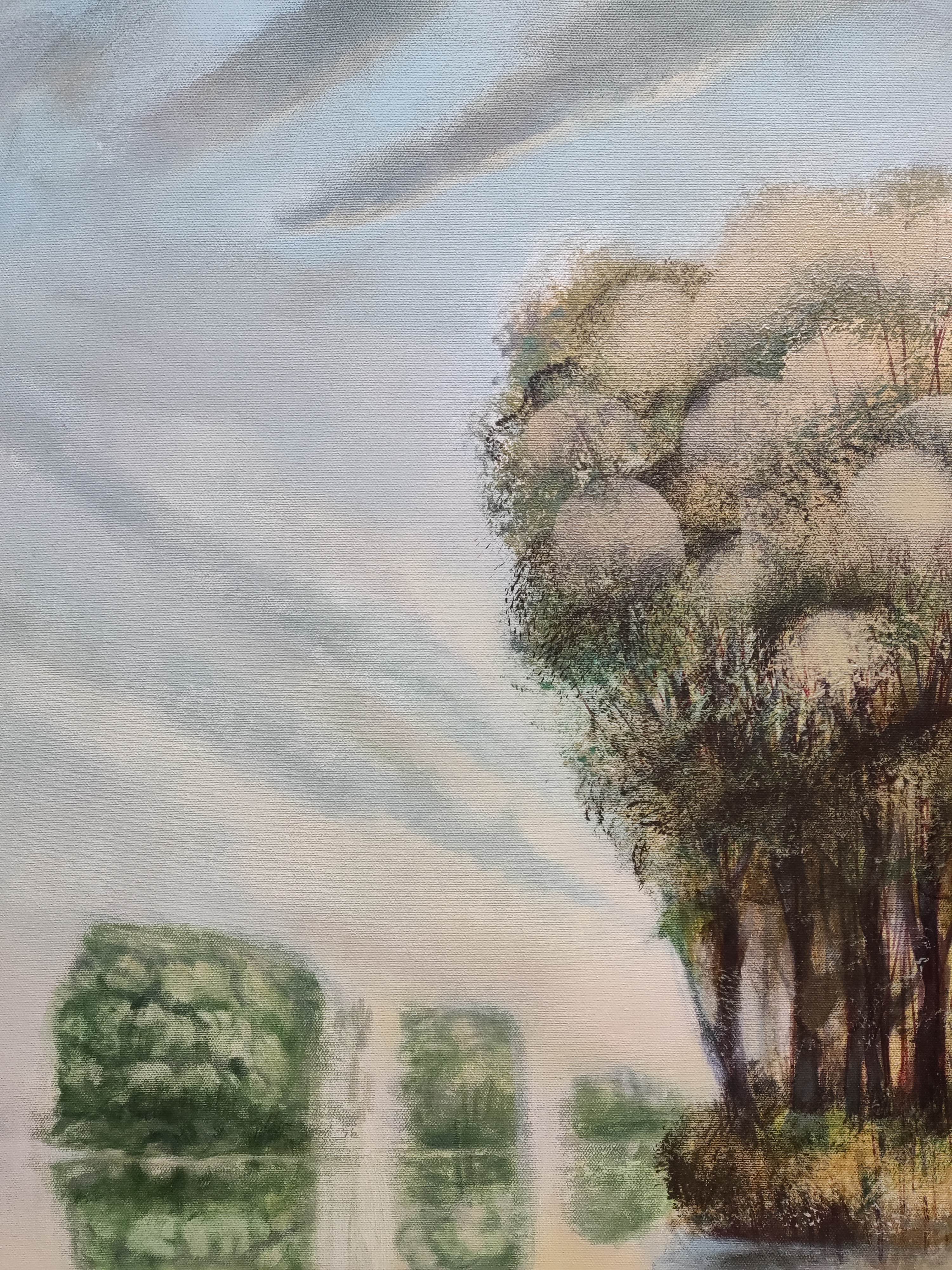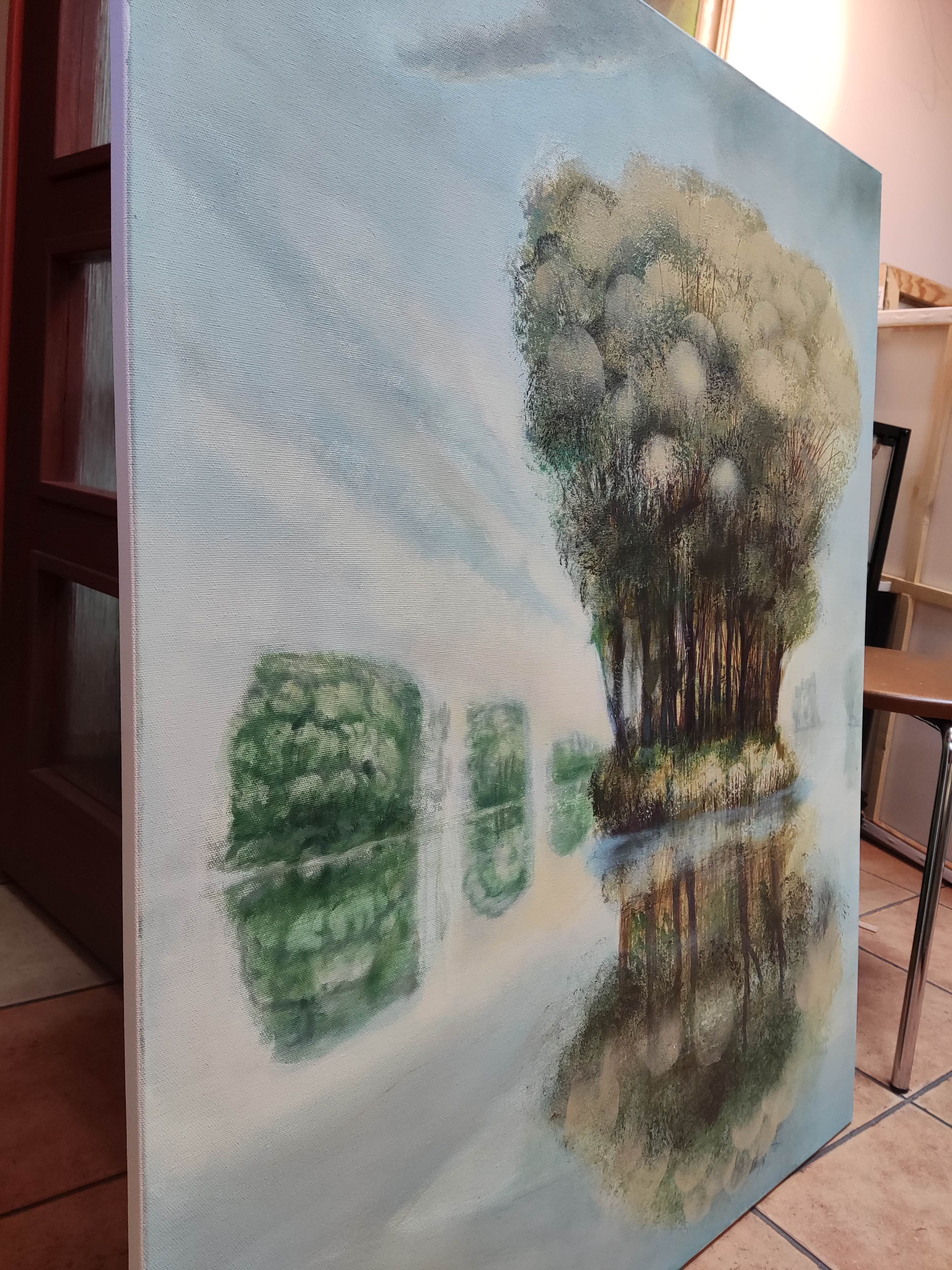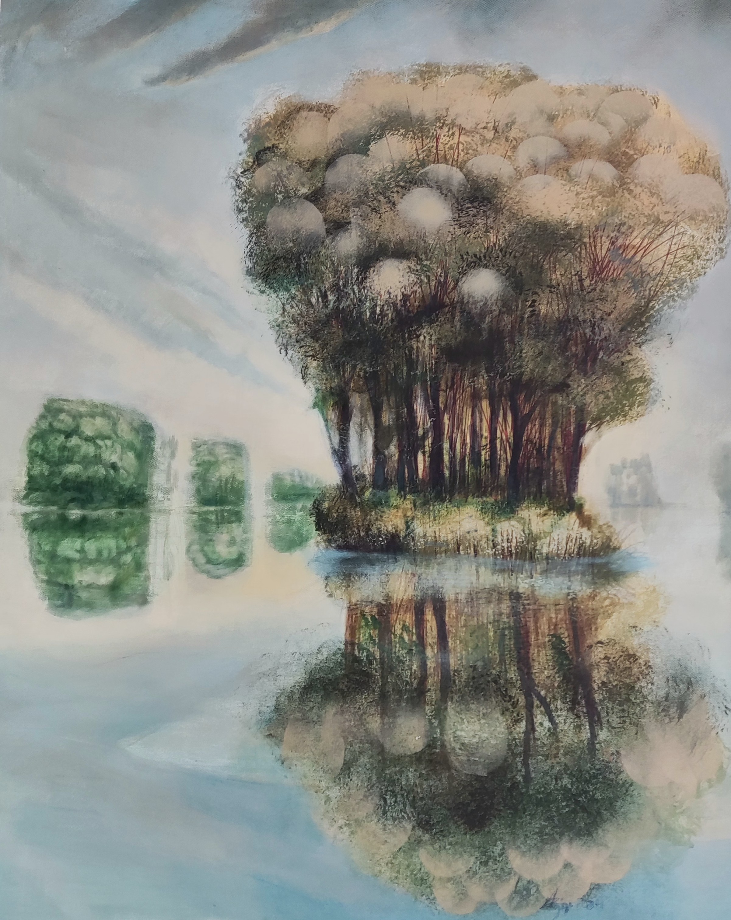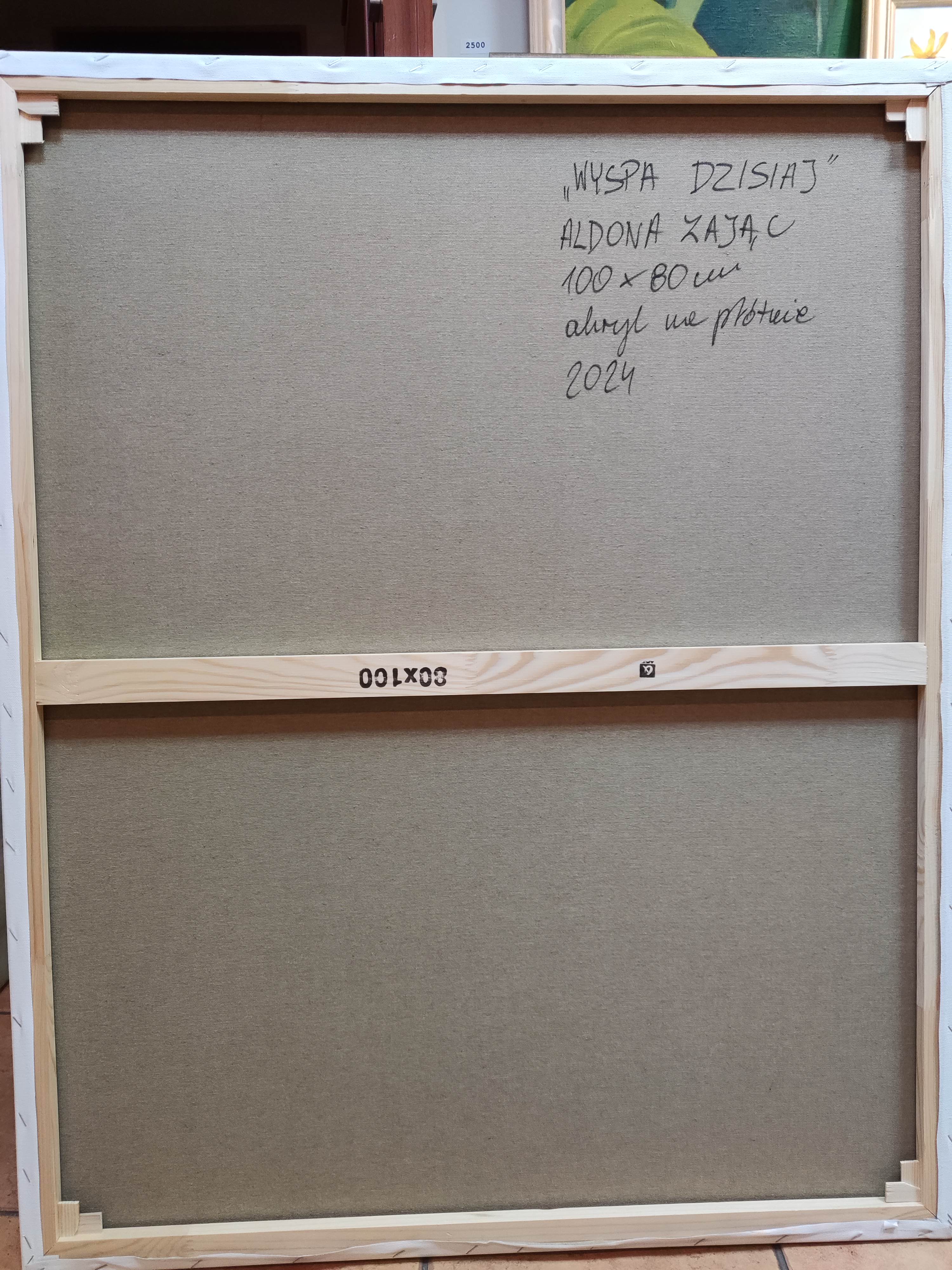 Obraz" Wyspa Dzisiaj" przedstawia malowniczy krajobraz, gdzie główną rolę odgrywa porośnięta drzewami wyspa o tej samej nazwie. Wyspa Dzisiaj, otoczona spokojnymi wodami, emanuje naturalnym pięknem i harmonią. W oddali subtelnie rysują się kontury trzech innych wysp, które noszą nazwy Wyspa Jutro, Wyspa Pojutrze oraz Wyspa Wczoraj. Te wyspy, choć nieco odległe, są widoczne na horyzoncie i zdają się być odbiciem Wyspy Dzisiaj. Każda z nich, podobnie jak główna wyspa, jest gęsto porośnięta drzewami, co sugeruje ciągłość i powtarzalność natury. Artysta stworzył ten pejzaż, aby skłonić do refleksji nad upływem czasu, cyklicznością przyrody oraz nieuchronnością zmian, które jednocześnie przynoszą poczucie stałości i wieczności. Obraz "Wyspa Dzisiaj" symbolizuje teraźniejszość, która jest widoczna i namacalna, podczas gdy wyspy na horyzoncie reprezentują przyszłość, z jej nieskończonymi możliwościami (Wyspa Jutro i Wyspa Pojutrze) oraz przeszłość, której ślady zawsze są obecne (Wyspa Wczoraj). Razem tworzą one kompleksowy obraz czasu, w którym każdy moment jest częścią całości.