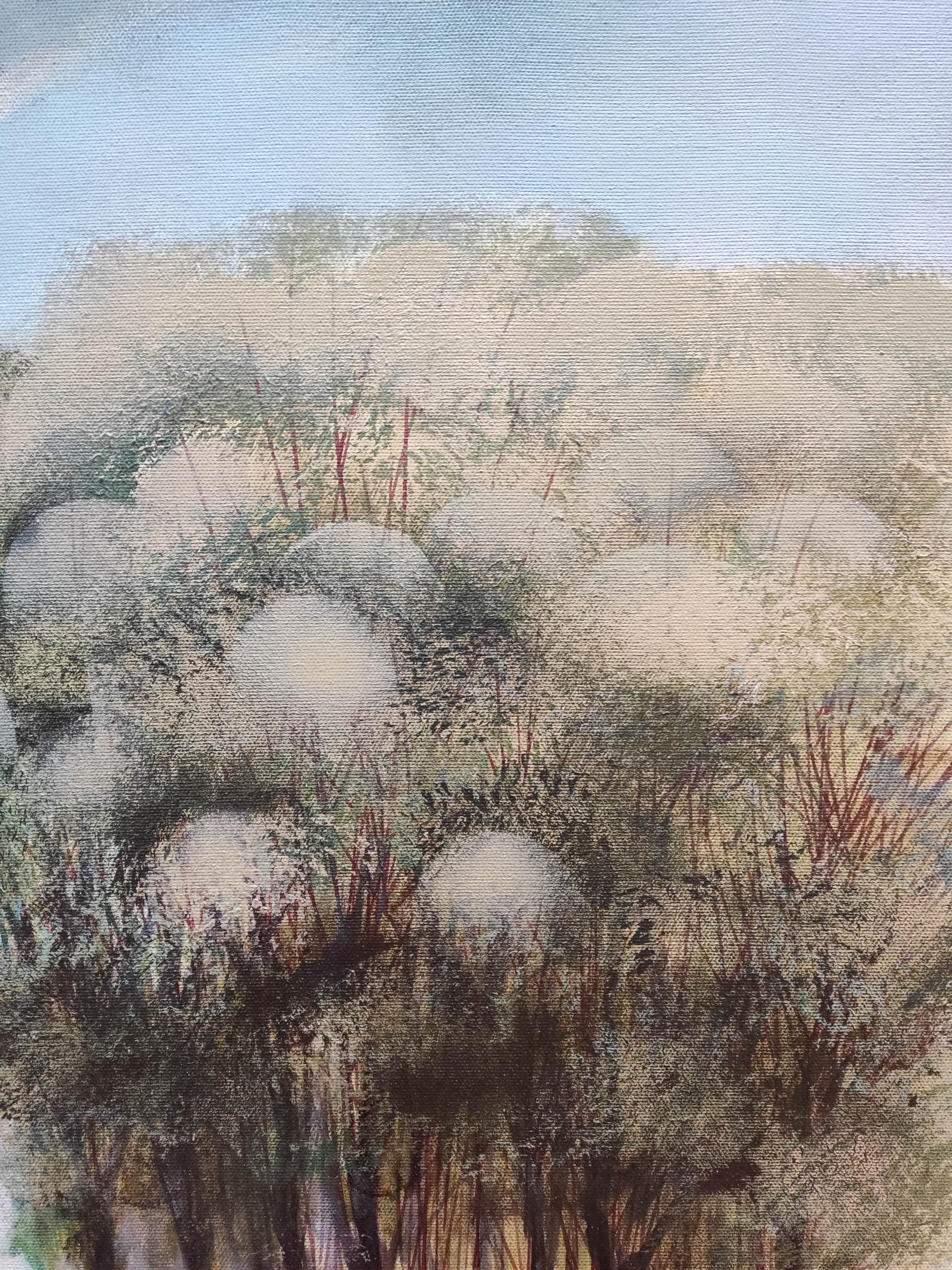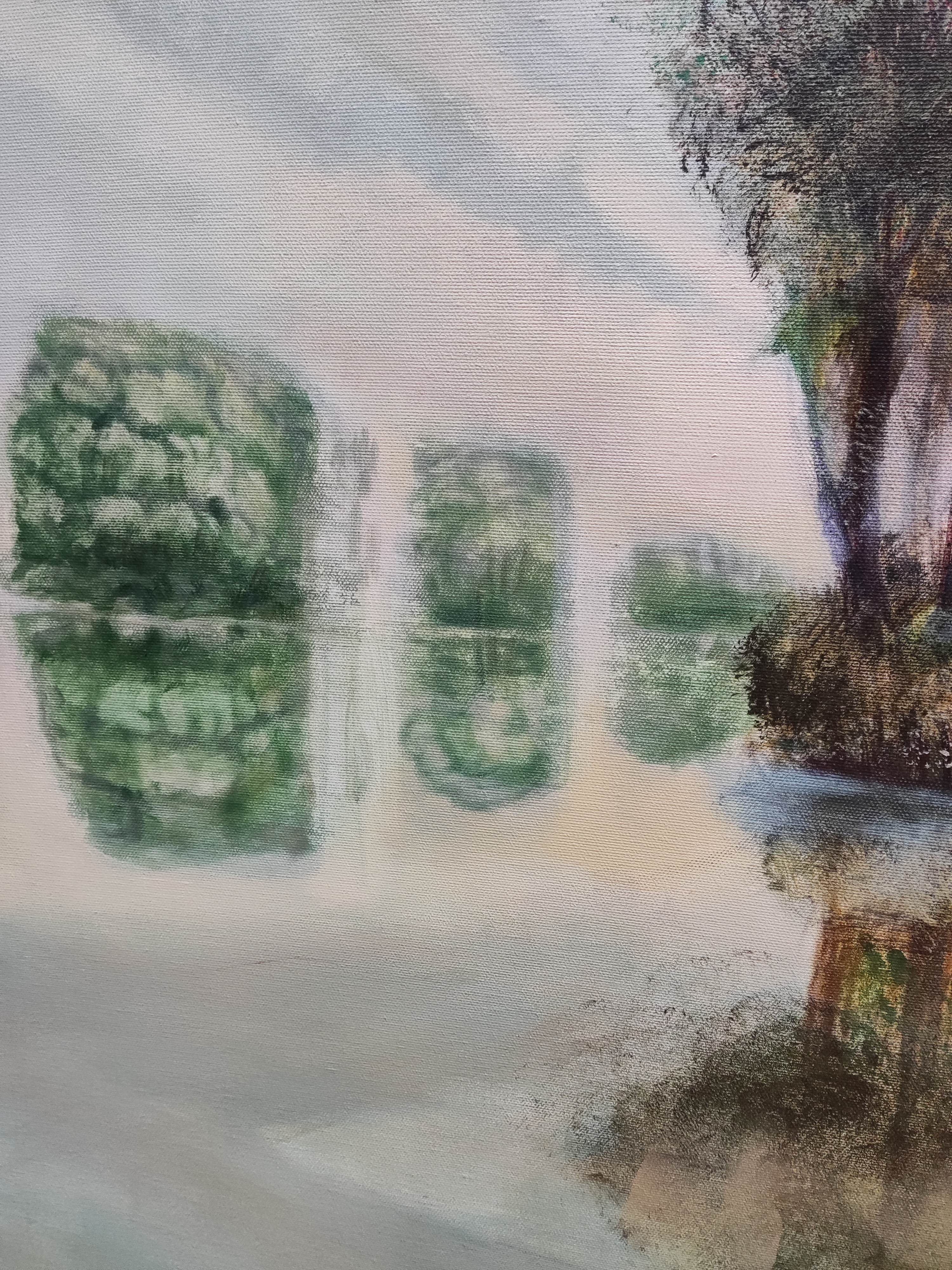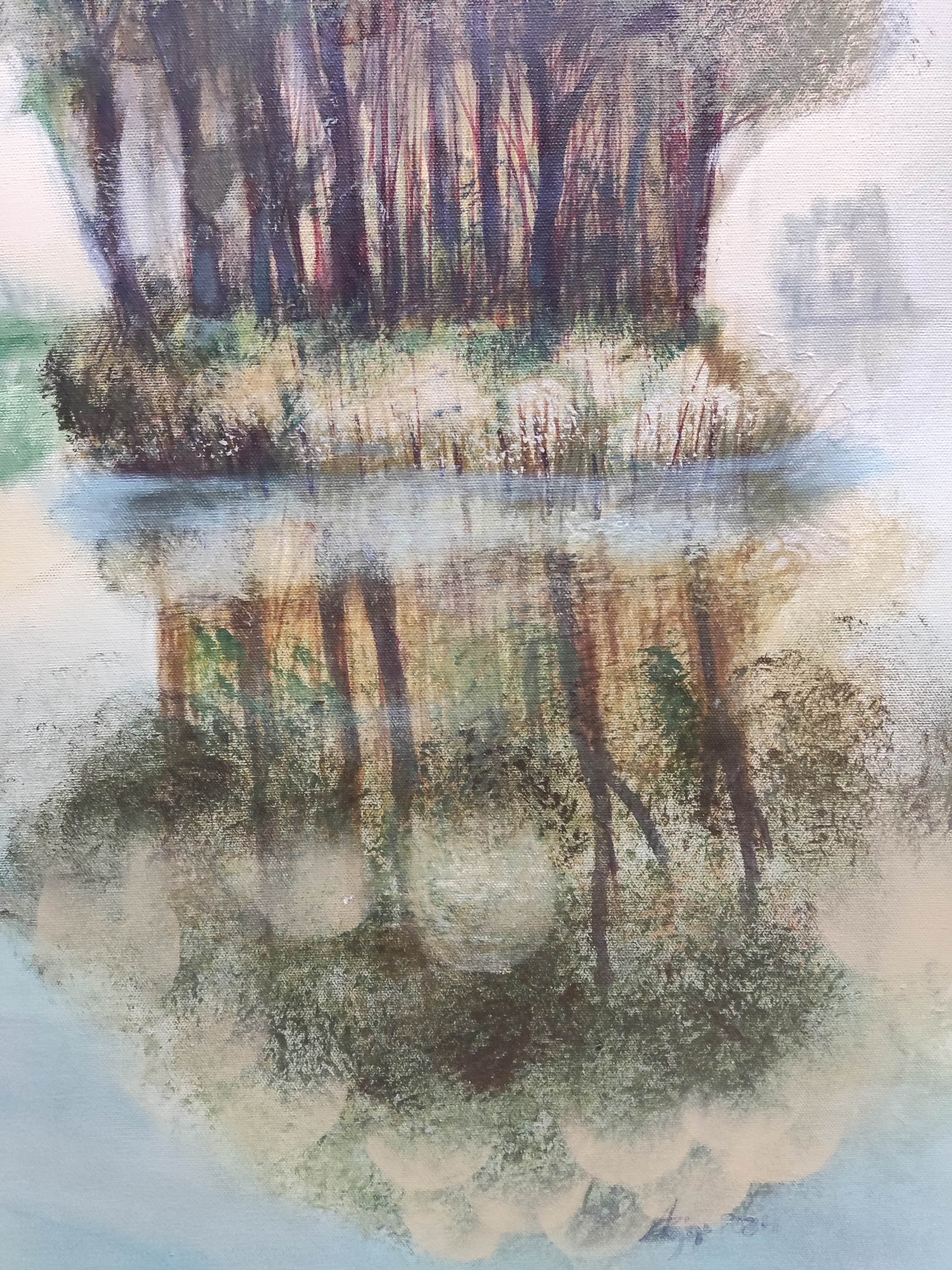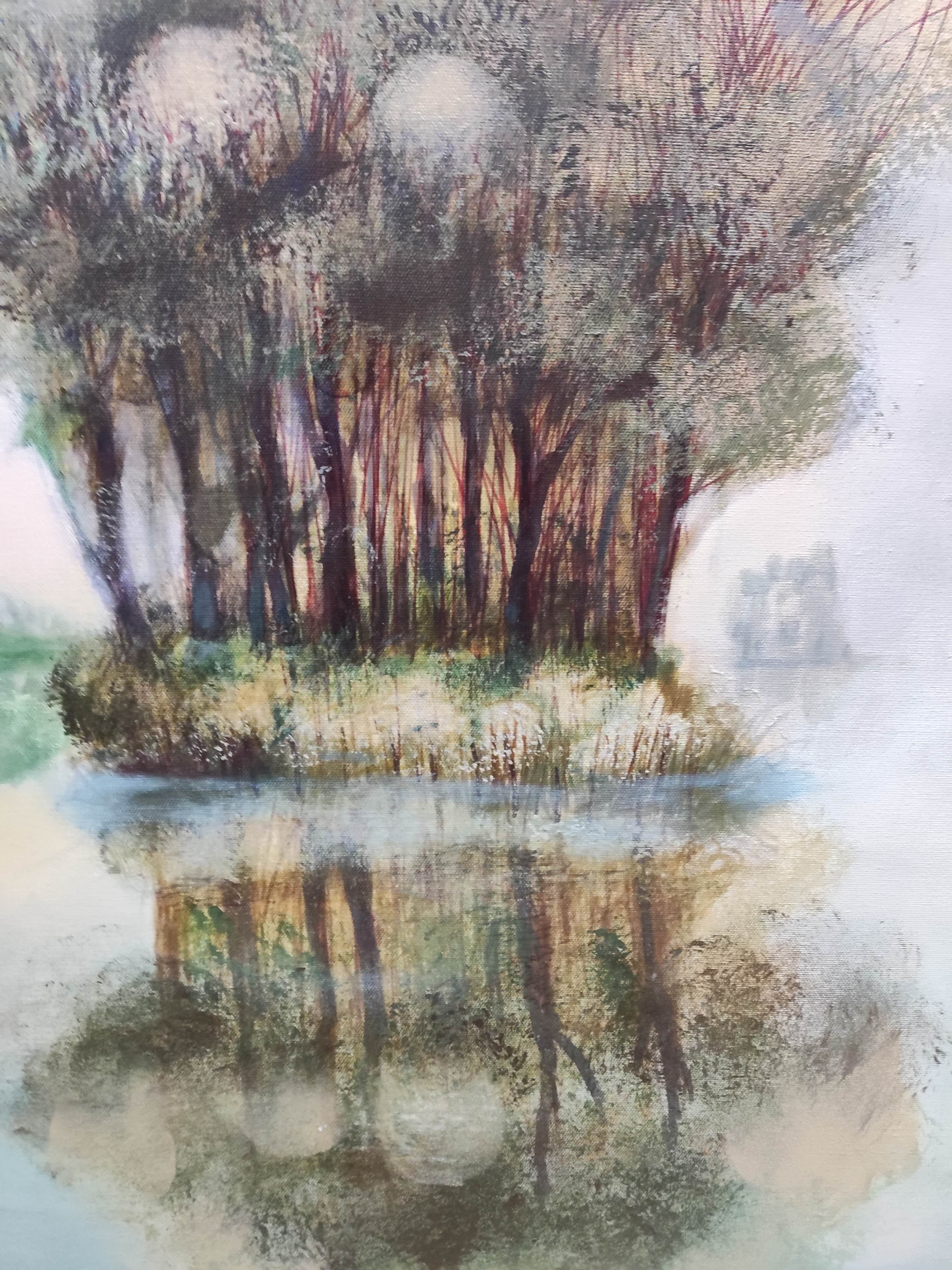 Obraz" Wyspa Dzisiaj" przedstawia malowniczy krajobraz, gdzie główną rolę odgrywa porośnięta drzewami wyspa o tej samej nazwie. Wyspa Dzisiaj, otoczona spokojnymi wodami, emanuje naturalnym pięknem i harmonią. W oddali subtelnie rysują się kontury trzech innych wysp, które noszą nazwy Wyspa Jutro, Wyspa Pojutrze oraz Wyspa Wczoraj. Te wyspy, choć nieco odległe, są widoczne na horyzoncie i zdają się być odbiciem Wyspy Dzisiaj. Każda z nich, podobnie jak główna wyspa, jest gęsto porośnięta drzewami, co sugeruje ciągłość i powtarzalność natury. Artysta stworzył ten pejzaż, aby skłonić do refleksji nad upływem czasu, cyklicznością przyrody oraz nieuchronnością zmian, które jednocześnie przynoszą poczucie stałości i wieczności. Obraz "Wyspa Dzisiaj" symbolizuje teraźniejszość, która jest widoczna i namacalna, podczas gdy wyspy na horyzoncie reprezentują przyszłość, z jej nieskończonymi możliwościami (Wyspa Jutro i Wyspa Pojutrze) oraz przeszłość, której ślady zawsze są obecne (Wyspa Wczoraj). Razem tworzą one kompleksowy obraz czasu, w którym każdy moment jest częścią całości.