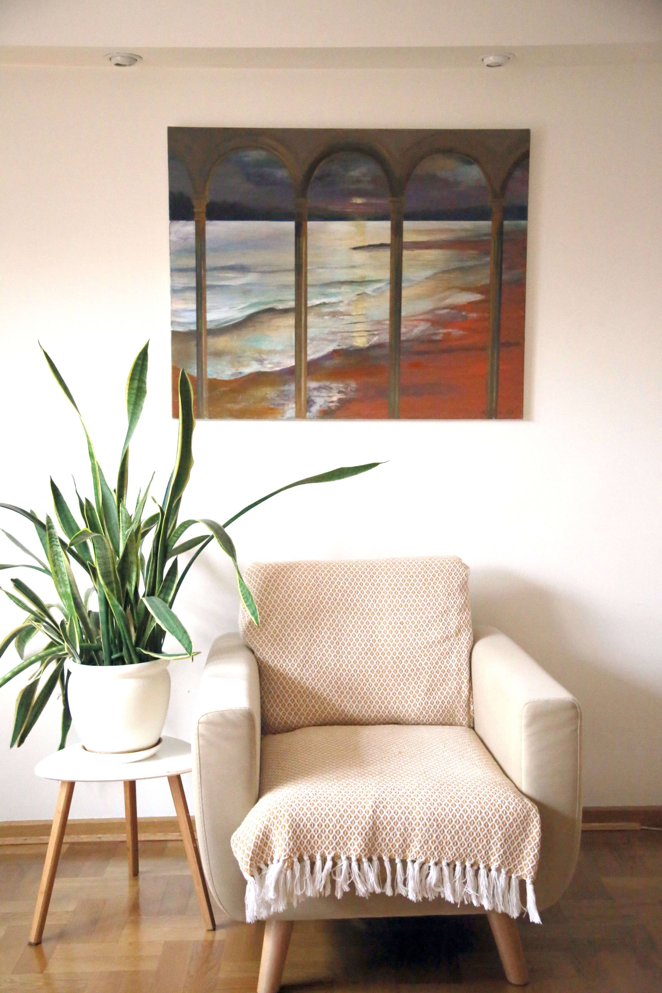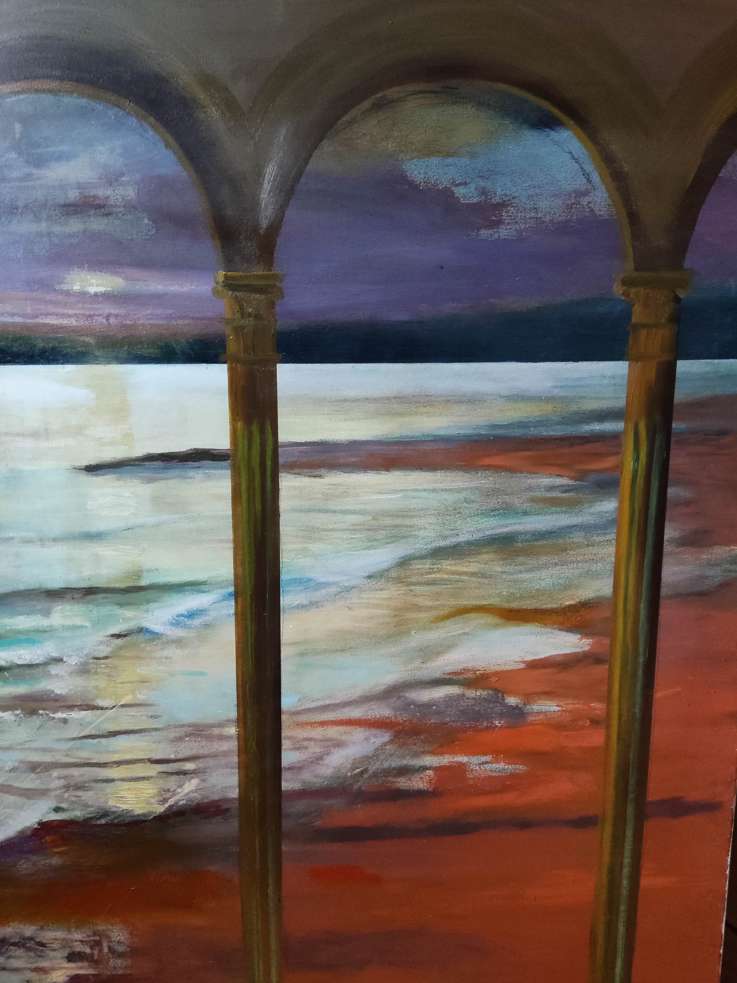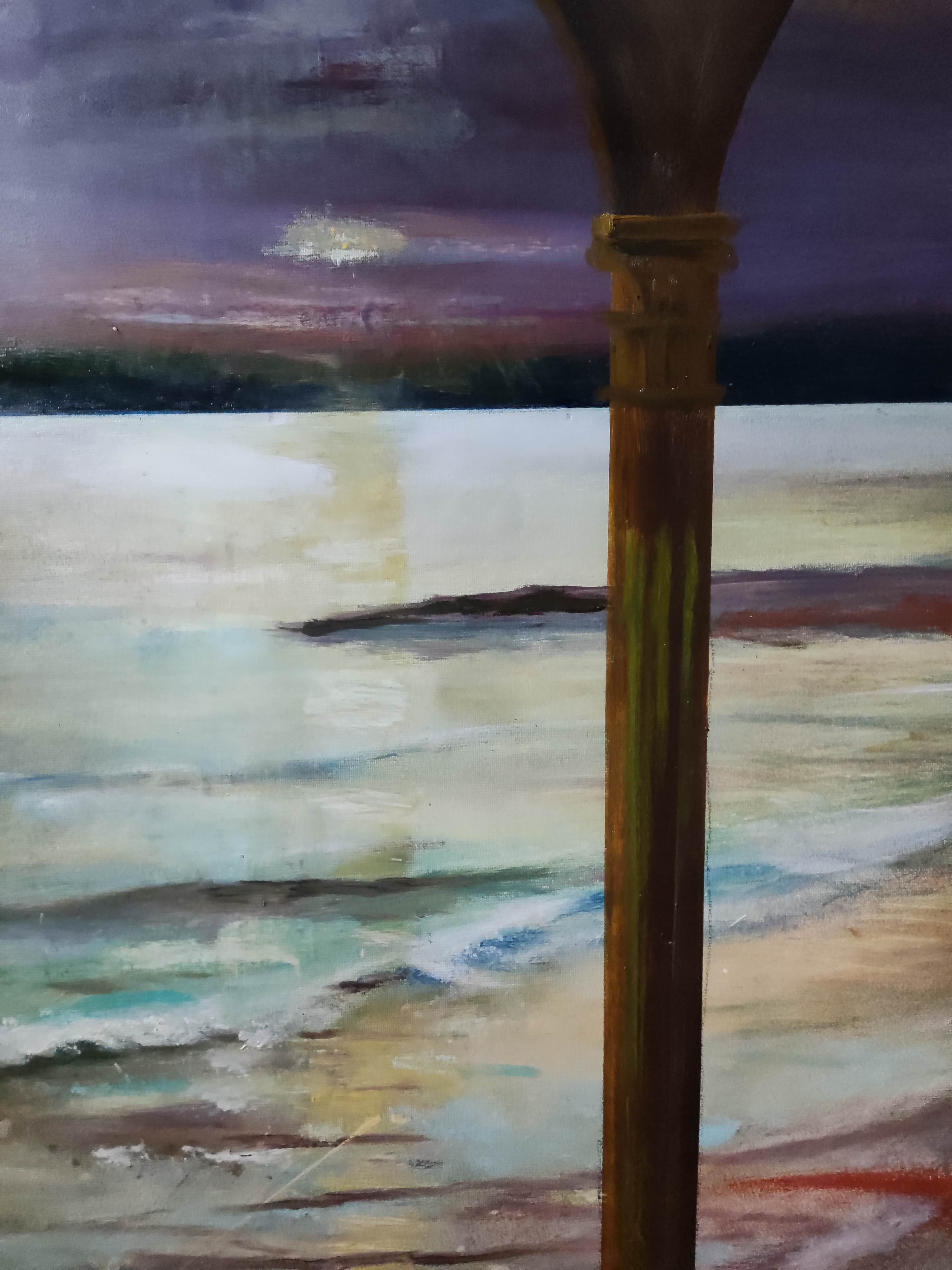 **Zmierzch Atlantycki** "Zmierzch Atlantycki" to obraz olejny, który przenosi widza w magiczny świat morskiego pejzażu, ukazując zachód słońca nad spokojnym oceanem. Kompozycja obrazu jest starannie przemyślana, z bogactwem detali, które oddają atmosferę nadchodzącej nocy. Na pierwszym planie znajdują się majestatyczne kolumny podtrzymujące eleganckie łuki, które zdają się być portalem do innego świata, pełnego tajemnicy i piękna. Kolory zachodzącego słońca, od ciepłych odcieni pomarańczu po głębokie fiolety, rozlewają się po niebie, tworząc niesamowity spektakl barw. Światło, delikatnie muskające powierzchnię wody, nadaje całej scenie niemalże eterycznego blasku. Fale oceanu, subtelnie falujące w tle, wprowadzają do kompozycji poczucie ruchu i spokoju jednocześnie. Kolumny i łuki na pierwszym planie dodają obrazowi architektonicznego wymiaru, sugerując obecność starożytnych cywilizacji, które kiedyś mogły istnieć nad brzegami tego oceanu. Te elementy nie tylko wzbogacają wizualnie kompozycję, ale także wprowadzają elementy historii i tajemnicy, które pobudzają wyobraźnię widza. "Zmierzch Atlantycki" to nie tylko przedstawienie piękna natury, ale także wyraz fascynacji artysty nad jej niekończącą się zmiennością i majestatem. To medytacja nad ulotnością chwil i potęgą przyrody, która nieustannie inspiruje i zachwyca swoją nieskończoną różnorodnością.