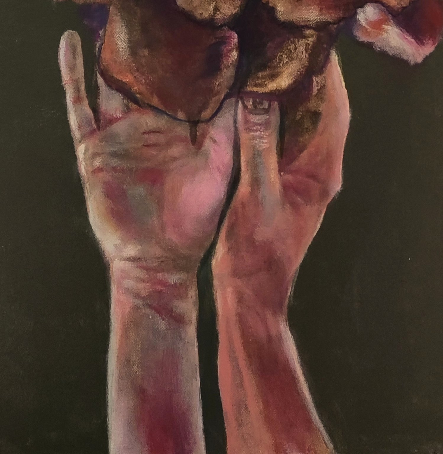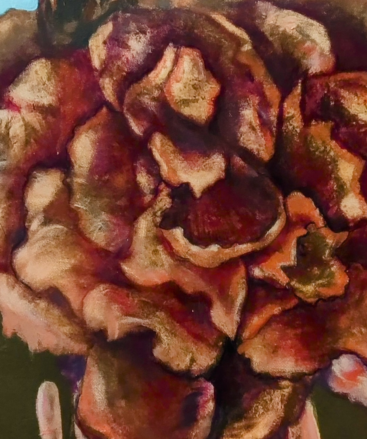 "Wróbel widzi więcej" to obraz, który wciąga widza w niezwykłą, symboliczną podróż między rzeczywistościami. Na pierwszym planie widzimy dłonie delikatnie trzymające różę, pełną życia i piękna. . Róża staje się tutaj symbolem kruchego piękna, być może uczuć lub marzeń, które wymagają ochrony. Tło obrazu to jednolita powierzchnia która zmienia się i ukazują się połyskujące fragmenty lisci, kryje w sobie niespodziankę – dwie wycięte w kształcie róży dziury. Przez te otwory widać jasne, błękitne niebo z miękkimi, białymi chmurami. To niebo zdaje się być zaproszeniem do innego świata, bardziej eterycznego i transcendentalnego. W jednej z dziur siedzi wróbel, maleńki obserwator, który spogląda w stronę ręki i róży. W jego postawie czuć coś więcej niż zwykłą ciekawość – wygląda, jakby zaglądał do innej rzeczywistości, badając granice między tym, co materialne, a tym, co duchowe. Obraz zdaje się mówić o przenikaniu się różnych wymiarów życia. Ręce trzymają różę – symbol ziemskiego piękna – ale wróbel, patrząc przez dziurę w tle, dostrzega coś więcej, coś poza granicami tego, co widzialne. Czy to przeszłość? Czy przyszłość? A może metafora ludzkiej wyobraźni i zdolności do spoglądania poza to, co namacalne? "Wróbel widzi więcej" porusza pytania o nasze spojrzenie na świat – czy widzimy tylko to, co przed nami, czy potrafimy dostrzec ukryte głębie? Wróbel jest tutaj przewodnikiem, symbolem uważności i ciekawości, zachęcającym nas, byśmy spojrzeli na rzeczywistość w nowy sposób, pełen refleksji i otwartości.