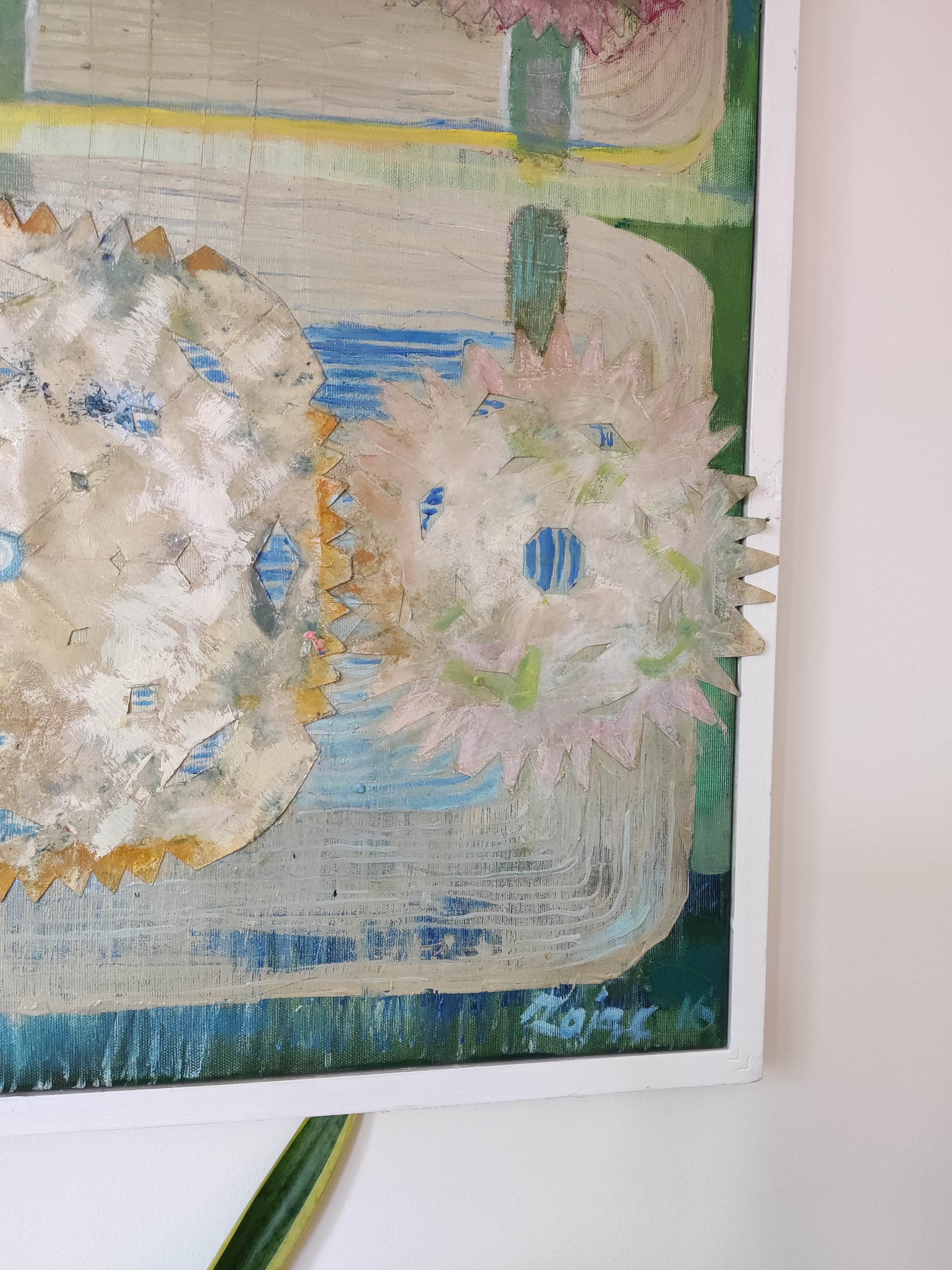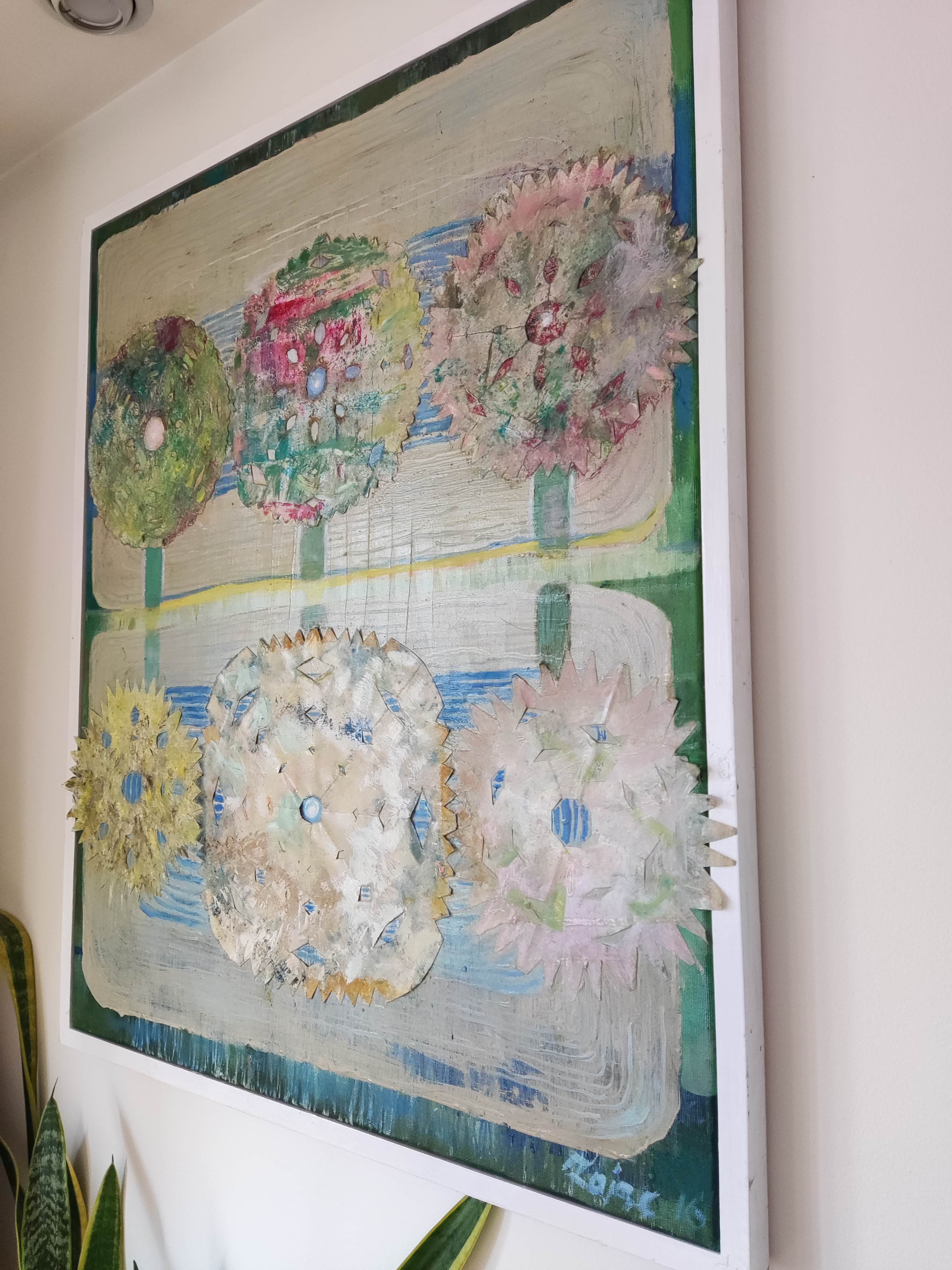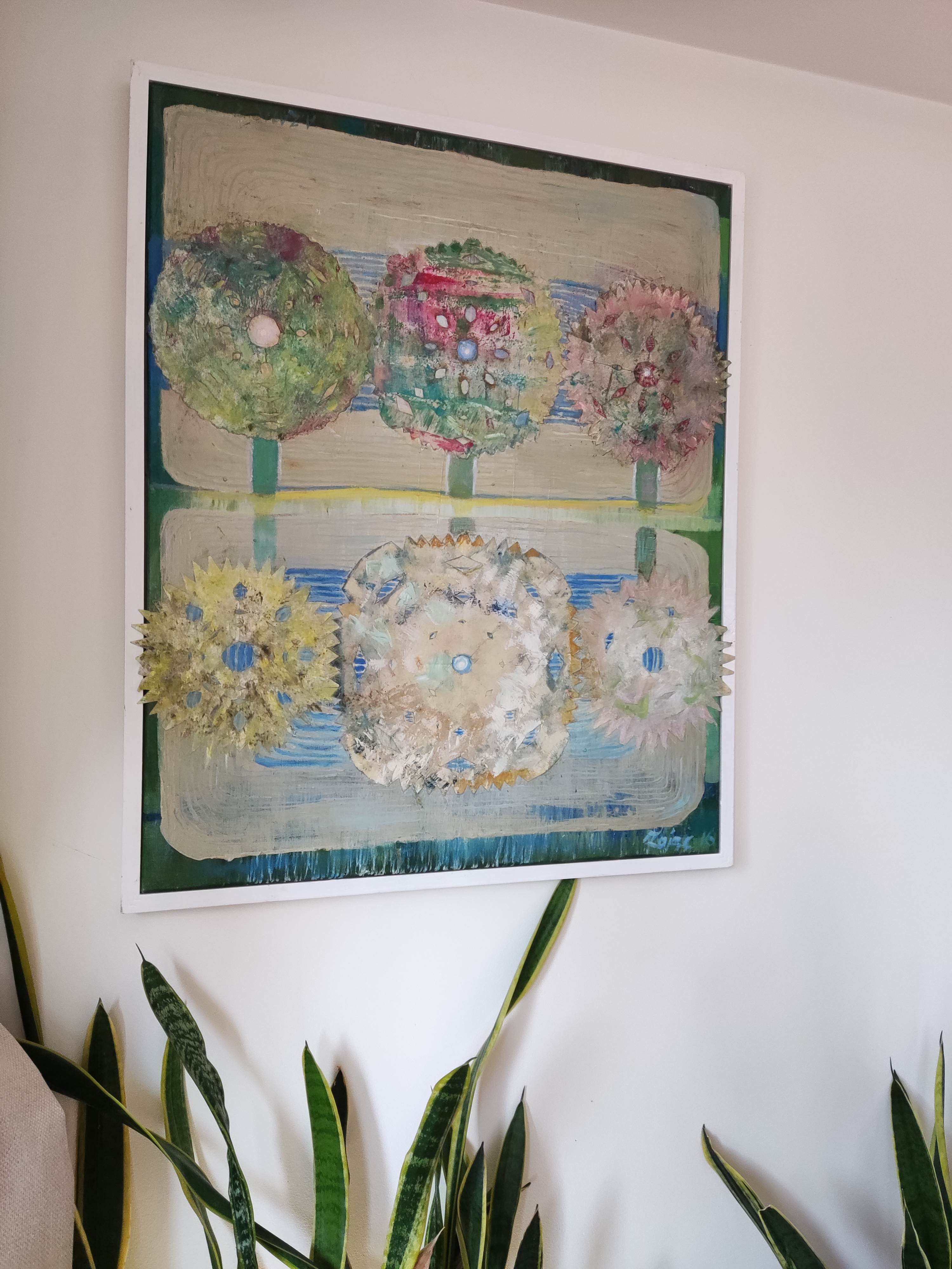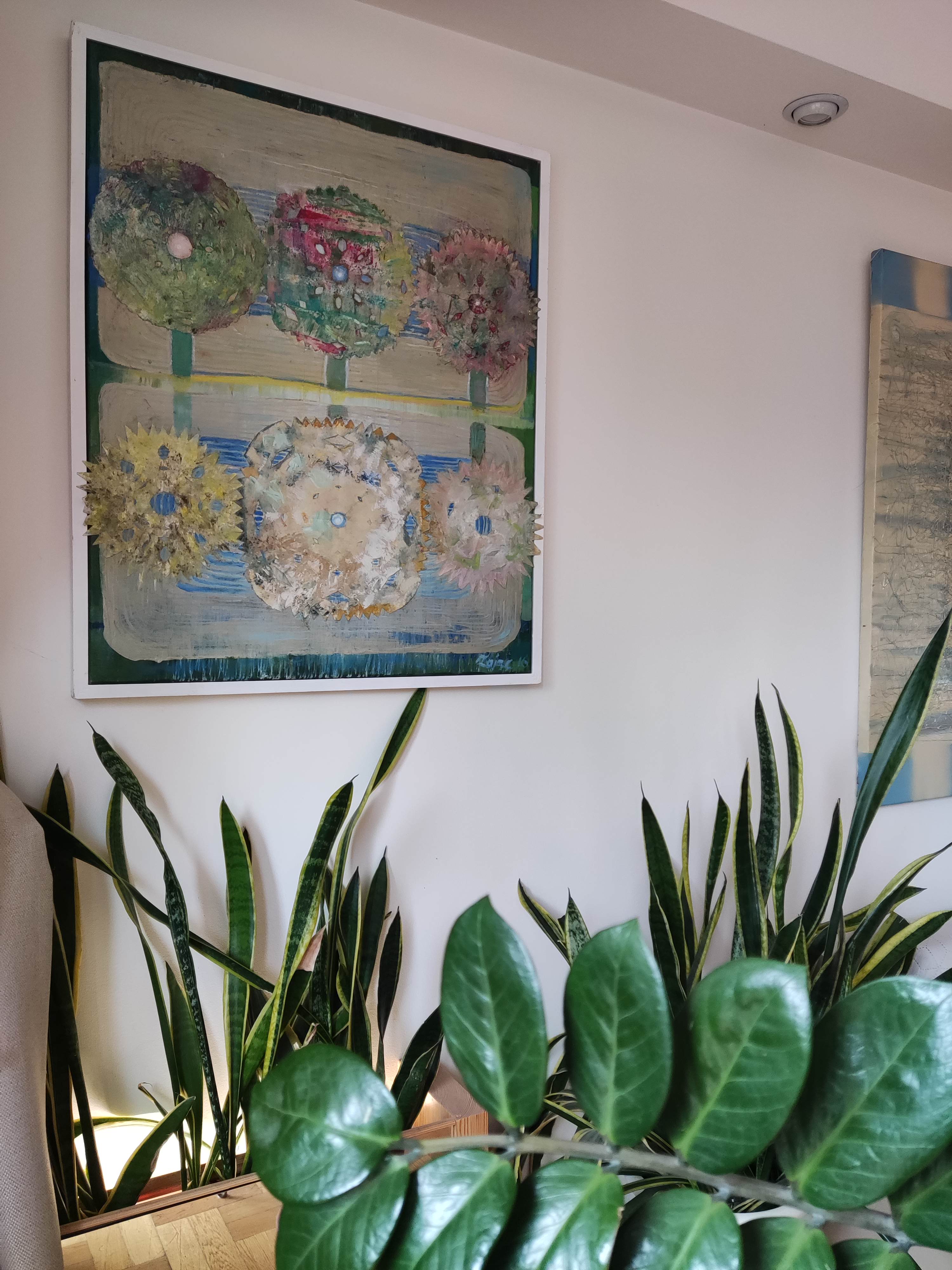 "Odwrócony" to obraz olejny, który wprowadza widza w świat fantazyjnego pejzażu, pełnego subtelnych odniesień do łowickiej wycinanki i tradycyjnego pejzażu łowickiego. Dzieło jest utrzymane w pastelowych barwach, z dominującymi zgaszonymi odcieniami błękitów i żółci, co nadaje mu delikatności i spokoju. Centralnym elementem obrazu jest horyzont, który przebiega przez środek kompozycji, dzieląc ją na dwie części. Horyzont ten jest jednocześnie granicą, jak i lustrem, w którym odbijają się drzewa uzyskane z wycinanek. Te fantazyjne sylwetki drzew tworzą iluzję symetrii i głębi, a ich odbicia wprowadzają do obrazu element surrealizmu i magii. Odwołania do łowickiej wycinanki są widoczne w stylizowanych kształtach drzew i w ogólnej kompozycji, która nawiązuje do tradycyjnych ludowych motywów. Te elementy łączą się z abstrakcyjnym pejzażem, tworząc harmonijną i oryginalną całość. "Odwrócony" to obraz, który zachwyca swoją delikatnością i głębią. Jest to dzieło, które doskonale wpisuje się w każde wnętrze, dodając mu subtelnego uroku i spokoju. Dzięki swojej pastelowej kolorystyce i unikalnej kompozycji, obraz ten wprowadza do przestrzeni elementy łowickiej tradycji w nowoczesnym, abstrakcyjnym wydaniu. Obraz posiada ramę drewniana pomalowaną na kolor biały. Obraz zabezpieczony jest werniksem przeciwdziałającym blaknięciu kolorów.