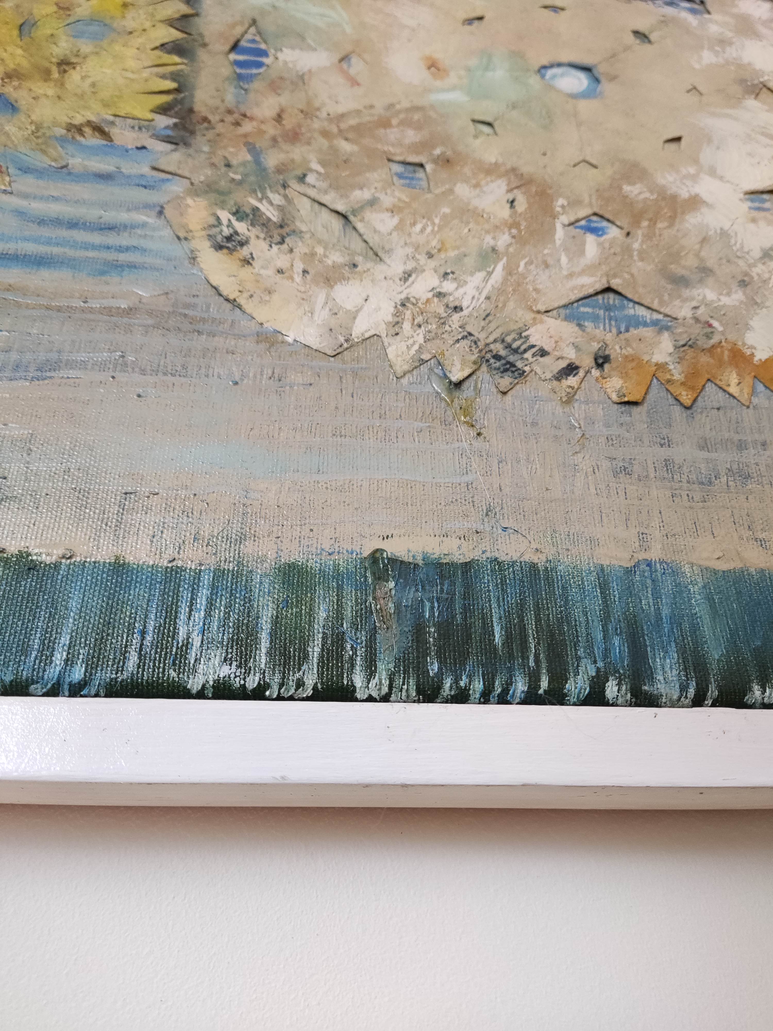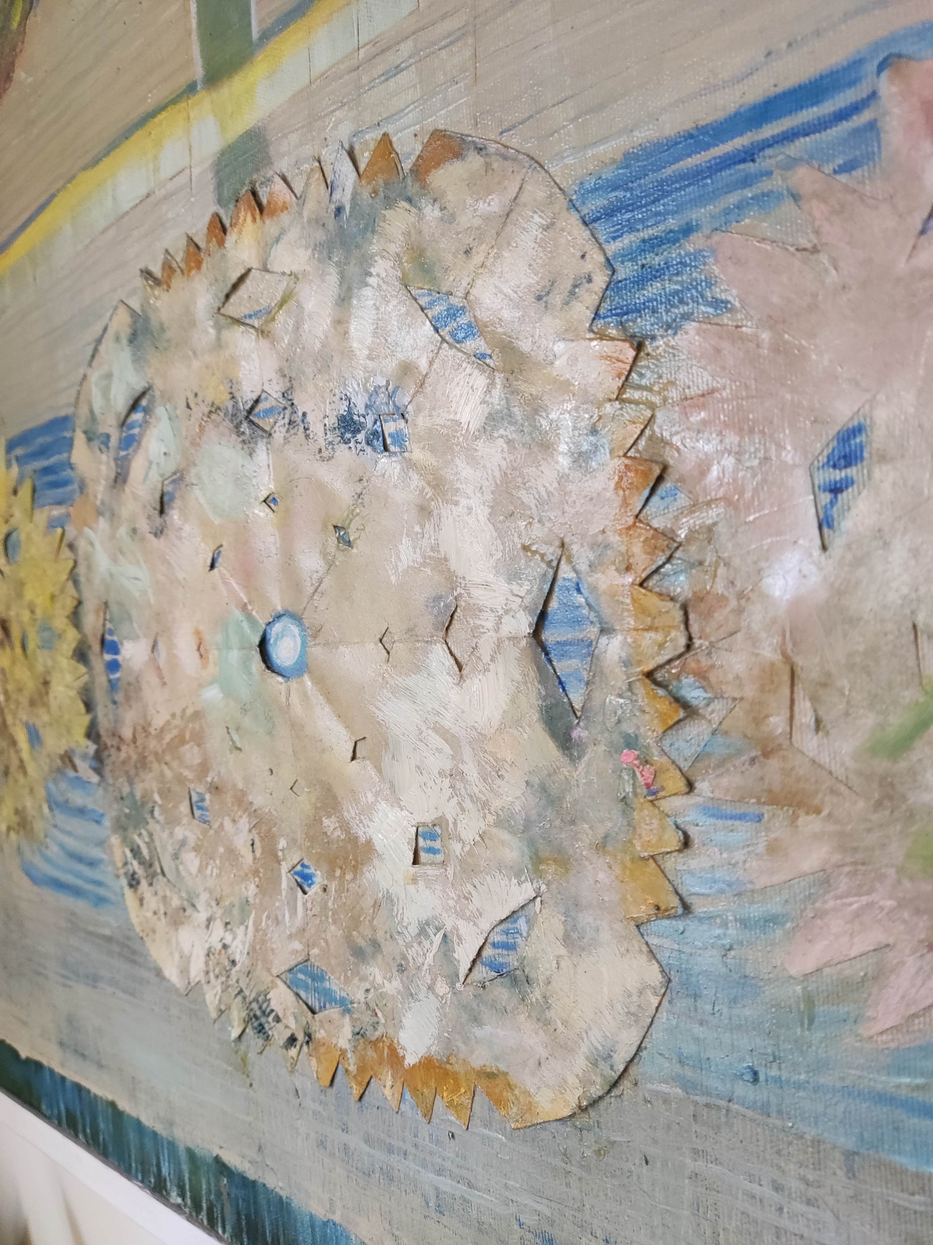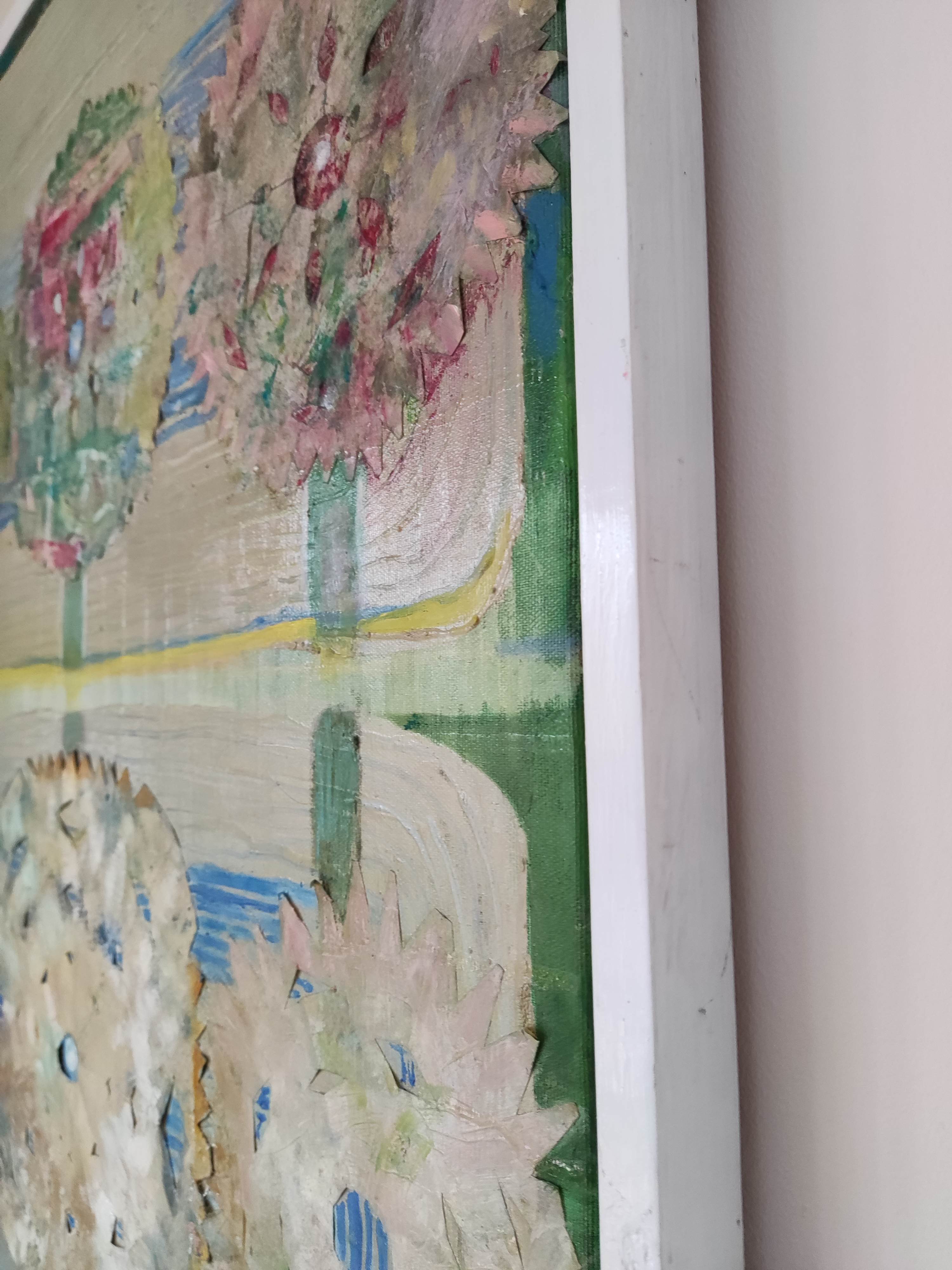 "Odwrócony" to obraz olejny, który wprowadza widza w świat fantazyjnego pejzażu, pełnego subtelnych odniesień do łowickiej wycinanki i tradycyjnego pejzażu łowickiego. Dzieło jest utrzymane w pastelowych barwach, z dominującymi zgaszonymi odcieniami błękitów i żółci, co nadaje mu delikatności i spokoju. Centralnym elementem obrazu jest horyzont, który przebiega przez środek kompozycji, dzieląc ją na dwie części. Horyzont ten jest jednocześnie granicą, jak i lustrem, w którym odbijają się drzewa uzyskane z wycinanek. Te fantazyjne sylwetki drzew tworzą iluzję symetrii i głębi, a ich odbicia wprowadzają do obrazu element surrealizmu i magii. Odwołania do łowickiej wycinanki są widoczne w stylizowanych kształtach drzew i w ogólnej kompozycji, która nawiązuje do tradycyjnych ludowych motywów. Te elementy łączą się z abstrakcyjnym pejzażem, tworząc harmonijną i oryginalną całość. "Odwrócony" to obraz, który zachwyca swoją delikatnością i głębią. Jest to dzieło, które doskonale wpisuje się w każde wnętrze, dodając mu subtelnego uroku i spokoju. Dzięki swojej pastelowej kolorystyce i unikalnej kompozycji, obraz ten wprowadza do przestrzeni elementy łowickiej tradycji w nowoczesnym, abstrakcyjnym wydaniu. Obraz posiada ramę drewniana pomalowaną na kolor biały. Obraz zabezpieczony jest werniksem przeciwdziałającym blaknięciu kolorów.