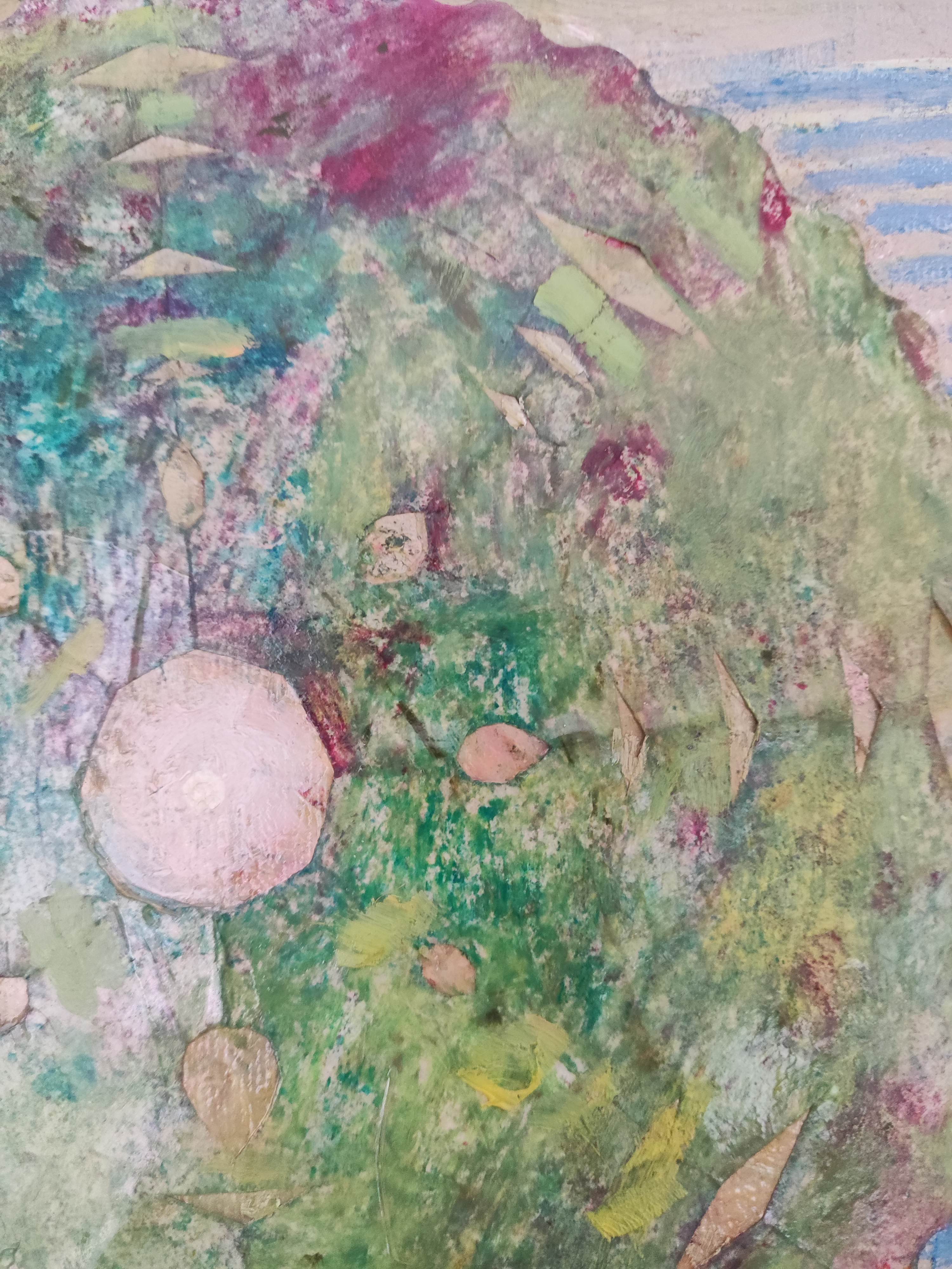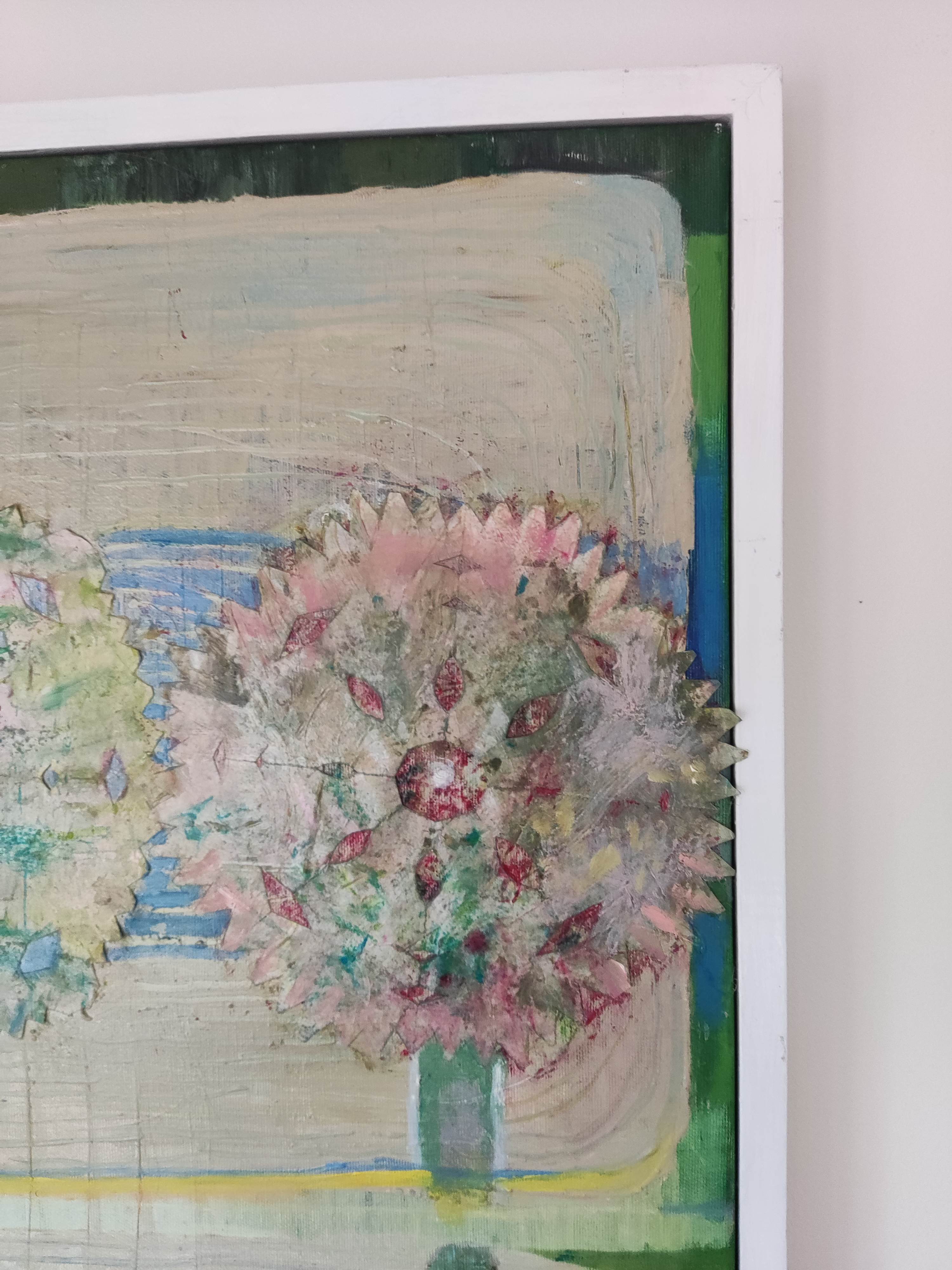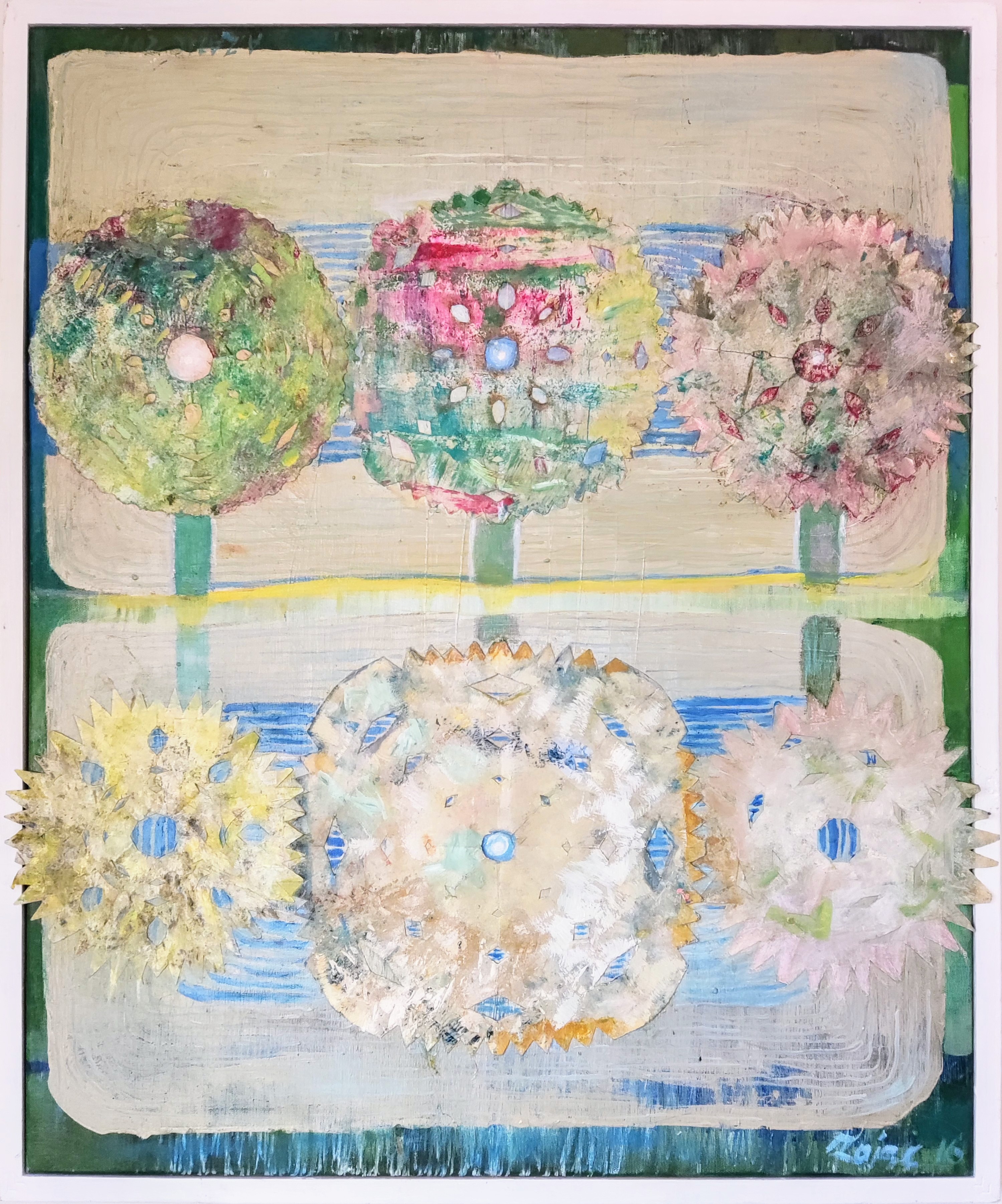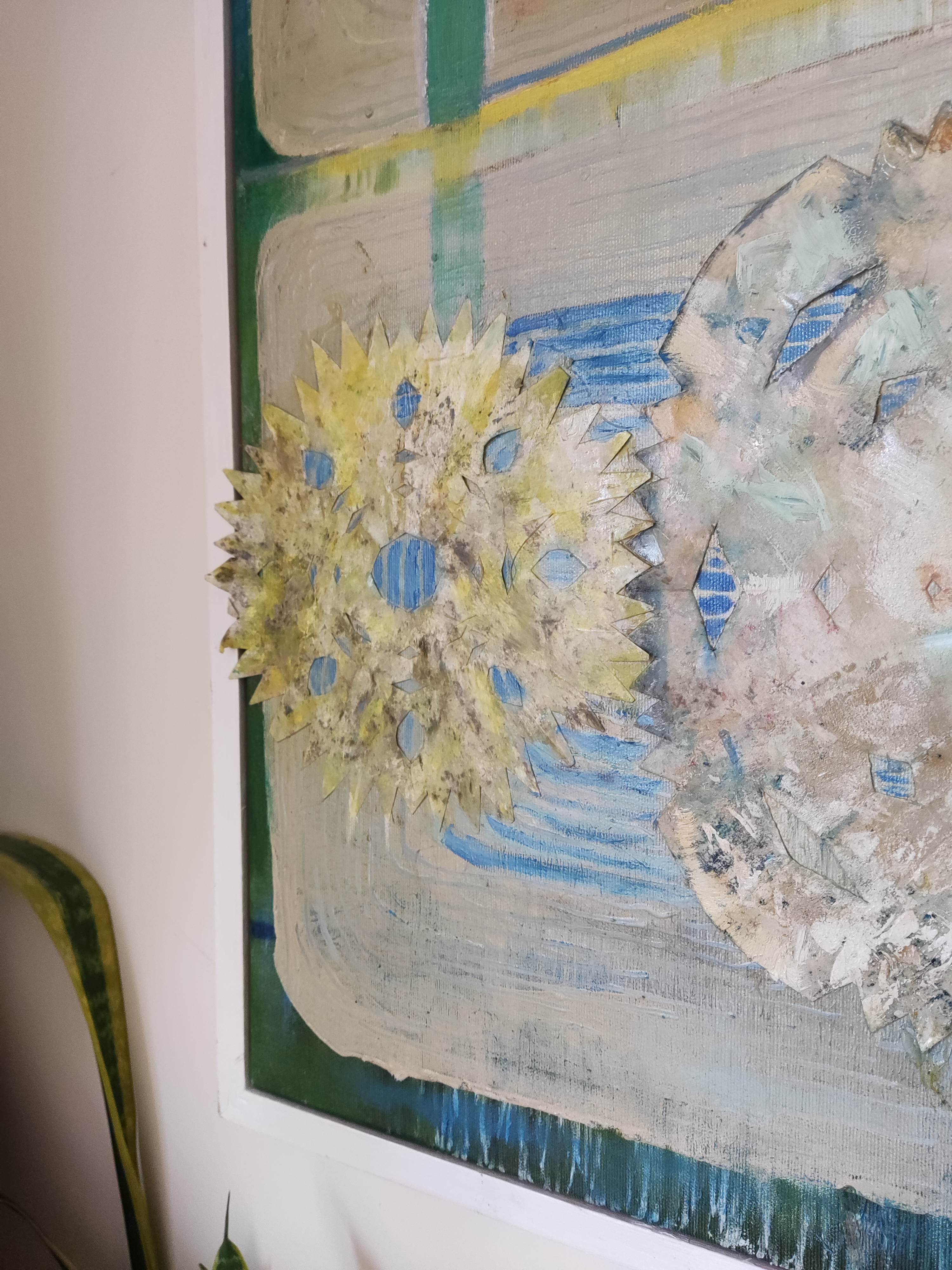 "Odwrócony" to obraz olejny, który wprowadza widza w świat fantazyjnego pejzażu, pełnego subtelnych odniesień do łowickiej wycinanki i tradycyjnego pejzażu łowickiego. Dzieło jest utrzymane w pastelowych barwach, z dominującymi zgaszonymi odcieniami błękitów i żółci, co nadaje mu delikatności i spokoju. Centralnym elementem obrazu jest horyzont, który przebiega przez środek kompozycji, dzieląc ją na dwie części. Horyzont ten jest jednocześnie granicą, jak i lustrem, w którym odbijają się drzewa uzyskane z wycinanek. Te fantazyjne sylwetki drzew tworzą iluzję symetrii i głębi, a ich odbicia wprowadzają do obrazu element surrealizmu i magii. Odwołania do łowickiej wycinanki są widoczne w stylizowanych kształtach drzew i w ogólnej kompozycji, która nawiązuje do tradycyjnych ludowych motywów. Te elementy łączą się z abstrakcyjnym pejzażem, tworząc harmonijną i oryginalną całość. "Odwrócony" to obraz, który zachwyca swoją delikatnością i głębią. Jest to dzieło, które doskonale wpisuje się w każde wnętrze, dodając mu subtelnego uroku i spokoju. Dzięki swojej pastelowej kolorystyce i unikalnej kompozycji, obraz ten wprowadza do przestrzeni elementy łowickiej tradycji w nowoczesnym, abstrakcyjnym wydaniu. Obraz posiada ramę drewniana pomalowaną na kolor biały. Obraz zabezpieczony jest werniksem przeciwdziałającym blaknięciu kolorów.