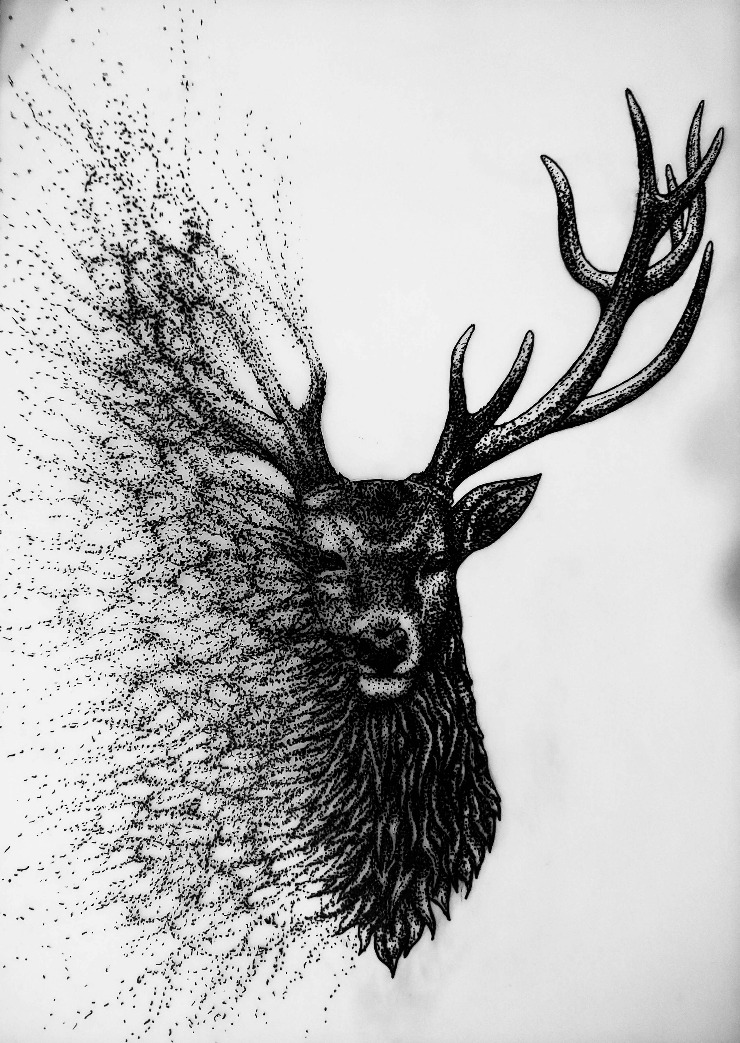 Na obrazie widzimy jelenia, który zdaje się rozpływać w powietrzu. Jego sylwetka zbudowana jest z tysięcy drobnych kropek, które odchodząc na lewo, tworzą wrażenie rozpadu. Dominują tu czerń i biel, które nadają kompozycji wyrazistości i elegancji. Artysta użył techniki pointylizmu, co dodaje obrazowi dynamiki i delikatności. Jest w tym coś hipnotyzującego, prawda? Dzieło emanuje spokojem, ale i pewnym niepokojem, jakbyśmy byli świadkami momentu przemiany. To taki "wow moment", kiedy natura łączy się z abstrakcją. Styl jest wyjątkowy: minimalistyczny a jednocześnie pełen szczegółów, co sprawia, że trudno oderwać wzrok. Podziwiając tę grafikę, można poczuć nostalgiczny powiew ulotności. Kropki przypominają o przemijaniu, prowokując do refleksji nad kruchością życia. Jak to jest, że coś tak prostego może być jednocześnie tak głębokie? Głowa jelenia patrzy na nas ze spokojem, wywołując uczucie melancholii i zadumy. Czy to symbol natury, która wciąż umyka naszej kontroli? Jako dziecko powiem, to taki jeleń z magii! Ale poważnie, niesamowicie piękny. Może nawet trochę smutny, kiedy się go ogląda dłużej. Fascynujący w swojej abstrakcyjnej formie, zaskakuje swoją głębią i kreatywnością wykonania. Coś wspaniałego, a jednocześnie do przemyślenia. Truly remarkable.