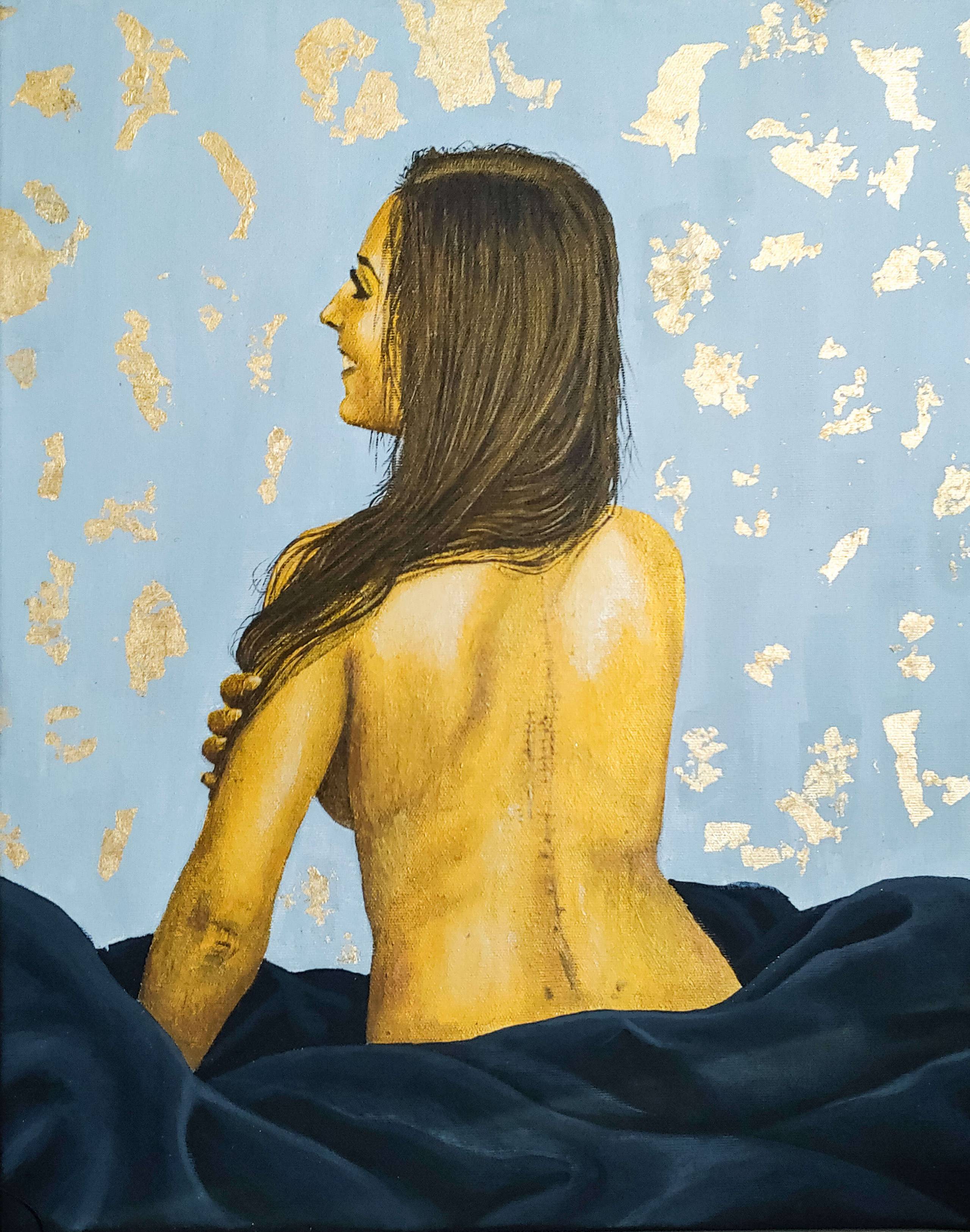 Obraz przedstawia kobietę siedzącą tyłem, owiniętą w ciemny materiał . Jej skóra jest błyszcząca, a złociste refleksy dodają blasku całej kompozycji . Tło jest delikatnie niebieskie, posypane złotymi liśćmi, które wyglądają jak płatki kwiatów niesione przez wiatr. Klimat tego dzieła jest subtelny i pełen spokoju, jakby czas zatrzymał się na chwilę tylko po to, by pozwolić nam podziwiać piękno chwili. Artysta wykorzystał techniki malarskie, które łączą realizm z delikatnymi akcentami dekoracyjnymi. Uczuciem, które emanuje z tego obrazu, jest ciepło i refleksja nad ludzką naturą. Może skłaniać do zadumy nad prostotą piękna, które często ukrywa się w codzienności. Czuję, że patrzę na fragment momentu, intymną chwilę, która została uchwycona z wielkim wyczuciem. Ciekawe, jak jedna scena potrafi wywołać tak wiele myśli. Gdyby siedmioletnie dziecko spojrzało na ten obraz, mogłoby powiedzieć: "Ona wygląda jak księżniczka!". Wzrok odbiorcy błądzi po płótnie, odnajdując spokój i harmonię. Wow, jak sztuka potrafi mówić do serca!