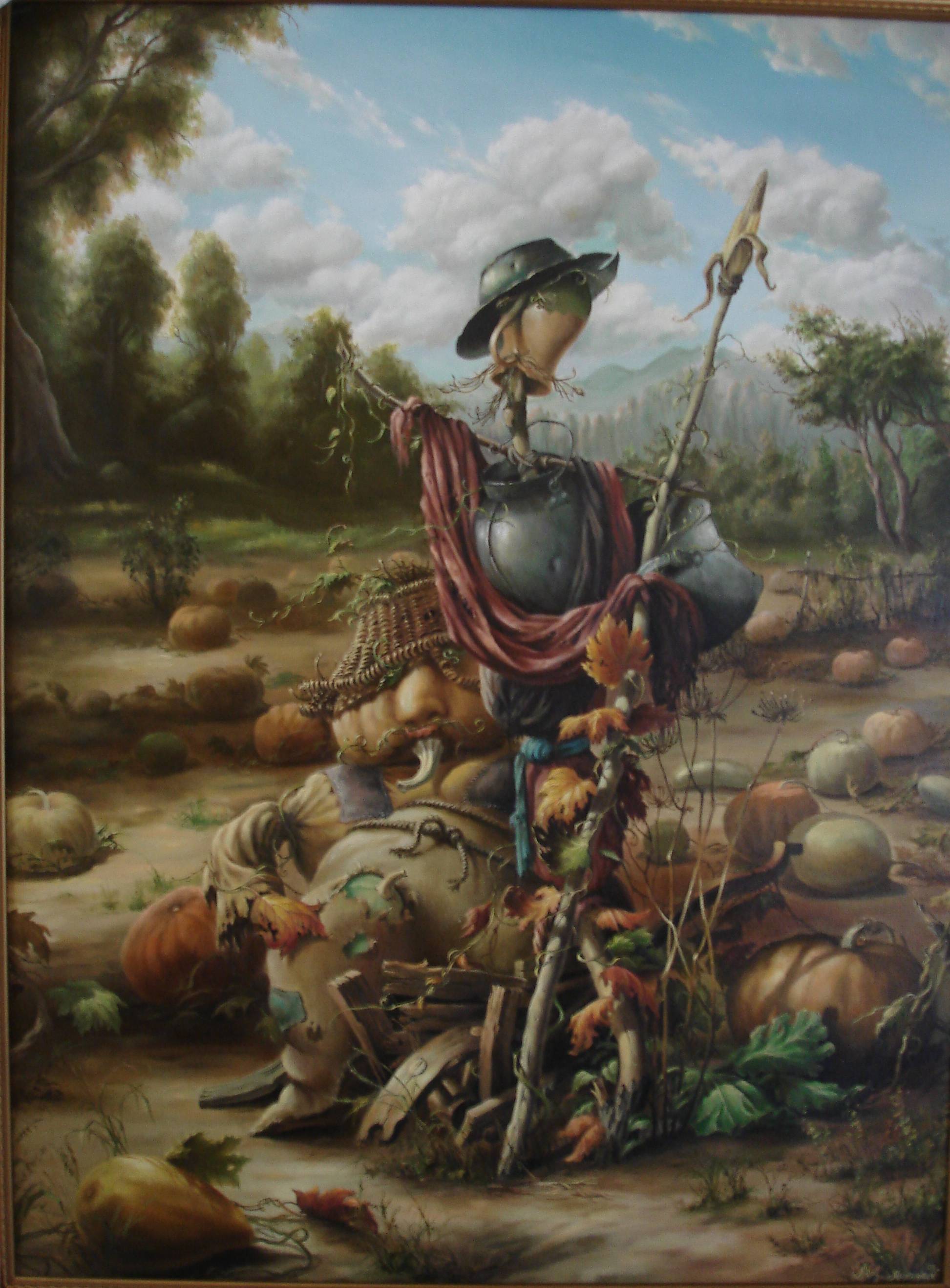 Овощи и предметы напоминают сторожей (пугало) на фоне спокойного пейзажа.