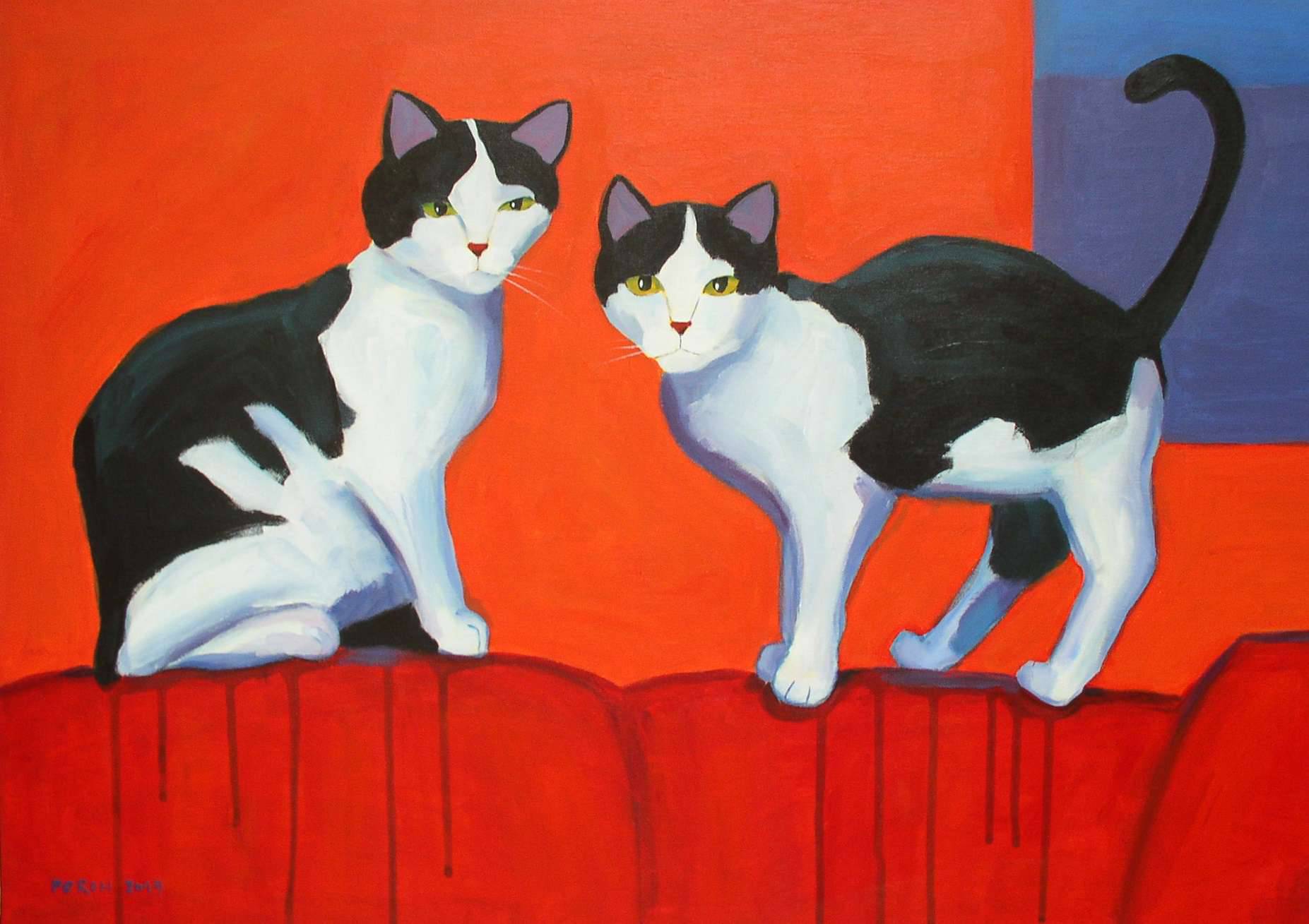 Na obrazie widzimy dwa urocze koty, które siedzą na czerwonej kanapie, na tle intensywnego, pomarańczowego tła. Ich sierść jest czarno-biała, co tworzy kontrast z abstrakcyjnym, prostolinijnym otoczeniem, które dopełnia chłodny, niebieski prostokąt w rogu. Kompozycja przywodzi na myśl spontaniczność i przyjemną niedbałość, a kolory na obrazie cieszą oko swoim nasyconym tonem. Koty patrzą na nas z lekkim zainteresowaniem, a ich wyprostowane sylwetki sugerują dynamikę i alertność. Obraz emanuje pogodnym i radosnym nastrojem, jakby czas się zatrzymał w tym momencie. Artysta posługuje się techniką płaskiej plamy barwnej, nadając kształtom prostotę i wyraz. Jest coś magicznego w tym właśnie "simplistic charm", który pozwala odbiorcy skupić się na emocjach przedstawionych zwierząt. To wyjątkowe wykorzystanie kolorów i linii buduje atmosferę spokoju i beztroski, idealną dla refleksji. Każdy, kto spojrzy na te koty, może poczuć wręcz dziecięcą radość – ja też chce takiego kotka! Uwielbiam ich ciekawskie spojrzenia i nieskomplikowaną elegancję. Obraz zachęca do zatrzymania się na chwilę i zanurzenia w codzienności pełnej uroku i prostych przyjemności.