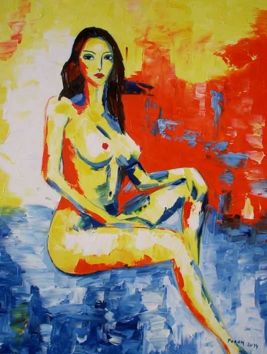 Na obrazie widzimy kobietę o wyrazistych konturach, siedzącą w samotnej pozie. Jej ciało skąpane jest w intensywnych barwach — jaskrawa żółć, czerwień i niebieski dominują na płótnie. Wyraziste pociągnięcia pędzla tworzą dynamiczną strukturę, a kontrastujące kolory zdają się ożywać. Atmosfera dzieła przypomina tętniący życiem chaos, gdzie emocje są niemal namacalne. Technika, jaką zastosował artysta, to impast, który nadaje obrazowi trójwymiarowości i głębii. Obraz jest intrygujący, zmusza do zastanowienia, może wzbudzać zarówno zachwyt, jak i niepokój. Patrzysz na te kolory i myślisz: wow, ale ekspresja! Styl przypomina nieco eksperymentalne podejście fowistów, intencjonalnie rezygnując z realistycznych odwzorowań na rzecz emocji. Patrząc na tę kobietę, można poczuć jej pewność siebie. Może to jest, co artysta chciał przekazać — siłę w byciu sobą. A ja myślę, że wygląda trochę jak superbohater z kreskówki. Jest w niej coś magnetycznego, coś, co przyciąga i nie pozwala odwrócić wzroku. To jeden z tych obrazów, które potrafią mówić głośniej niż tysiące słów. True art.