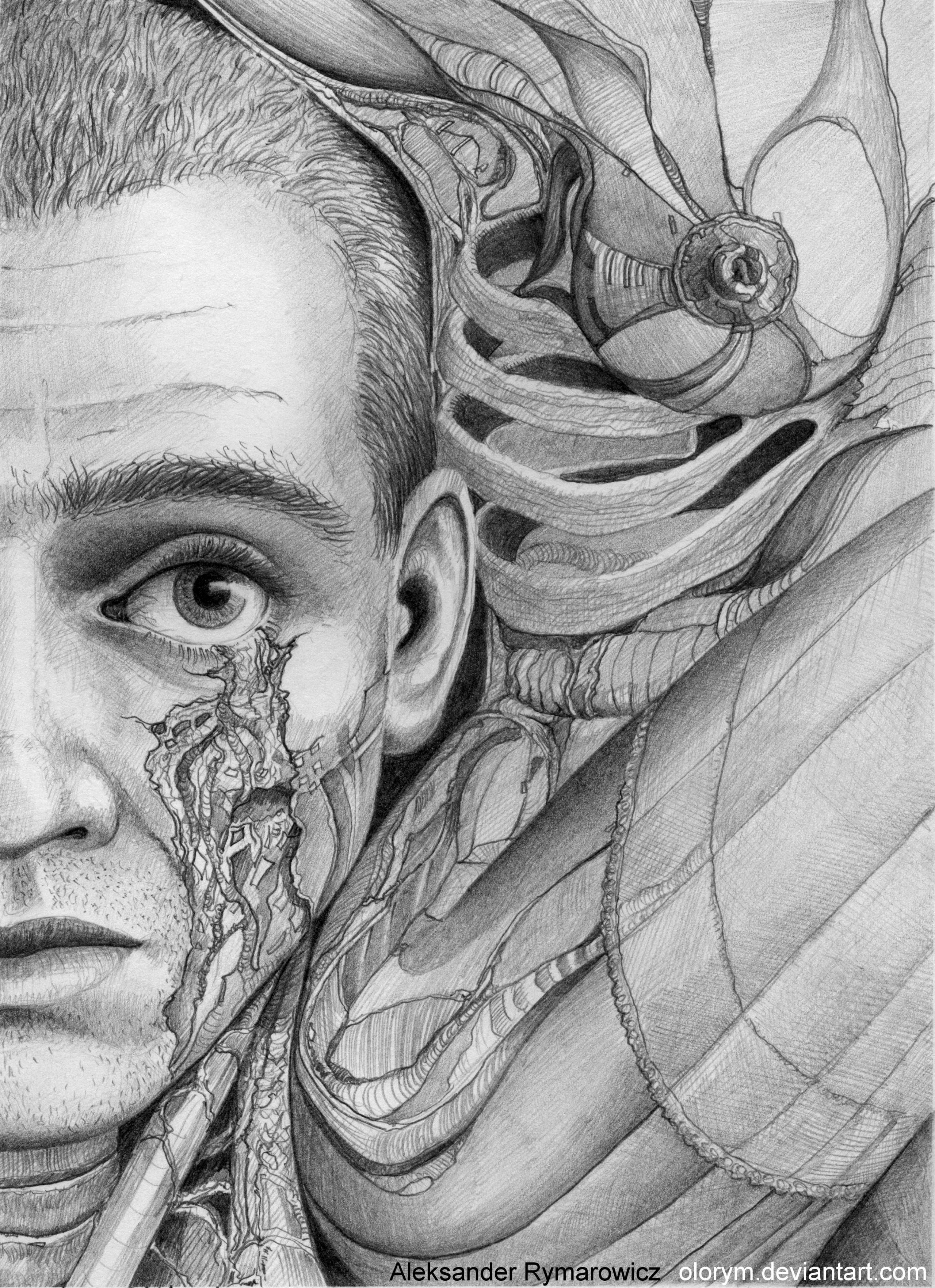 Na obrazie widzimy tajemniczy, niemal surrealistyczny portret. Po lewej stronie dominuje pół twarzy człowieka, a szczególnie przykuwa oko jego intensywne, pełne emocji spojrzenie. Skóra wydaje się jakby lekko odsłaniała wnętrze, ukazując splątane, organiczne struktury. Kolorystyka utrzymana jest w czerni i bieli, co dodaje całości dramatyzmu i głębi. Struktury te układają się w harmonijną, choć niepokojącą kompozycję, której chaos tworzy kontrast z realistycznym odwzorowaniem twarzy. Wow, wygląda jakby ten pan był zrobiony z dziwnych rurek! Atmosfera obrazu jest dość niepokojąca, a jednocześnie intrygująca. Artysta zadbał o każdy detal za pomocą misternych, precyzyjnych linii. Technika rysunku ołówkiem doskonale oddaje tekstury i cienie, tworząc efekt 3D. Patrząc na ten obraz, można poczuć się zaniepokojonym, ale i zafascynowanym. Brak koloru zmusza oglądającego do skupienia się na formie i detalu. To "mystery" kryje coś za sobą. Prowokuje do refleksji nad ludzką naturą i kruchością naszej fizycznej egzystencji.