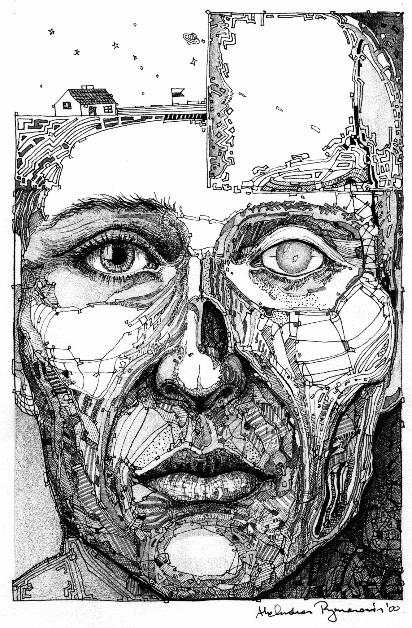 Obraz prezentuje twarz, której kontury składają się z misternych linii i geometrycznych kształtów. Dominuje czarno-biała kolorystyka, która nadaje kompozycji surowości i tajemniczości. Twarz została podzielona na segmenty, ukazując intrygujące, mozaikowe wzory. W górnym rogu dostrzec można wyłaniający się domek i gwiazdy, które dodają surrealistycznego uroku i przenoszą w świat sennych marzeń. Atmosfera obrazu jest spokojna, lecz jednocześnie pełna niesamowitej energii. Styl artysty przypomina nieco graffiti z domieszką komiksowego charakteru. Technika wydaje się być precyzyjna, jakby każde pociągnięcie pióra było dokładnie przemyślane. "Ten obraz jest jak sen o gwiazdach i skomplikowanych labiryntach", mogłoby powiedzieć dziecko. Emocje mogą być mieszane. Z jednej strony fascynacja szczegółami, z drugiej lekkie zaniepokojenie, gdy widzimy te surowe rysy. Dla mnie to jak podróż w kosmos, gdzie spotykam tajemniczą postać z innego świata. One word: enigmatic. Im dłużej patrzę na ten obraz, tym więcej odkrywam. To niczym medytacja nad kalejdoskopem myśli i emocji. Czy artysta chciał nam coś powiedzieć, czy to tylko gra wyobraźni?