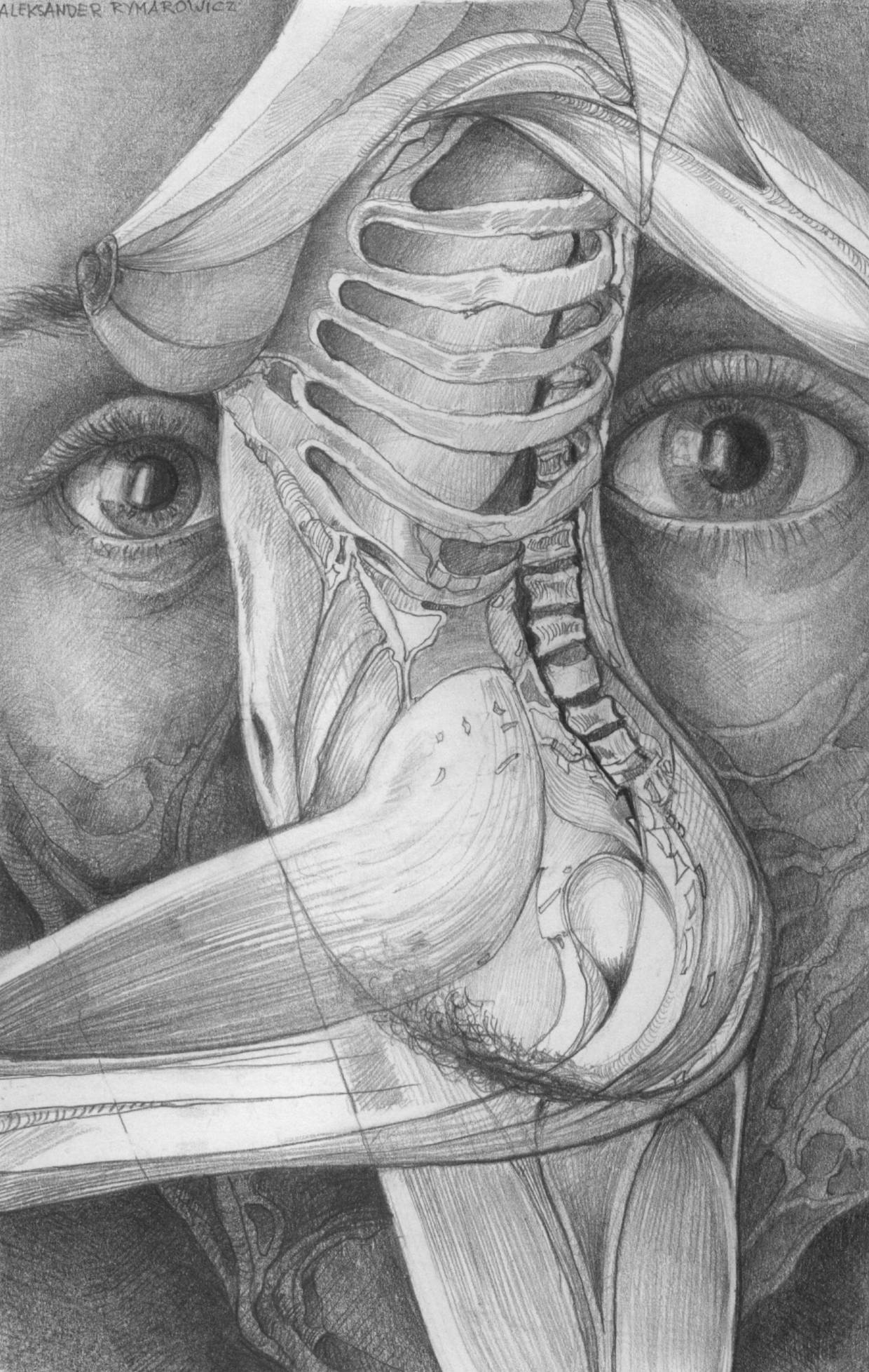 Na przedstawionym obrazie dominuje tajemnicza, niemal surrealistyczna kompozycja. Oczy jak wyłaniające się z głębokiego mroku są tłem dla anatomicznych form przypominających fragmenty ludzkiego szkieletu. Kreska artysty jest precyzyjna, niemal jak żyletka. Cienie delikatnie przechodzą w światła, tworząc dynamiczną grę kontrastów. Całość jest utrzymana w odcieniach szarości, co nadaje dziełu chłodny, ale zarazem intrygujący klimat. Gdy patrzę na ten obraz, czuję się jak wciągnięta w głęboką opowieść, w której elementy ludzkie mieszają się z abstrakcją. To tak, jakby sztuka ożywała na moich oczach. Artysta stosuje techniki mieszania perspektyw, co tworzy efekt trójwymiarowości i sprawia, że widz staje się częścią sceny. Wow, to tak jakbym widział coś z X-ray vision! Emocje, które to dzieło wywołuje, mogą być różne. Może to być zdziwienie, fascynacja, a nawet lekki niepokój. Jakby ktoś obejmował tajemnice życia i śmierci w jednym obrazie. Dzieło jest złożone, zmuszające do myślenia i otwierające drzwi do refleksji nad kruchością ludzkiego ciała. Czuję, jakbym był w środku prawdziwego laboratorium sztuki i nauki.