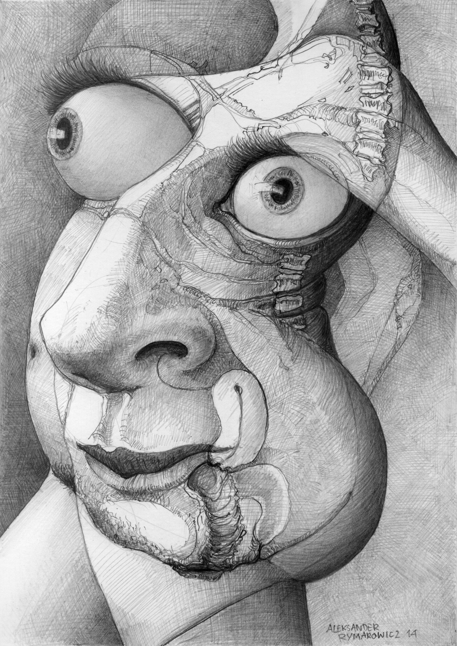 Na obrazie dominuje surrealistyczny portret przedstawiający twarz pełną niezwykłych zniekształceń. Dominują odcienie szarości, które tworzą nieco mroczną, ale i fascynującą atmosferę. Duże, wybałuszone oko zdaje się przykuwać uwagę. Jest jakby wyjęte z innego świata, które przygląda się naszej rzeczywistości z dystansem. Krateczkowe i cienko zarysowane linie tworzą pociągnięcia cieni, nadając twarzy fakturę prawdziwego rysunku. Wyraz twarzy wydaje się złożony, być może wyrażając zagubienie, a nawet odrobinę grozy. Hej, to wygląda jak kosmita! Artystyczny styl jest wyraźnie ekspresyjny, przywodzący na myśl prace mistrzów surrealizmu. Technika opiera się na szczegółowym kreskowaniu, które daje wrażenie ruchu i dynamizmu. Zupełnie jakby twarz miała za chwilę ożyć. Obecność szczegółów, takich jak widoczna struktura skóry i przerysowane formy, prowokuje do refleksji o naturze ludzkiej percepcji. Czuć w tym pewną niespodziewaną i nieokreśloną "weirdness", która może budzić mieszane uczucia. Patrząc na to, zastanawiam się nad granicami naszej rzeczywistości. Artysta umiejętnie bawi się formą i emocjami, tworząc dzieło, które jest jednocześnie intrygujące i nieco niepokojące.