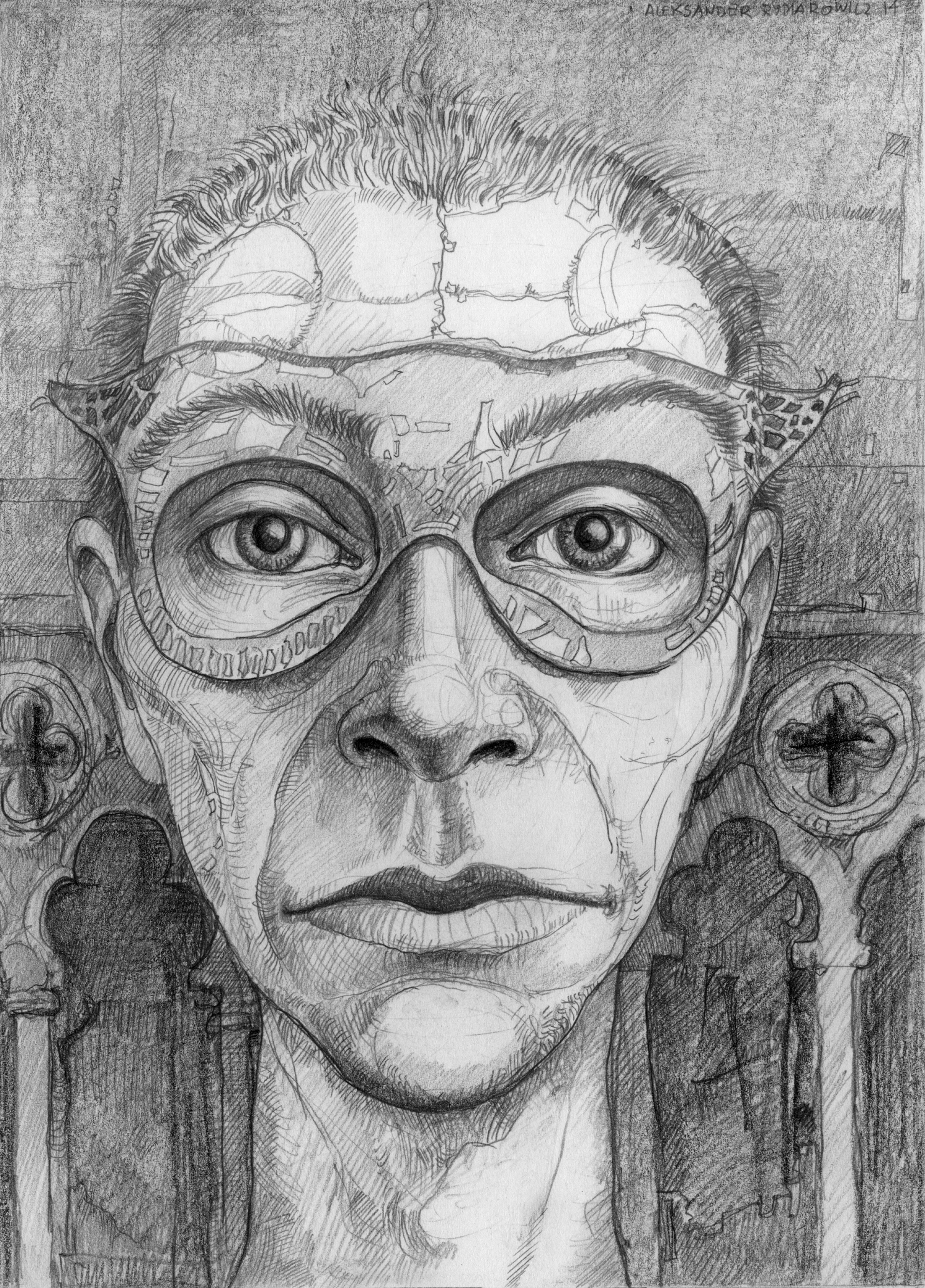 Obraz przedstawia intrygujący portret, w którym dominuje monochromatyczna paleta szarości. Twarz osoby wydaje się niemal wtopiona w tło, gdzie struktury architektoniczne dodają głębi i tajemnicy. Artysta posłużył się techniką ołówkową, co nadaje rysunkowi surowy, ale precyzyjny charakter. Uwagę przykuwają oczy, które wydają się przepełnione emocjami - może troską albo zamyśleniem. Włosy są w nieładzie, jakby ktoś niedawno przeszedł przez burzę. Wszystko jest bardzo szczegółowo oddane, od delikatnych cieni po wyraziste linie. Wow, jakie duże oczy! Ich spoglądanie może wywoływać u odbiorcy poczucie niepokoju, ale też pewną fascynację. Detale twarzy zdają się ukazywać historię, nieco nostalgiczną, nieco tajemniczą. To dzieło wydobywa emocje, bawiąc się interpretacją rzeczywistości i refleksją na temat tożsamości. W stylu artysty można dostrzec odwołanie do surrealizmu, co nadaje obrazowi dream-like quality. Całość tworzy niepowtarzalną atmosferę, skłaniając do zastanowienia nad złożonością ludzkich emocji.