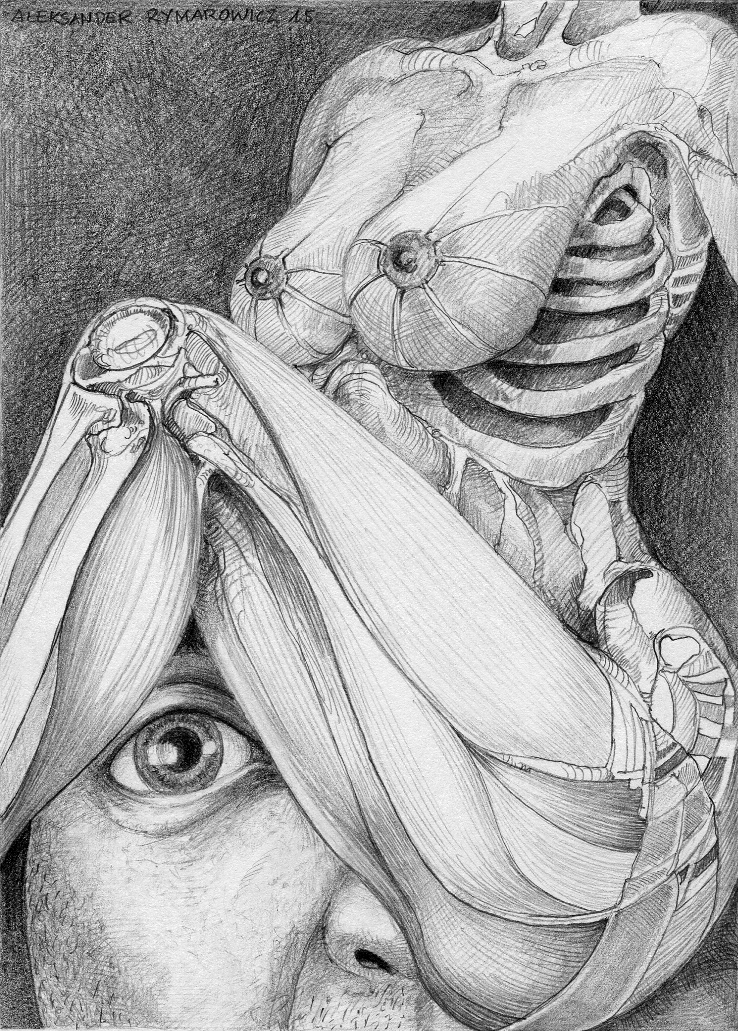 Na obrazie widać szczegółową ilustrację, pełną kontrastujących elementów anatomicznych i surrealistycznych kształtów. Dominuje delikatna gama szarości, a cienka kreska ołówka nadaje pracy surowy, niemal szkicowy charakter. centralną część kompozycji zajmuje twarz z jednym widocznym okiem, nad którą wnosi się nietypowo przedstawione tors. Wyłaniające się warstwy mięśni i kości nadają jej niemal mechaniczne wibracje. Całość emanuje uczuciem dziwnej harmonii, a jednocześnie delikatnego niepokoju. Styl artysty łączy w sobie realizm anatomiczny z nutą abstrakcji. Zadziwiające jest, jak precyzyjnie oddano detale mięśni i kości, które zdają się być zarówno częścią człowieka, jak i maszynerią. To nie lada gratka dla tych, którzy lubią doszukiwać się głębszych sensów. Mówi się, że "the devil is in the details", a tu detale krzyczą o inności. Obraz może wprawić widza w refleksyjny nastrój, skłaniając do przemyśleń o kruchości i złożoności ludzkiej natury. Osobiście zastanawiam się nad granicami między człowiekiem a technologią, które artysta zdaje się badać. To prawdziwe pole do dyskusji dla kogoś, kto szuka więcej niż tylko obrazka na ścianie. Ciekawość i pewne napięcie wiszą w powietrzu, a jednocześnie całość wydaje się ujarzmiona w swojej nietypowości.