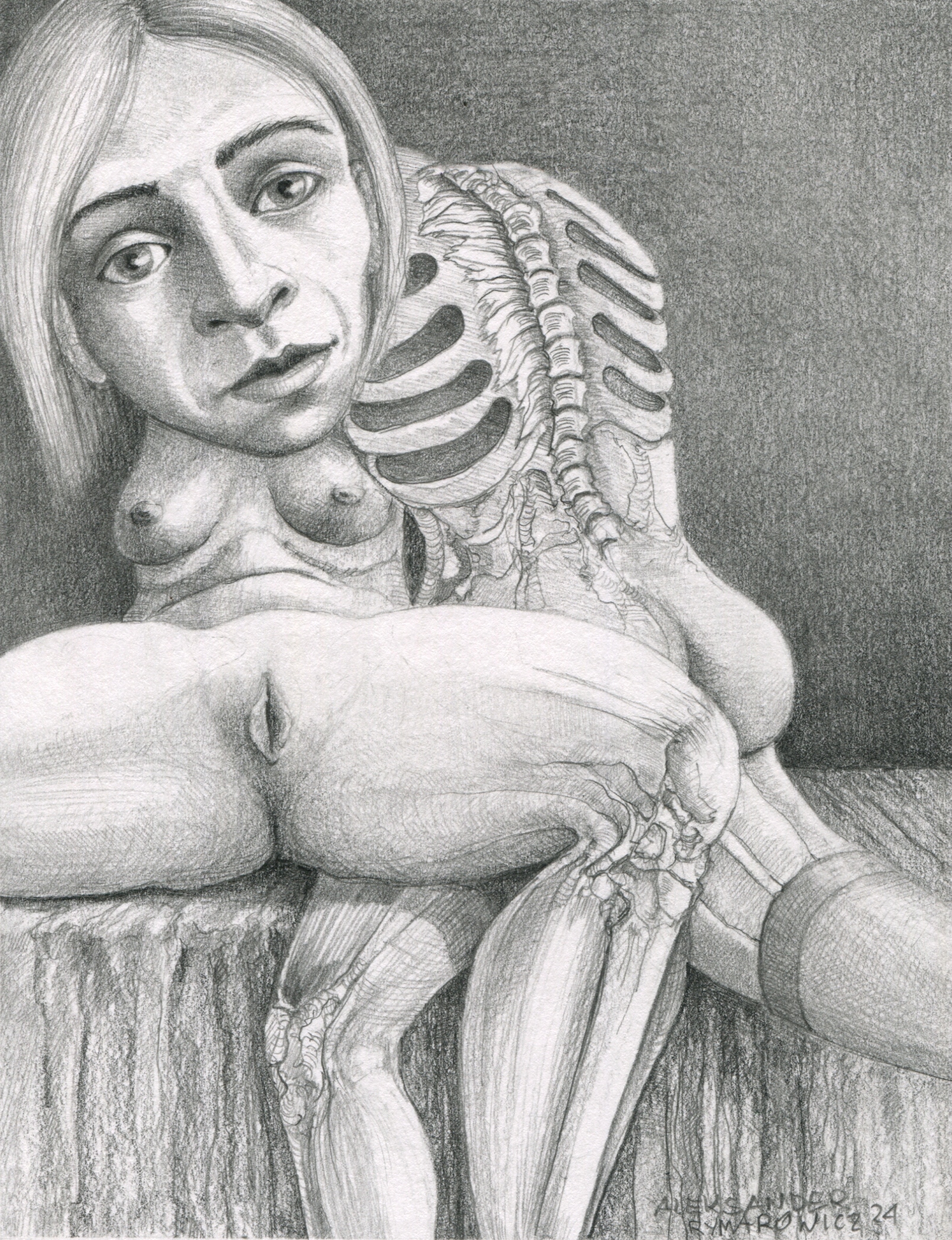 Obraz ukazuje niezwykle intrygujące połączenie ludzkich form i szkieletowej struktury, zachowując monochromatyczną paletę pełną odcieni szarości. Każdy detal jest starannie wyrysowany, co nadaje całości zaskakującą głębię i realność. Wyraz twarzy postaci, z dużymi, przejmującymi oczami, budzi ciekawość i może nawet lekką melancholię. Atmosfera obrazu oscyluje między niepokojem a fascynacją. Czuje się jakiś rodzaj introspekcji, zatrzymania w czasie. Czuć, że autor używał ołówka z niezwykłą precyzją, być może inspirując się klasycznym szkicem anatomicznym, ale dodając twist współczesnej wrażliwości. To dzieło wywołuje w odbiorcy różne emocje. Jedni mogą czuć niepokój, inni fascynację nad możliwością ukazania tak złożonej formy w tak prostym medium. Moim zdaniem, artysta chce, byśmy zastanowili się nad kruchością życia i pięknem ukrytym pod powierzchnią. Czuję jakiś rodzaj unity, jakby to wszystko było częścią większej całości. "Why is it like this?" – pyta mały głos w mojej głowie, jak dziecko zaglądające do zakazanej szuflady. Każda krecha jest celowo asymetryczna, a jednak misternie zintegrowana w kompozycji. Obraz łączy w sobie surowość rysunku i bogactwo emocji, co sprawia, że nie sposób oderwać od niego wzroku.