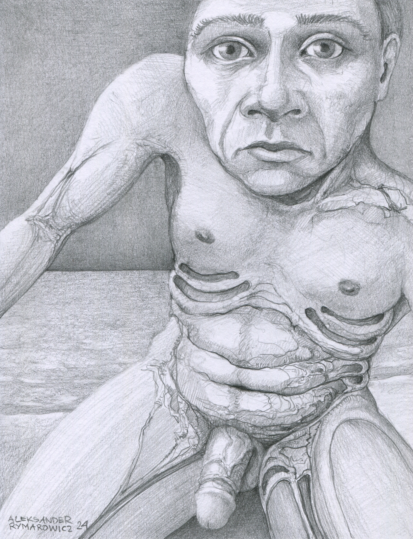 Na tym intrygującym obrazie, wykonanym ołówkiem, widać postać w niezwykle szczegółowej i surowej formie. Dominuje szarość, a cienie dodają kompozycji głębi. Linie są precyzyjne, a kształty – realistyczne, ze szczególnym naciskiem na wyraz twarzy i muskularne detale ciała. Całość emanuje dość niepokojącą atmosferą. Wygląda, jakby artysta chciał uchwycić kruchość ludzkiego ciała i zagubienie emocjonalne. Tekstura obrazu, mimo że realistyczna, sprawia, że patrząc na niego, odczuwamy pewien surrealizm. Technika rysunku pozwala dostrzec ogrom emocji, jak zaniepokojenie czy melancholia. Czy to zmęczenie, czy głęboka refleksja? Obraz wywołuje skrajne emocje – od niepokoju po fascynację. Patrząc na to dzieło, można poczuć delikatne ciarki przebiegające po skórze. W końcu, to tylko grafika, a jednak... Podkreślenie detali i surowość wykonania to, well, prawdziwa sztuka, która zmusza do zatrzymania się na chwilę i zastanowienia się nad istotą bycia człowiekiem w całej swojej złożoności.