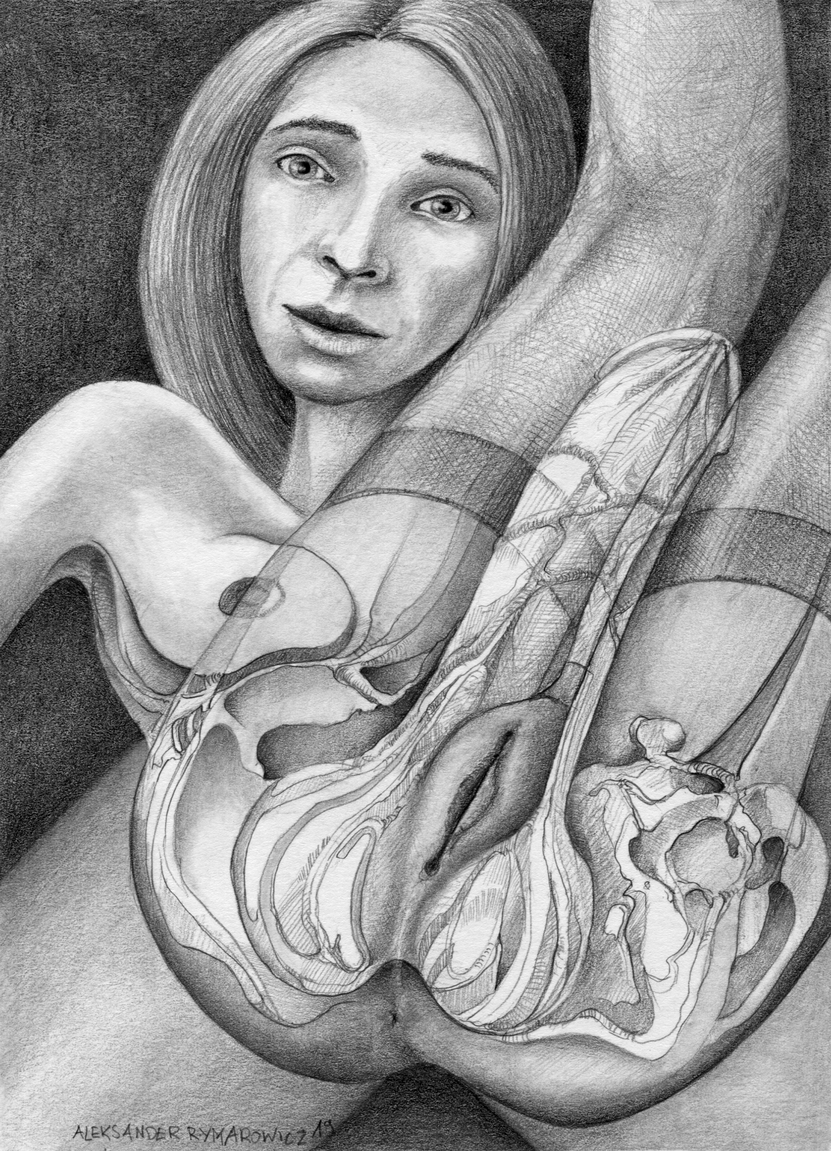 Obraz jest intrygującym połączeniem realizmu i abstrakcji, rysowany w skali szarości, co nadaje mu pewnej surowości. Twarz ukazana w górnej części jest pełna wyrazu, z delikatnymi cieniami podkreślającymi jej rysy. Dominuje szarość w różnych odcieniach, co sprawia, że inne elementy kompozycji wyróżniają się bardziej. Ukazane poniżej formy przypominają nieco anatomijne szkice, przyciągając wzrok szczegółowością i precyzją. Atmosfera jest dziwna, niemal transowa. Technika rysunkowa, z silnymi kontrastami światłocienia, dodaje dramatyzmu. Można poczuć coś jakby dziwne połączenie fascynacji i niepokoju, równocześnie. Czy to sen, czy jawa? To pytanie, które może pojawić się w głowie obserwatora. Obraz wymaga chwilowego zatrzymania się, refleksji. Styl artystyczny jest unikalny i odważny. Artysta posługuje się techniką przekroju, co może przypominać o medycznych ilustracjach, ale z artystycznym twistem. Wow, such an intriguing piece! Można poczuć, jak coś w sercu drga z ciekawości.