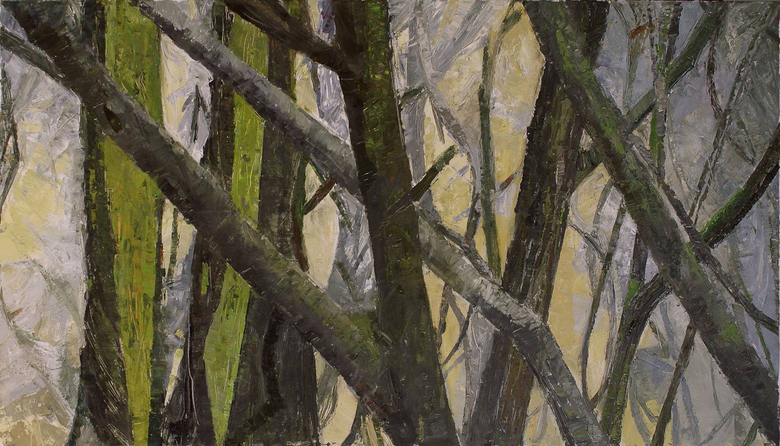 Obraz przedstawia splątany labirynt gałęzi, które wznoszą się i przeplatają na tle delikatnego światła. Dominują zielenie, brązy i szarości, nadając kompozycji głębokość oraz tajemniczość. Drzewa wydają się tworzyć gęstą sieć, która wciąga widza w swoją organiczną dynamikę. Atmosfera emanująca z obrazu jest jednocześnie spokojna i zagadkowa – jakby zapraszjąca do odkrywania ukrytych ścieżek w lesie. Artysta zastosował grube, niemal rzeźbiarskie pociągnięcia pędzla, które dodają teksturze materii. Technika impasto uwydatnia fakturę kory, a rozmazane kontury sugerują ruch i życie. Obraz może wywołać różnorodne emocje. Może przypominać o spacerach po lesie, gdy słońce tańczy między liśćmi. Dla kogoś innego może być obrazem chaosu i nieprzewidywalności natury. I widzisz, czasem sztuka to magic. Jakby 7-letnie dziecko uznało to za ogromny domek dla wróżek. To dzieło wydaje się być manifestem siły i piękna natury, zachęcając widza do refleksji nad własnym miejscem w tym złożonym świecie. Wciąga i zatrzymuje na chwilę, pozwalając poczuć zapach wilgotnego lasu i usłyszeć szelest liści.