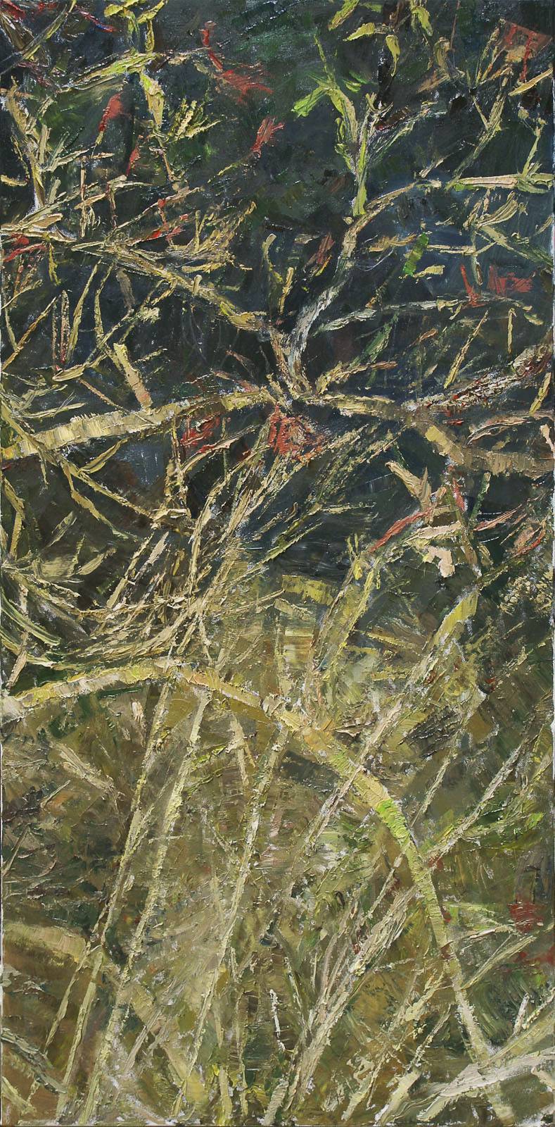 Na obrazie dominuje dzikość i chaos natury. Splątane gałęzie, pełne zieleni i brązowych akcentów, tworzą sieć, która niemalże hipnotyzuje swoją złożonością. Przemykają pomiędzy nimi ciepłe odcienie czerwieni i złota, dodając całości ruchu i dynamiki. Kompozycja jest organiczna i chaotyczna, jakby artysta próbował uchwycić moment w lesie, który na zawsze pozostanie tylko dla niego. Pociągnięcia pędzla są ekspresyjne, jakby malarz chciał zamknąć energię w każdym ruchu. Atmosfera tego dzieła jest nieco tajemnicza. Można poczuć lekki powiew wiatru między gałęziami. Styl artystyczny przywodzi na myśl śmiałość i spontaniczność, co wprowadza odbiorcę w stan zadumy. Czujemy się jakbyśmy znaleźli się w środku tej leśnej gęstwiny, gdzie każde spojrzenie odkrywa coś nowego. Obraz może wywoływać różne emocje; od lekkiego zamyślenia po fascynację pięknem natury. "Wow, jak w dżungli," mogłoby powiedzieć dziecko, wskazując na obraz. Jest w tym dziele coś magicznego, co przyciąga. To uczucie, jakby artysta uchwycił chwilę pomiędzy porami roku. Ten "mystery" w obrazie fascynuje i zachęca do zadawania pytań, zostawiając widza z poczuciem, że widzi coś więcej, niż tylko mieszankę kolorów i kształtów.