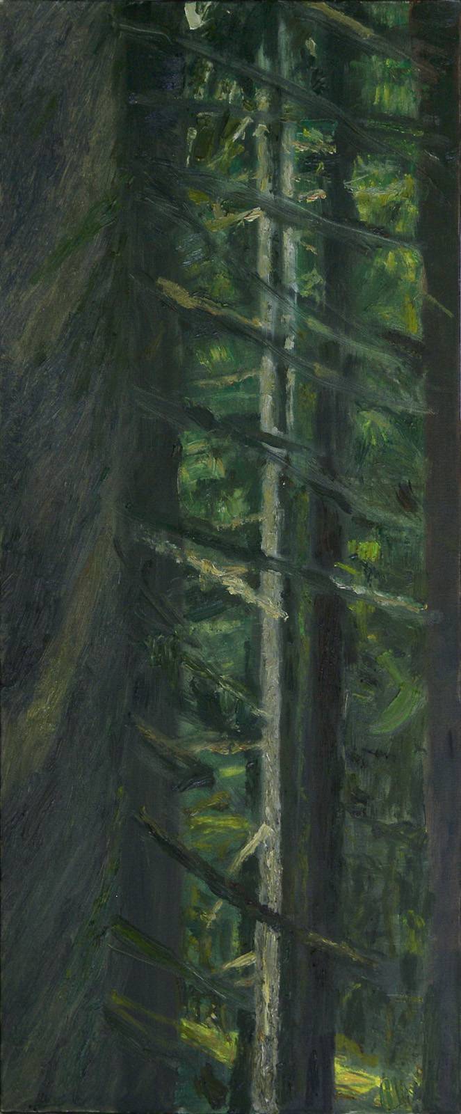 Obraz przedstawia gęsty, tajemniczy las, w którym dominują ciemne zielenie i brązy. Drzewa pną się w górę, ich pnie kreślą pionowe linie, tworząc swoistą siatkę światła i cienia. Gałęzie rozciągają się na boki, wyglądają jakby chciały otulić widza delikatnym uściskiem. Gdzieś między gałęziami przebija się subtelne światło, tworząc aurę sekretnych miejsc, gdzie czas płynie inaczej. Czuje się tu spokój i jednocześnie niepokój, jakby każda gałąź kryła opowieść. Artysta zastosował technikę impasto, kładąc farbę grubymi pociągnięciami pędzla. Dzięki temu faktura obrazu zdaje się trójwymiarowa, a sam krajobraz tętni życiem. W tym wszystkim można się zgubić, zatracając się w chwilowym kontemplacyjnym zawieszeniu. Wow, aż chce się tam wejść! Odbiorca może poczuć nostalgię za utraconym światem natury, a może i dziecięcą ciekawość, co kryje się za tymi gałęziami. Przypomina to trochę magiczny secret garden — zakątek, do którego możemy wkroczyć tylko w snach lub na płótnie. Kolory, choć ciemne, mają w sobie ukrytą energię, coś jak „hidden gem”, które czeka, by je odkryć. I teraz myślę, jak dobrze byłoby tam być, po prostu być i słuchać szumu drzew.