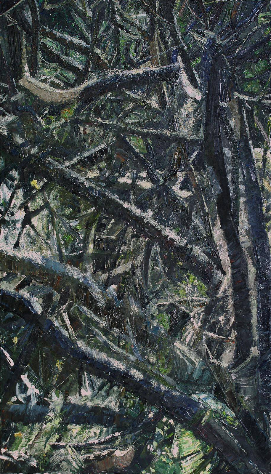 Obraz ukazuje gęstwę splątanych gałęzi, gdzie ciemne odcienie zieleni i brązu tworzą tajemniczy, niemal mistyczny nastrój. Światło migocze przez liście, dodając całości dynamiki i głębi. Kompozycja na pierwszy rzut oka wydaje się chaotyczna, ale im dłużej się w nią wpatrujemy, tym bardziej dostrzegamy ten przemyślany rytm natury. Technika, którą posłużył się artysta, to dynamiczna gra pociągłymi, teksturowanymi pociągnięciami pędzla, które sprawiają wrażenie ruchu, jakby wiatr poruszał konarami drzew. Nastrój dzieła jest z jednej strony przytłaczający, z drugiej – niezwykle intrygujący. Wywołuje uczucie zaszycia się w gęstwinie lasu, gdzie czas zanikł. Można poczuć echo przygody, niemal jak w "The Secret Garden". Myśli przemykają niczym leśne zwierzęta. Chciałoby się wejść do tej puszczy, zasłyszeć jej sekrety. Patrząc na obraz, można poczuć się jak odkrywca – wejdź i odkryj, co kryje się dalej.