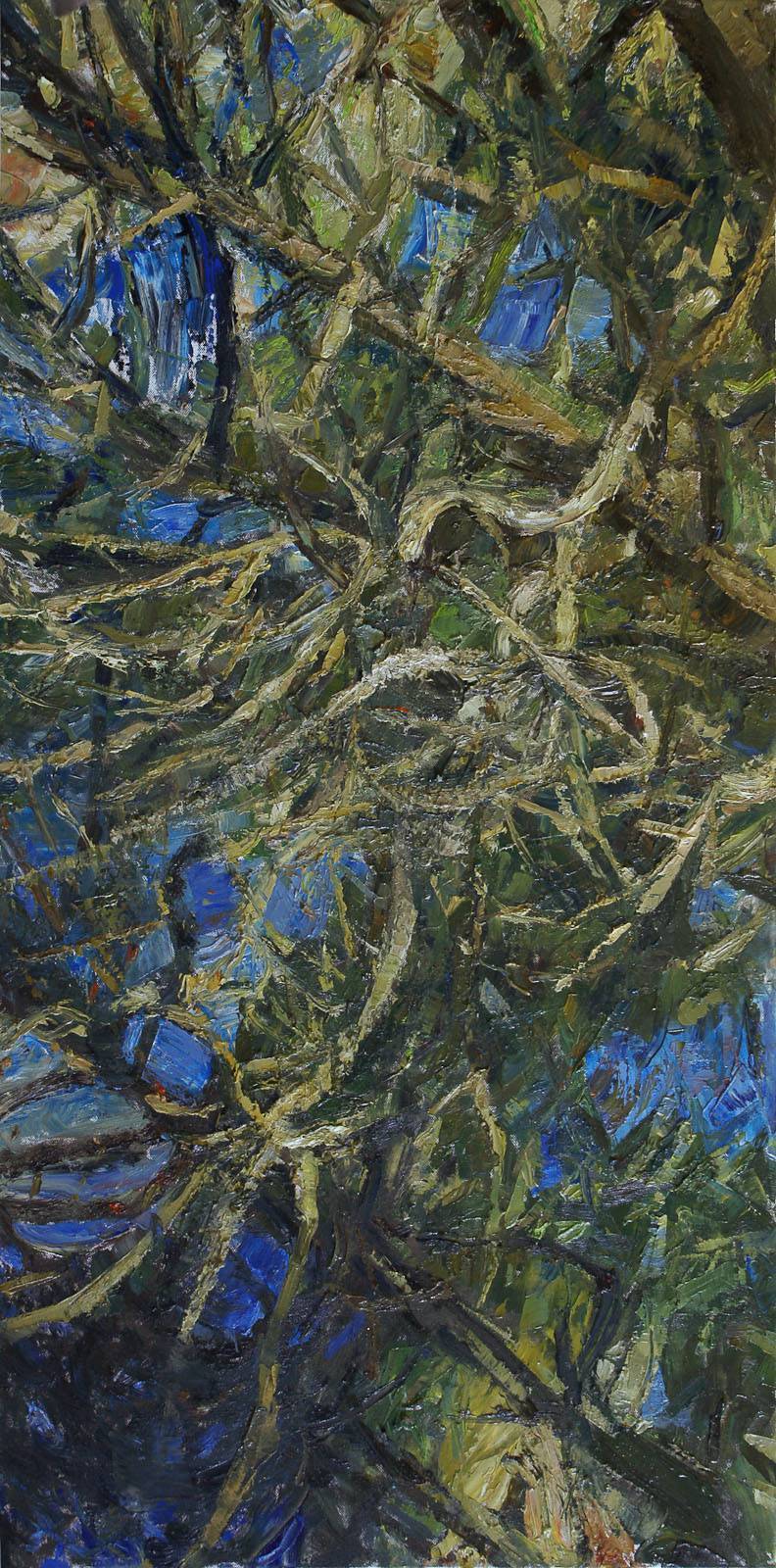 Obraz zatopiony w kalejdoskopie zielonych i niebieskich barw, tworzy niebywałe labirynty z plątaniny gałęzi. Linie wiją się chaotycznie, a jednak w tym chaosie kryje się niezwykła harmonia. Artysta z wprawą posłużył się grubymi pociągnięciami pędzla, nadając pracy teksturę, którą chce się wręcz dotknąć. Chaos? Może. Ale taki, który przyciąga wzrok. Atmosfera dzieła tchnie tajemnicą. Czy to las o zmierzchu, czy raczej zakamarki podświadomości? Kto wie. Impresjonistyczny styl, z dynamicznymi i pełnymi energii ruchami, sprawia, że obraz niemal pulsuje życiem. “Wow, ale super mozaika!" - wykrzyknęłoby dziecko. Interpretacje mogą być różnorodne. To dzieło pobudza wyobraźnię, zachęca do snucia historii. Myśli błądzą, czy to sen czy jawa? Trees here seem to whisper secrets. Obraz emanuje pewnym niepokojem, ale jest to niepokój intrygujący, który kusi, by spędzić przy nim więcej czasu.